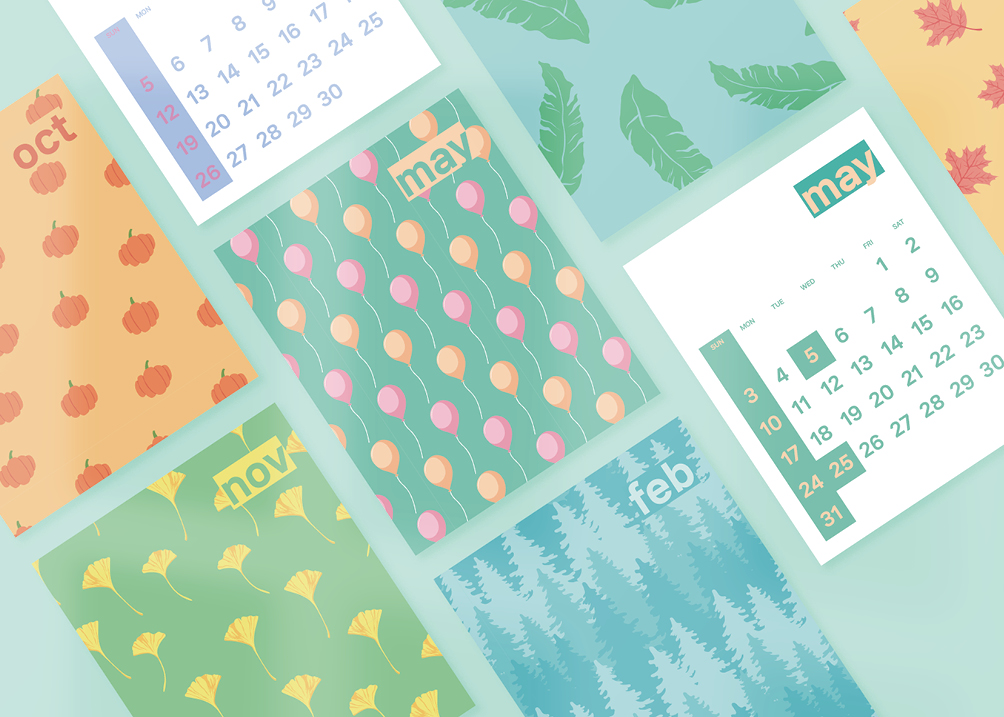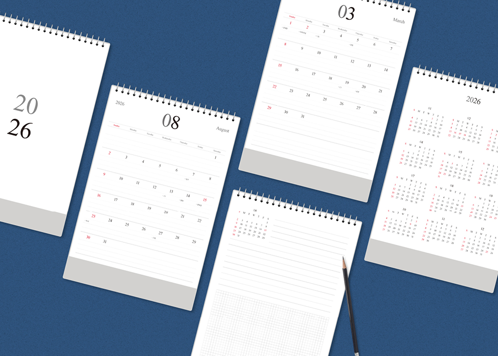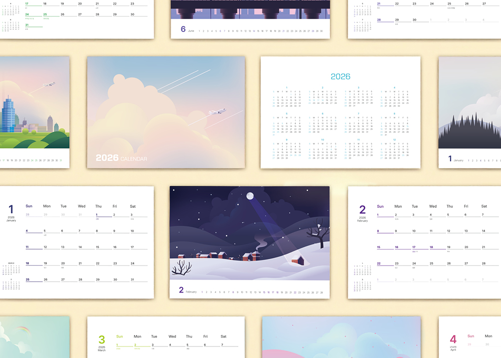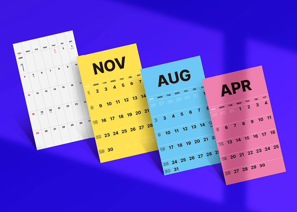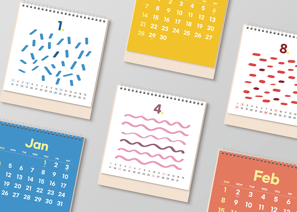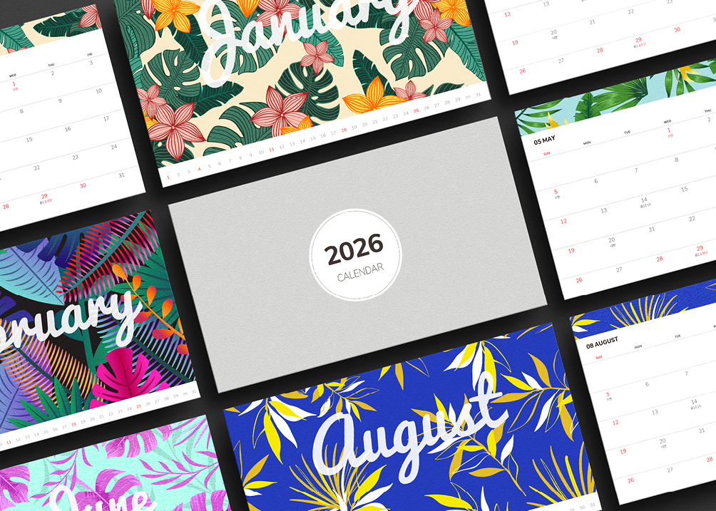 일러스트, 사진, 메모, 앞뒤 숫자, 기하학·패턴으로 주제를 나누어 각 캘린더별 컨셉을 기획한 디자인 템플릿입니다. 업무용부터 브랜드 홍보물까지 다목적 용도에 맞추어 선택 및 변형 할 수 있도록 컬러, 요일, 선, 메모 칸 등으로 변주를 주어 다양한 형태의 레이아웃을 활용하였습니다.