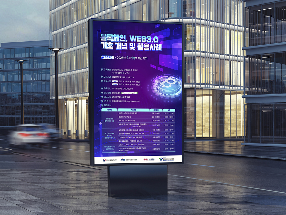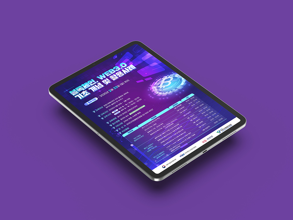 클라이언트 한국디지털융합진흥원 | RGB 기반의 고채도 컬러 팔레트를 활용해 미래지향적이고 기술적인 이미지를 강조했습니다. 디지털 그래픽 요소와 퍼플-블루 계열의 배경은 블록체인과 WEB3.0의 혁신적 개념을 시각적으로 부각시킵니다. 다층 구조의 인터페이스와 빛나는 아이콘은 입체감을 더하며 정보 전달에 몰입감을 높여줍니다. ![]() ![]() |