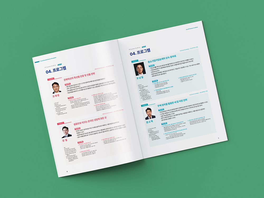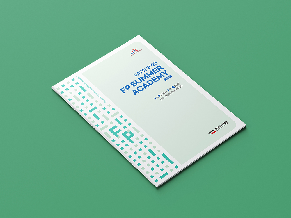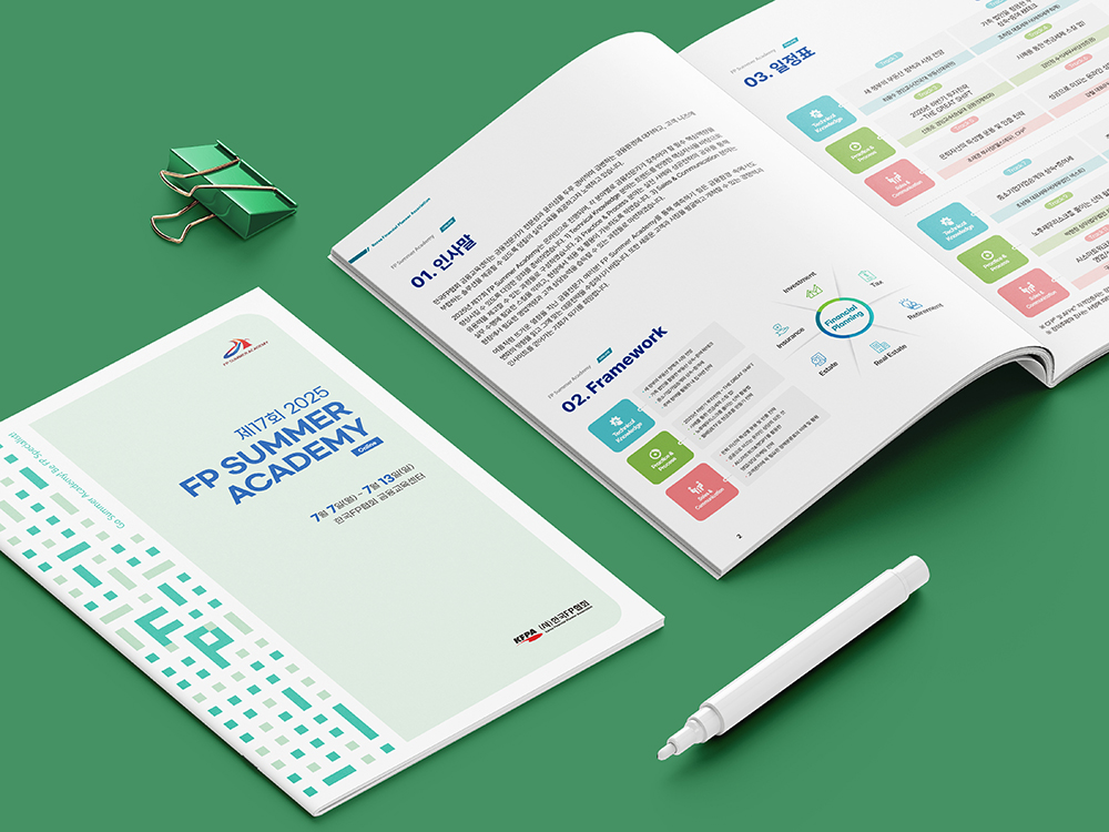클라이언트 한국FP협회 | 여름의 활기찬 분위기를 과하지 않게 담아낸 안내서 디자인입니다. 좌측에는 정사각형, 직사각형, 사명이 어우러진 민트 계열 패턴을 일부 적용하고, 내지에는 메인 민트색과 균형을 이루는 파스텔 톤을 활용해 내용의 분류를 돕고 시각적인 단조로움을 줄였습니다. ![]() ![]() ![]() ![]()