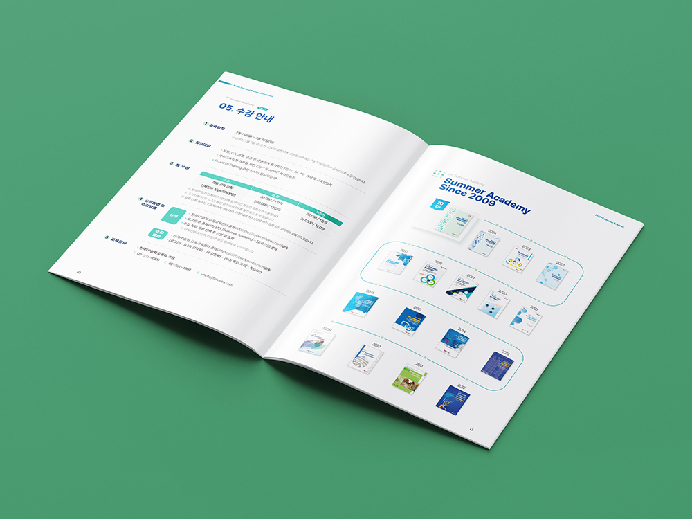 여름의 활기찬 분위기를 과하지 않게 담아낸 안내서 디자인입니다. 좌측에는 정사각형, 직사각형, 사명이 어우러진 민트 계열 패턴을 일부 적용하고, 내지에는 메인 민트색과 균형을 이루는 파스텔 톤을 활용해 내용의 분류를 돕고 시각적인 단조로움을 줄였습니다.