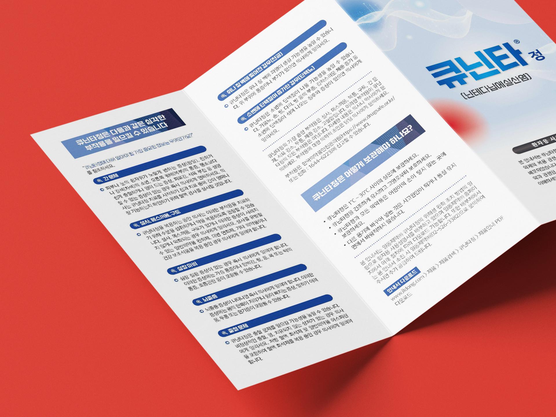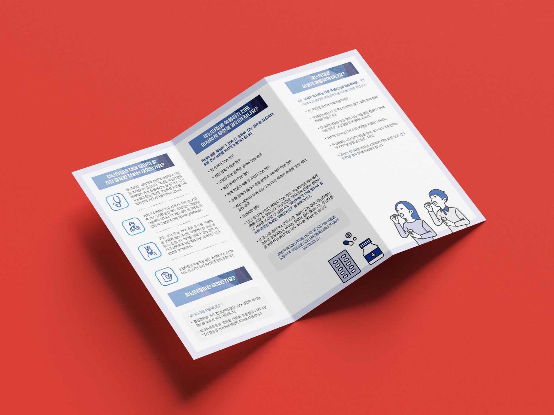 여백을 활용하여 제품 명을 강조한 환자용 복용 설명 리플렛입니다. 메인 그래픽은 제약과 공학에 초점을 맞춰 원과 선 요소로 분자 구조가 연상될 수 있도록 하였으며, 내용 부분엔 텍스트가 잘 보일 수 있도록 배경 요소를 최소화하고 색상이 통일된 라인 일러스트를 사용하였습니다.