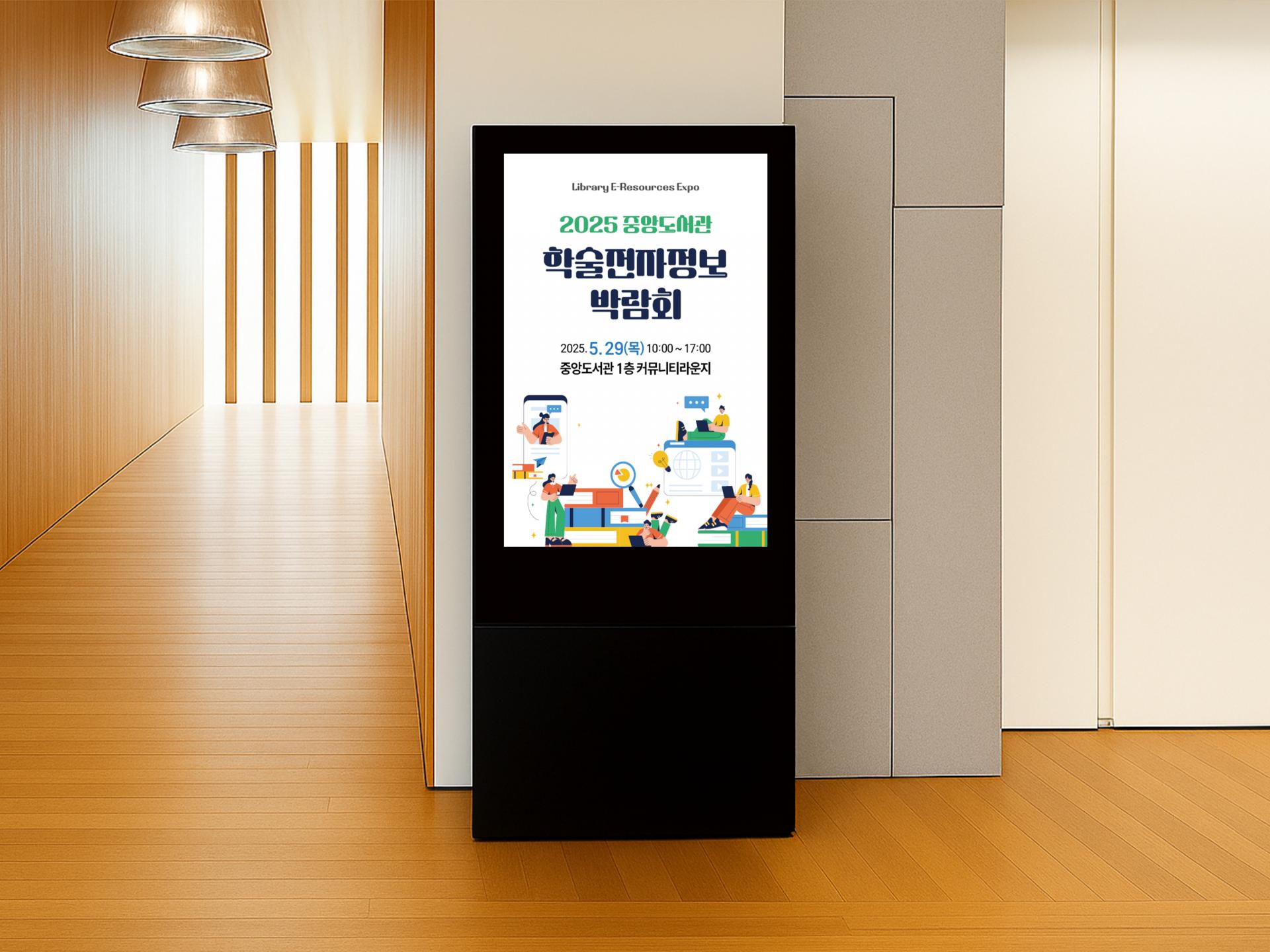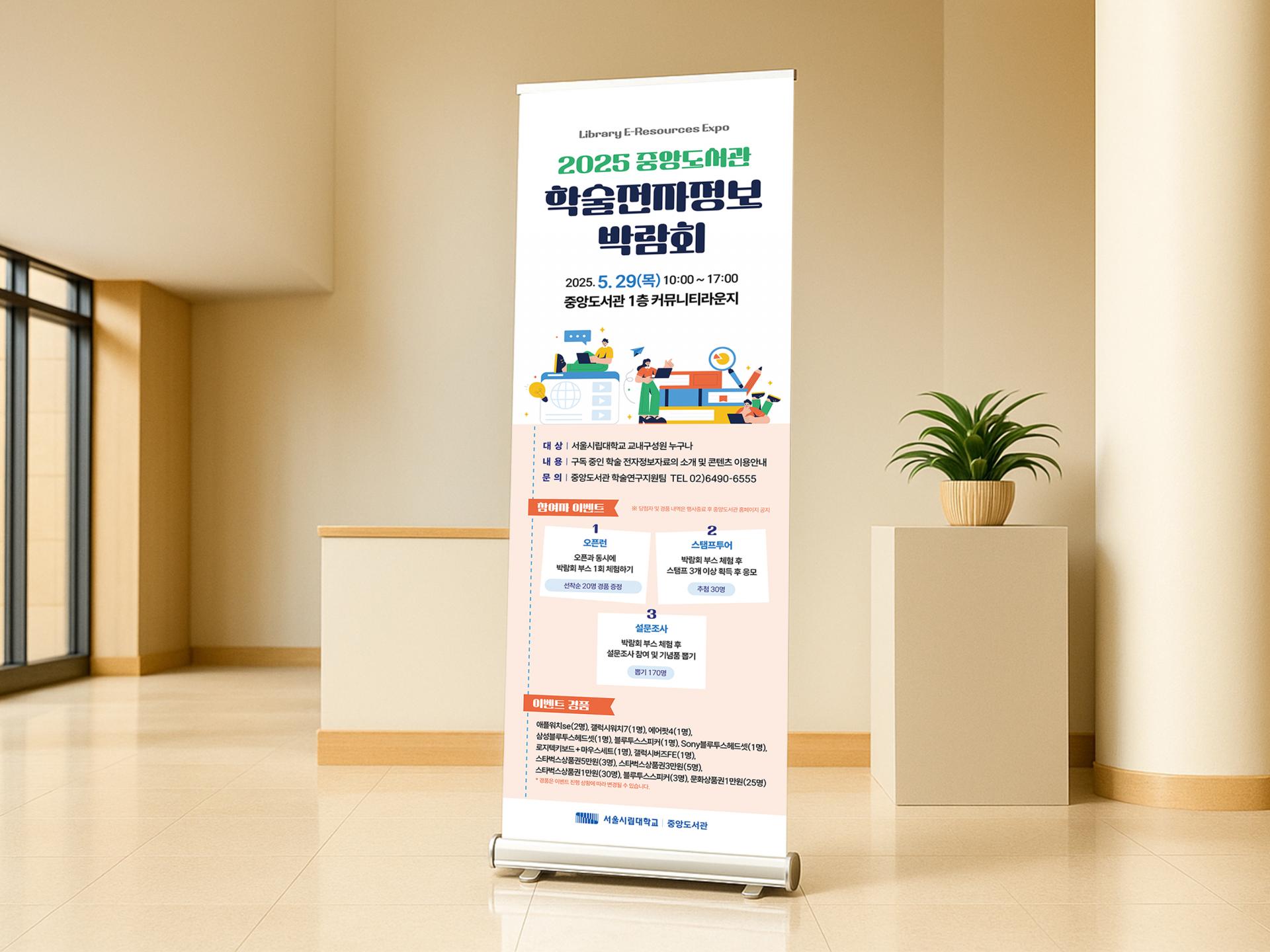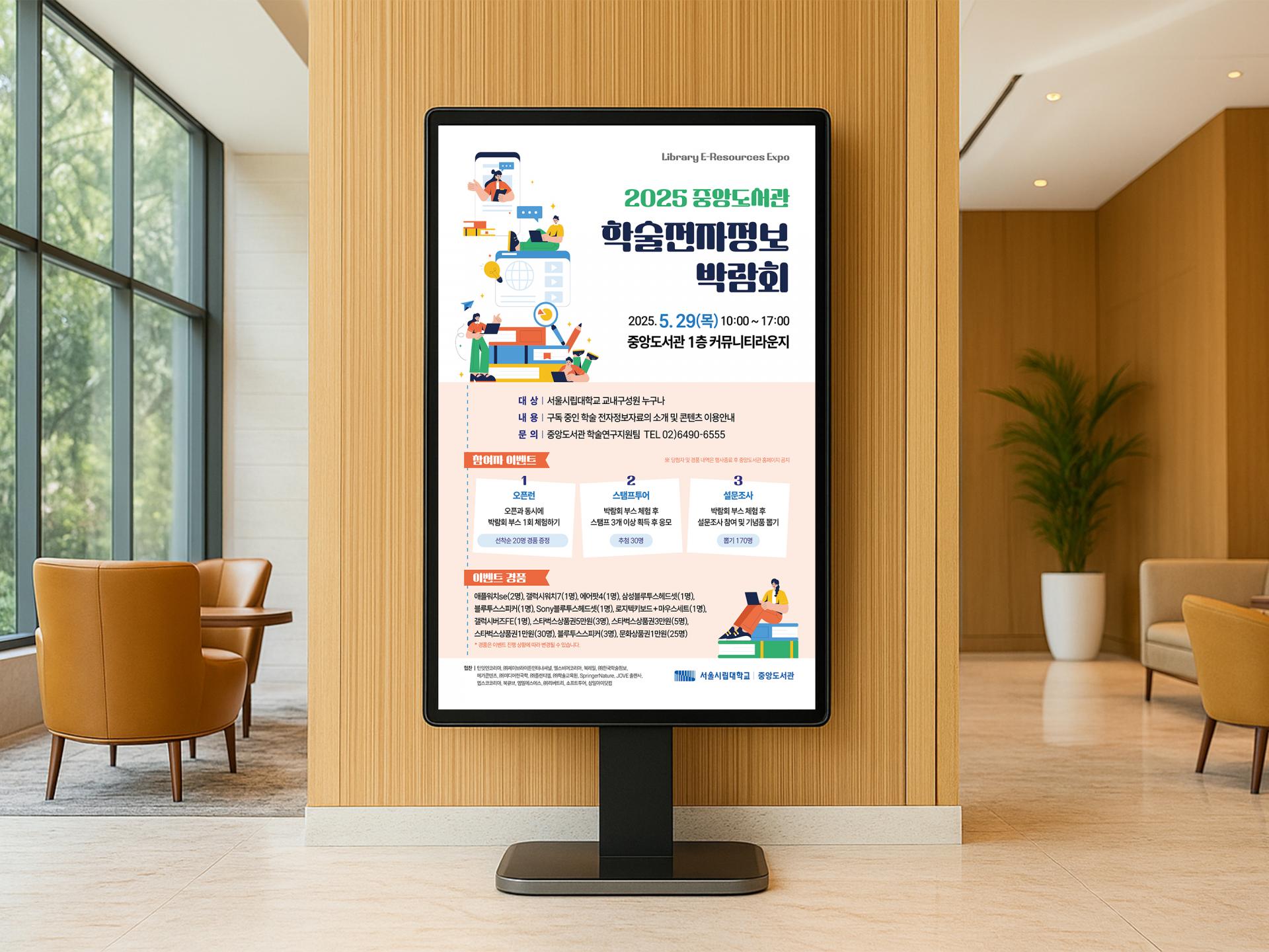 클라이언트 서울시립대학교 | 다양한 디지털 기기를 통해 도서관 자료를 이용하는 사람들의 모습을 일러스트로 표현하여 디지털 학습의 편리함을 직관적으로 보여주는 디자인입니다. 그린, 오렌지, 블루 등의 다채로운 색상을 사용해 활기차고 젊은 분위기를 연출하였으며, 하단의 이벤트 정보는 명확한 도형의 구분과 간결한 텍스트로 구성하여 가독성을 높였습니다. ![]()
