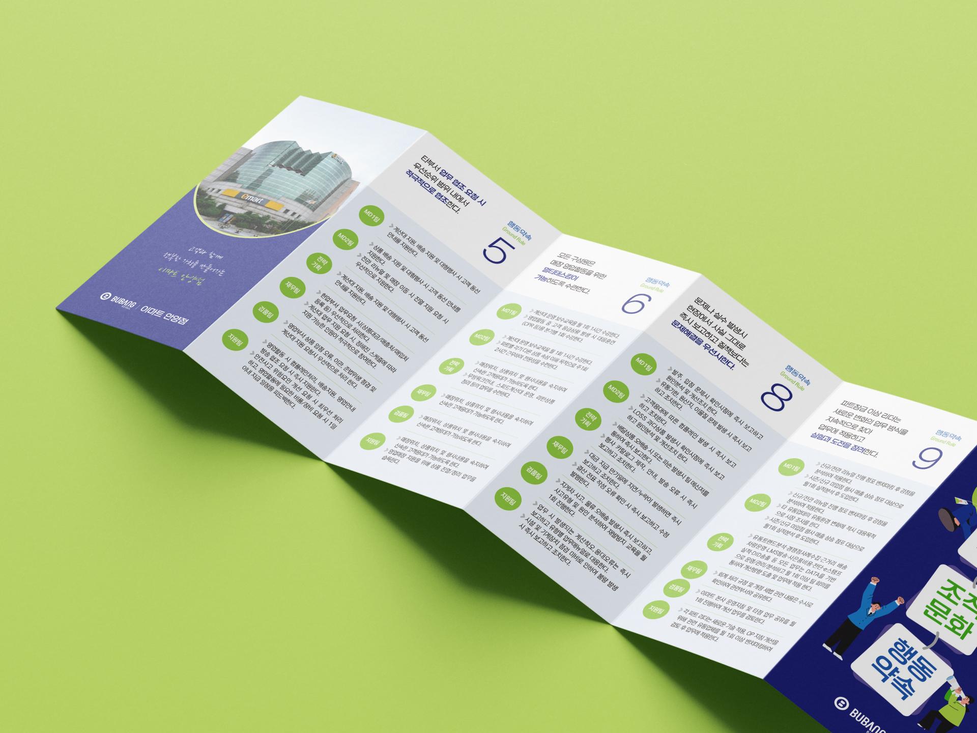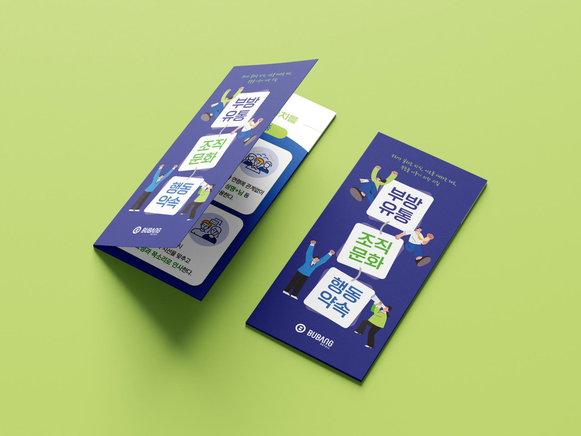 부방유통의 조직문화 핵심 가치와 행동 약속을 임직원들에게 효과적으로 전달하기 위한 리플렛 디자인입니다. 내용을 함축적으로 표현하는 직관적인 아이콘으로 메시지의 중요도를 부각시켜 정보 전달의 효율성을 높였으며, 전체적으로 일관된 톤앤매너를 유지하고 각 섹션의 배경색을 연달아 사용하여 시각적인 리듬감을 부여하였습니다.