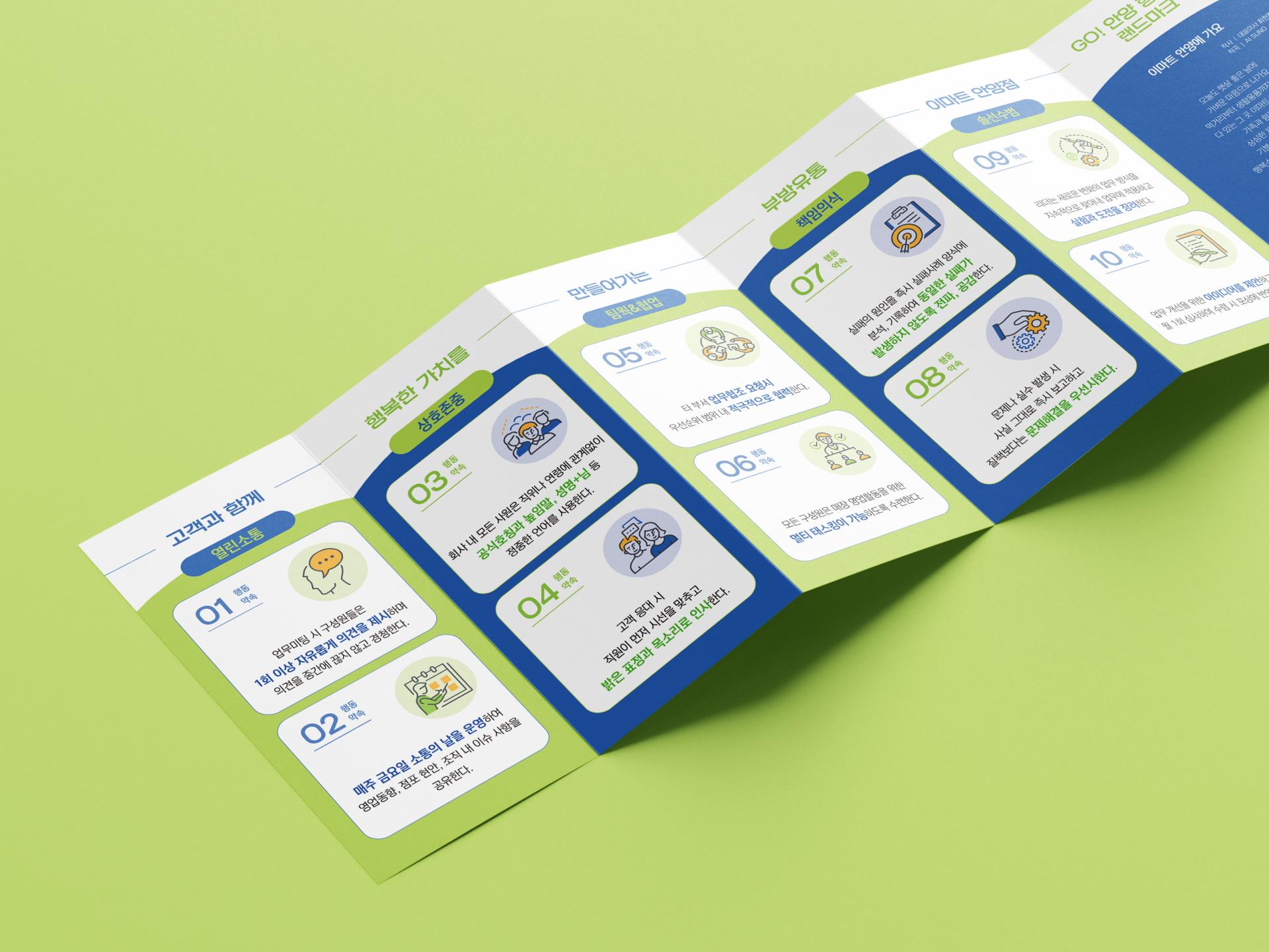 클라이언트 부방유통 | 부방유통의 조직문화 핵심 가치와 행동 약속을 임직원들에게 효과적으로 전달하기 위한 리플렛 디자인입니다. 내용을 함축적으로 표현하는 직관적인 아이콘으로 메시지의 중요도를 부각시켜 정보 전달의 효율성을 높였으며, 전체적으로 일관된 톤앤매너를 유지하고 각 섹션의 배경색을 연달아 사용하여 시각적인 리듬감을 부여하였습니다. ![]()