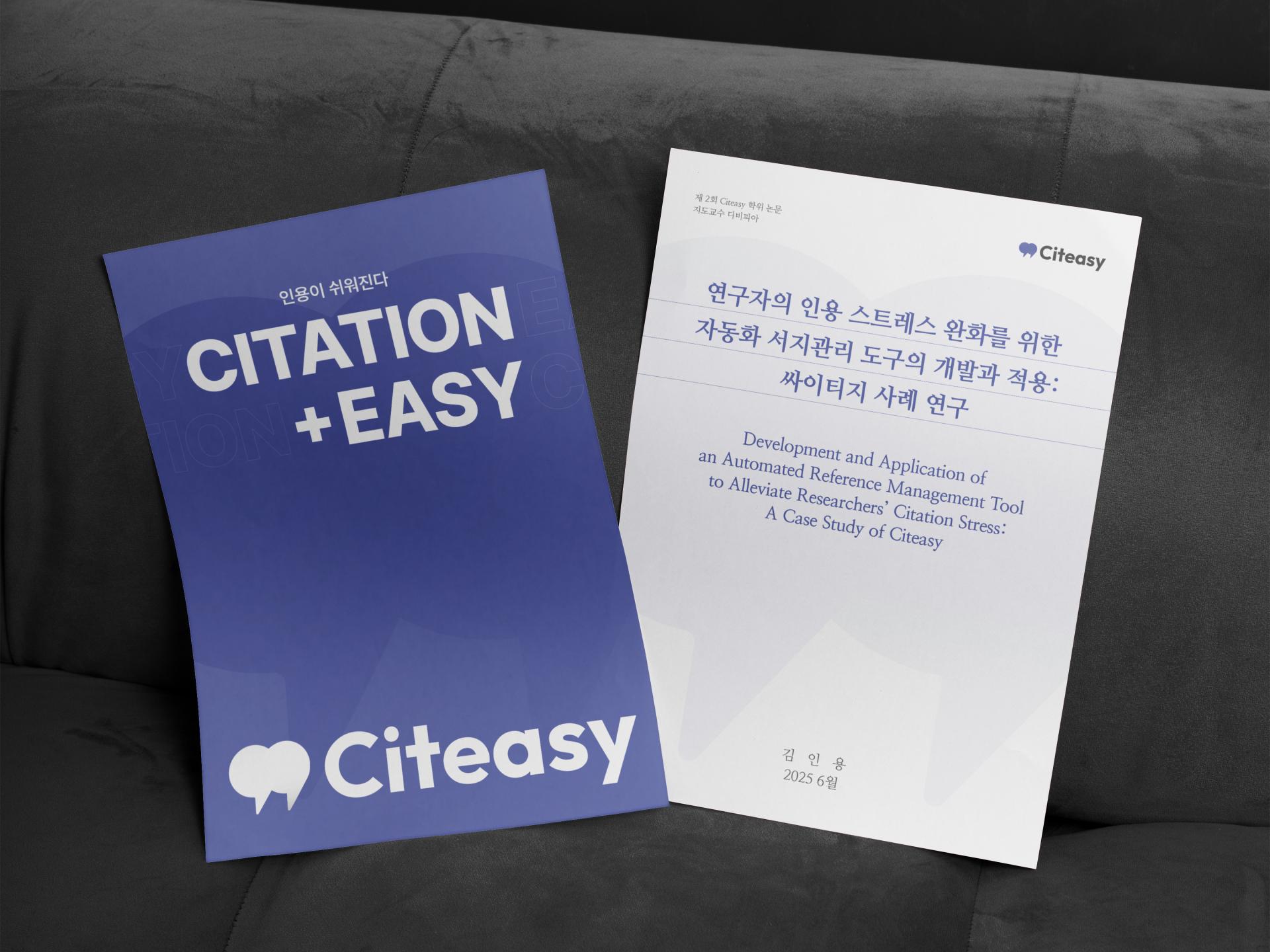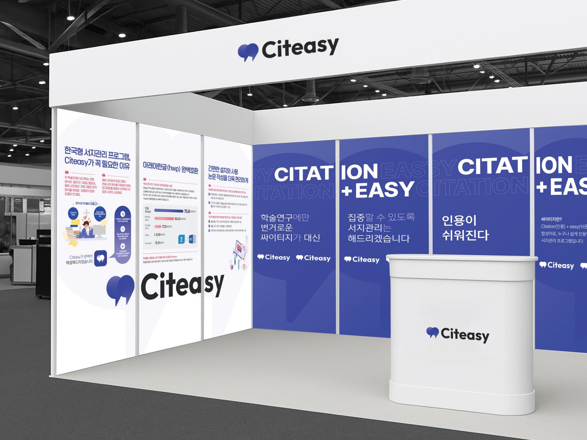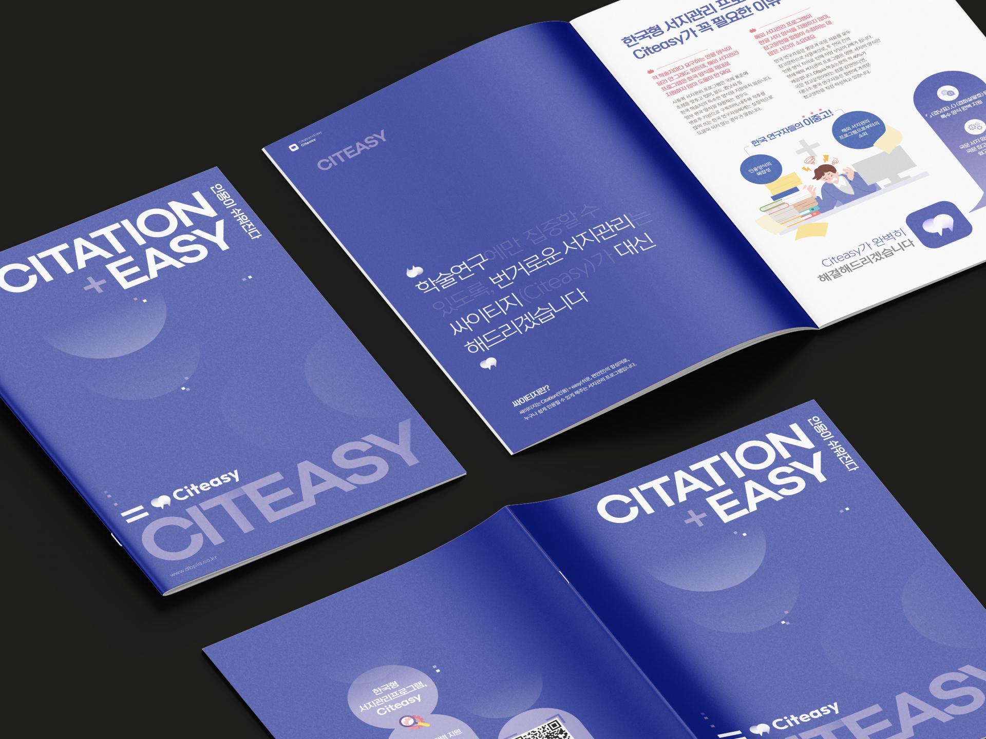 브랜드 대표 메인 컬러를 중심으로 슬로건과 로고가 조화롭게 어우러진 홍보물 디자인입니다. 화이트 컬러의 대비로 가독성과 전문성있는 이미지를 부각시켰으며, '인용'이라는 핵심 서비스 내용을 강조하기 위해 글과 관련된 문자/기호들을 디자인 요소로 활용했습니다.