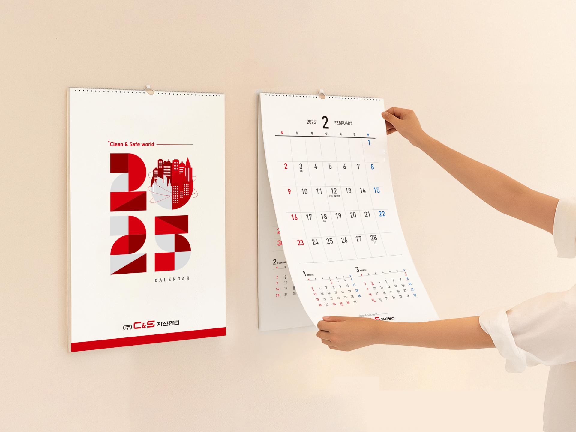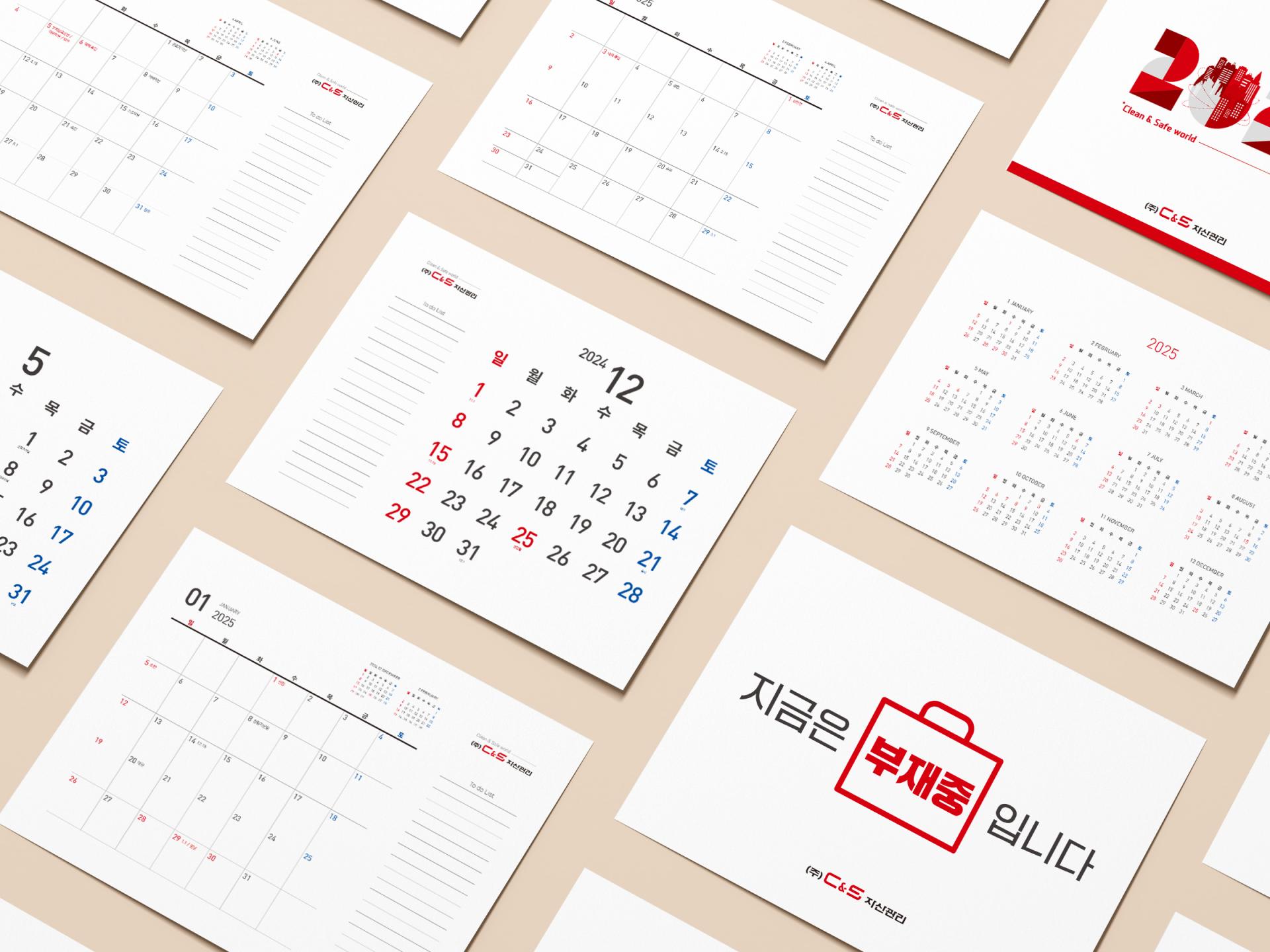 클라이언트 씨앤에스자산관리 디자인품목 벽걸이캘린더, 탁상캘린더 제작연도 2024 | 숫자를 기하학 형태로 재구성하고, 지구본이 회전하는 모습을 형상화한 그래픽 키비주얼을 통해 글로벌 자산관리라는 기업 비전을 직관적으로 전달한 시즌 홍보물입니다. 벽걸이 형은 하단 전/후월을 함께 배치하여 3개월 월력이 한번에 확인이 가능하도록 실용적인 레이아웃으로 구성하였으며, 탁상형은 양면 메모 공간을 배치하여 업무용 도구의 기능을 강화하였습니다.
