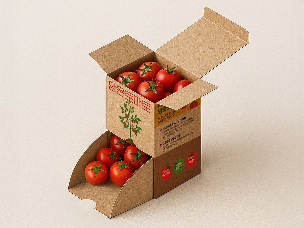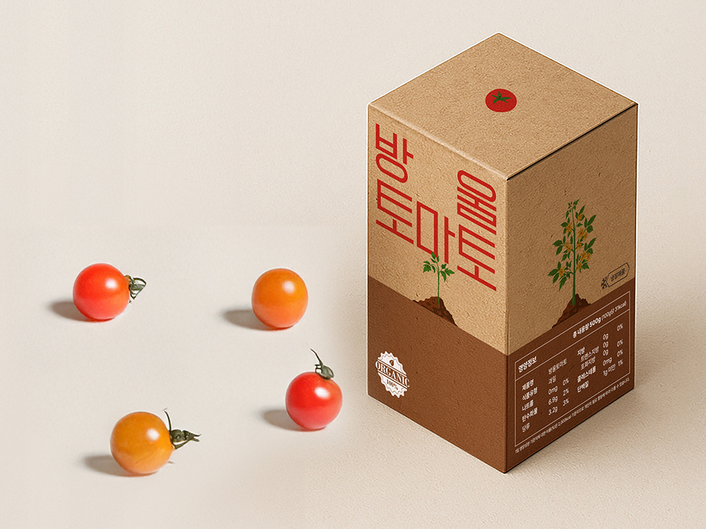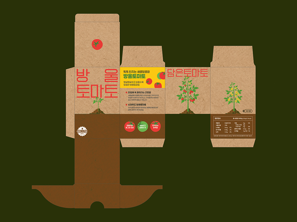 방울토마토의 일일 섭취 권장량을 담은 데일리 패키지 디자인으로 아침 식사를 거르기 쉬운 직장인이나 비타민 보충이 필요한 현대인을 위한 제품입니다. 소재는 신선한 채소와 잘 어울리는 친환경 크라프트지를 사용했습니다. 상단은 보관에 용이하고, 하부는 개봉 시 방울토마토가 자연스럽게 흘러나오는 구조로 디자인되어 책상 위에 두고 간편하게 꺼내 먹기 좋습니다.