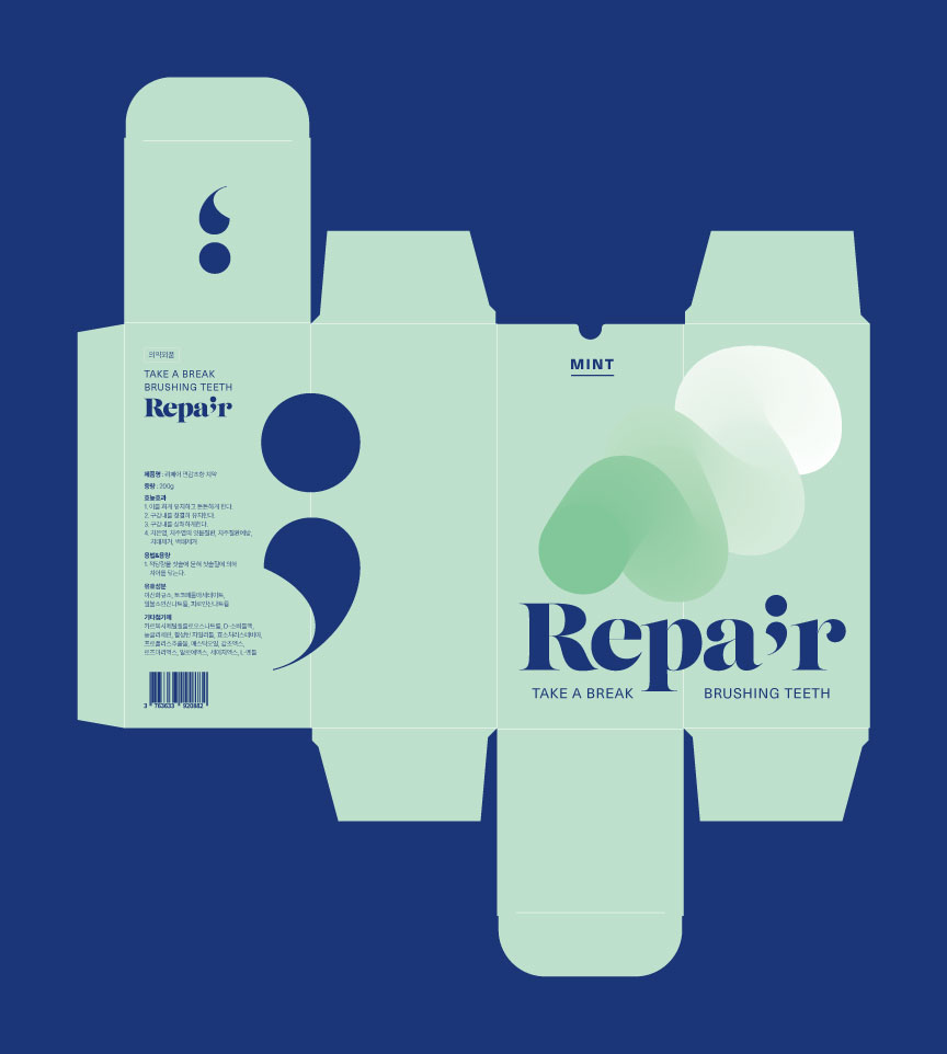 디자인품목 | 짜여진 치약이 뭉쳐있는 형태를 직관적인 키비주얼로 표현하여 제품의 기능을 강조한 디자인입니다. 쉼표 그래픽은 바쁜 일상 속에서 '잠시 멈춤'을 통해 치아 건강을 회복한다는 브랜드 철학을 표현하였으며, 투톤의 파스텔 컬러감은 치약 특유의 부드러운 질감과 안전하고 순한 제품 이미지를 연상시킵니다. ![]() ![]()