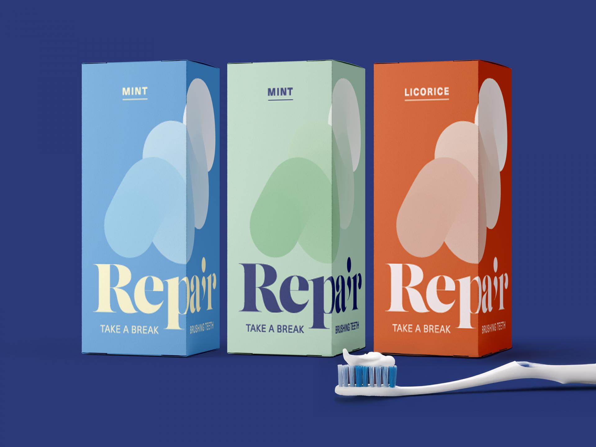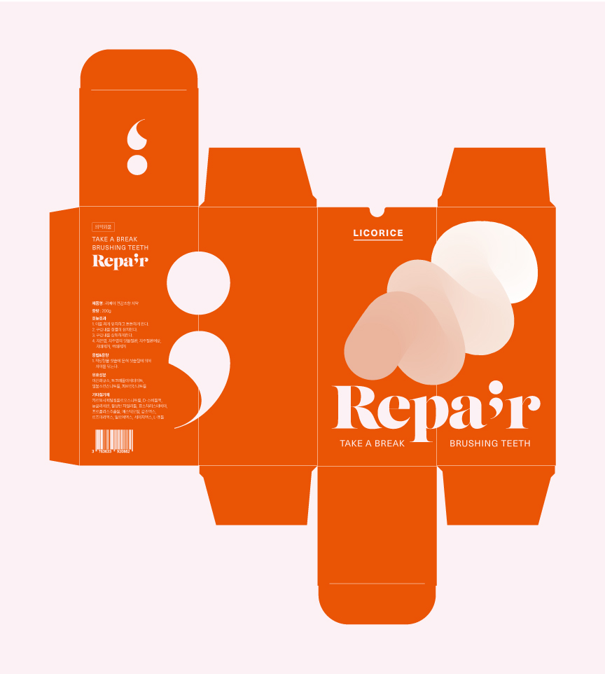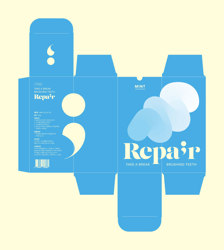 짜여진 치약이 뭉쳐있는 형태를 직관적인 키비주얼로 표현하여 제품의 기능을 강조한 디자인입니다. 쉼표 그래픽은 바쁜 일상 속에서 '잠시 멈춤'을 통해 치아 건강을 회복한다는 브랜드 철학을 표현하였으며, 투톤의 파스텔 컬러감은 치약 특유의 부드러운 질감과 안전하고 순한 제품 이미지를 연상시킵니다.