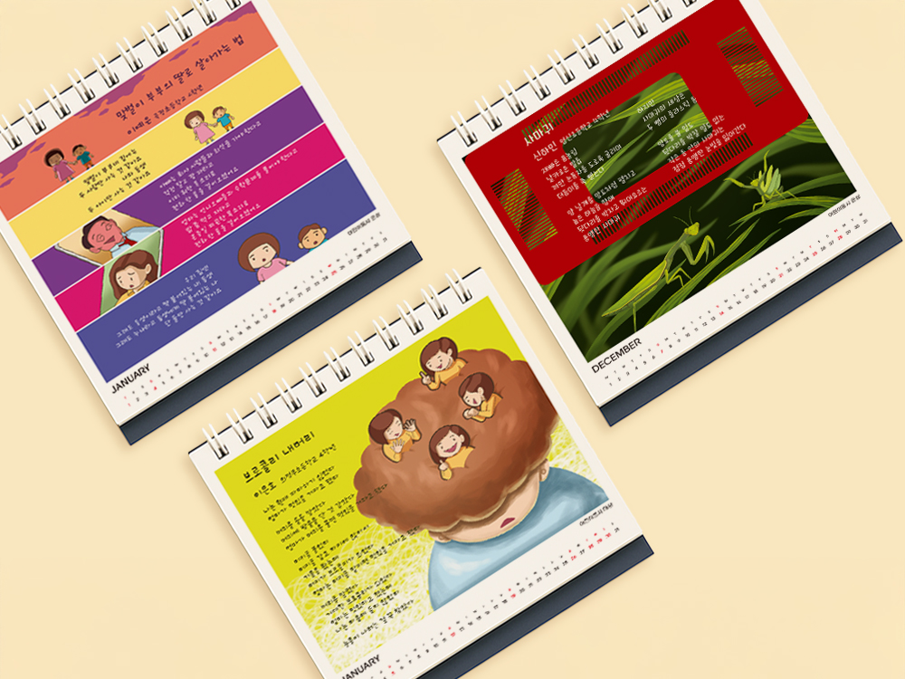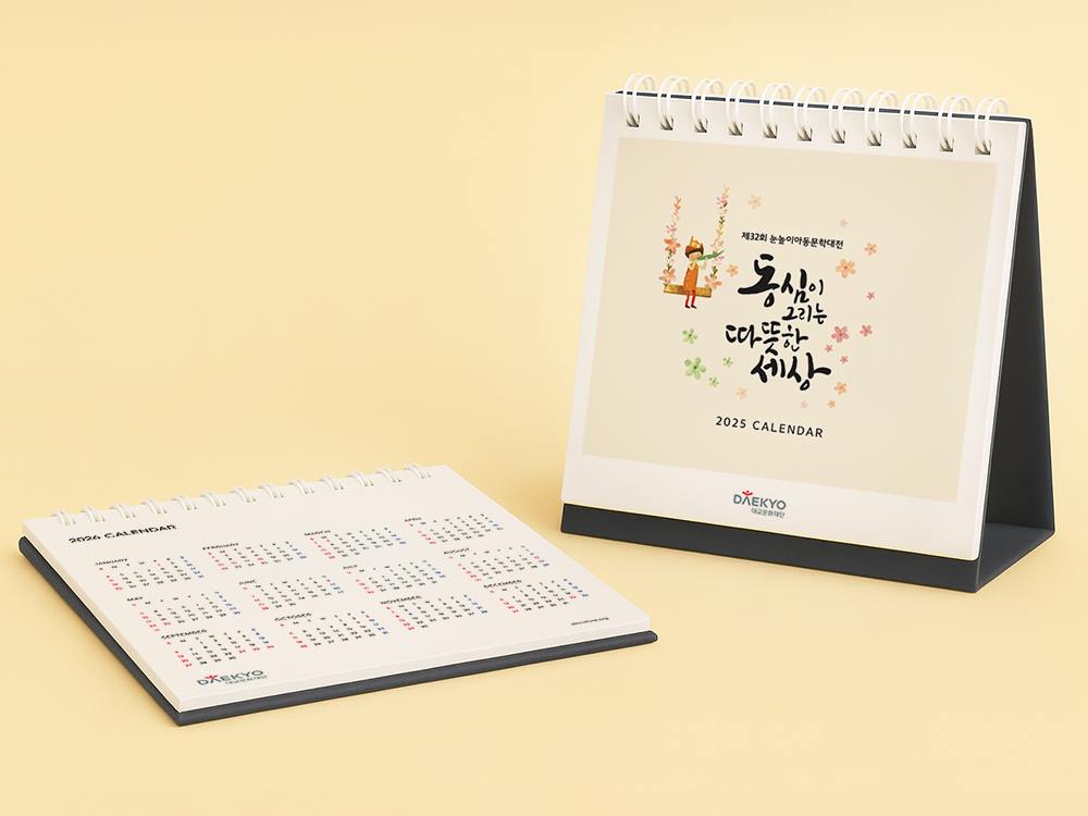 클라이언트 대교문화재단 디자인품목 탁상캘린더 제작연도 2024 | 대교문화재단이 주최하는 눈높이아동문학대전 어린이 동시 부문 수상작을 소박한 일러스트와 함께 담은 캘린더입니다. 월판은 불필요한 장식을 줄이고 깔끔한 레이아웃으로 구성하여, 메인 이미지를 더욱 돋보이게 디자인했습니다.