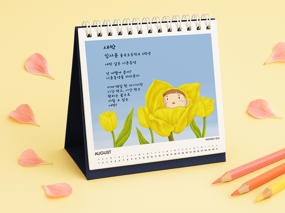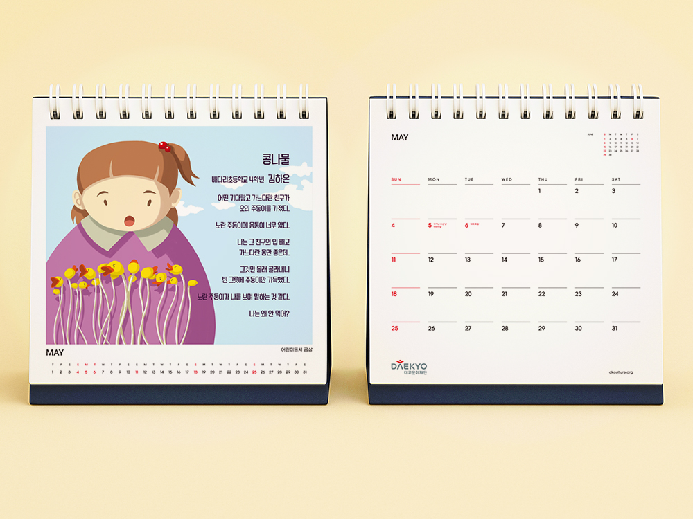 대교문화재단이 주최하는 눈높이아동문학대전 어린이 동시 부문 수상작을 소박한 일러스트와 함께 담은 캘린더입니다. 월판은 불필요한 장식을 줄이고 깔끔한 레이아웃으로 구성하여, 메인 이미지를 더욱 돋보이게 디자인했습니다.