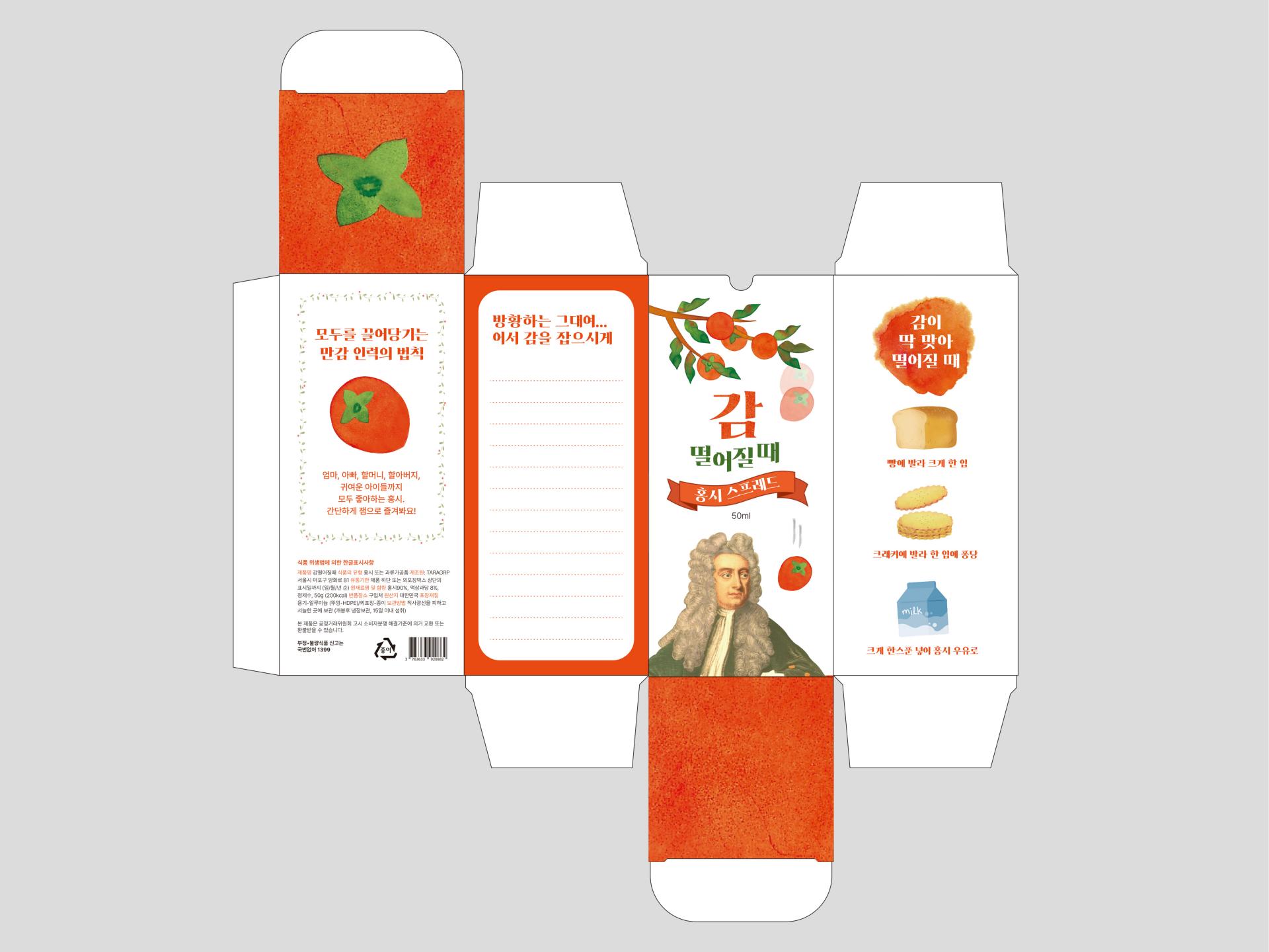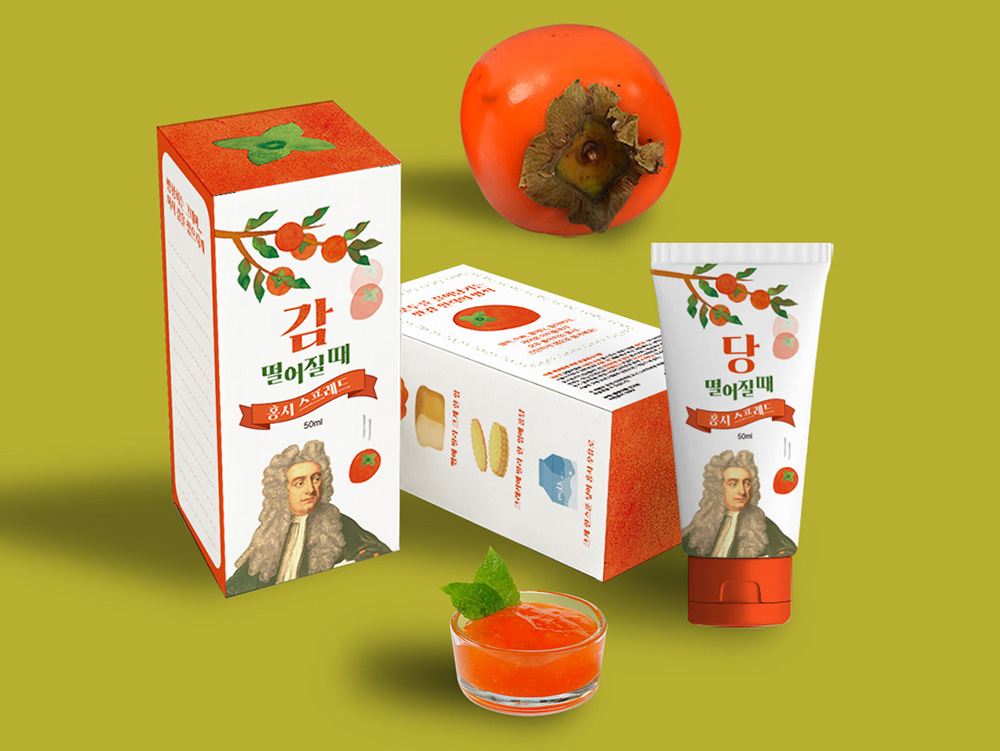 뉴턴의 사과 일화를 감으로 각색해 동음이의 문장으로 네이밍을 한 홍시잼 패키지입니다. 어울리는 디저트와 선물할 때를 대비한 편지지 섹션과 상단의 감 꼭지로 포인트를 주고, 안쪽 튜브 패키지에는 ‘당 떨어질 때’로 표기해 재미를 더했습니다.