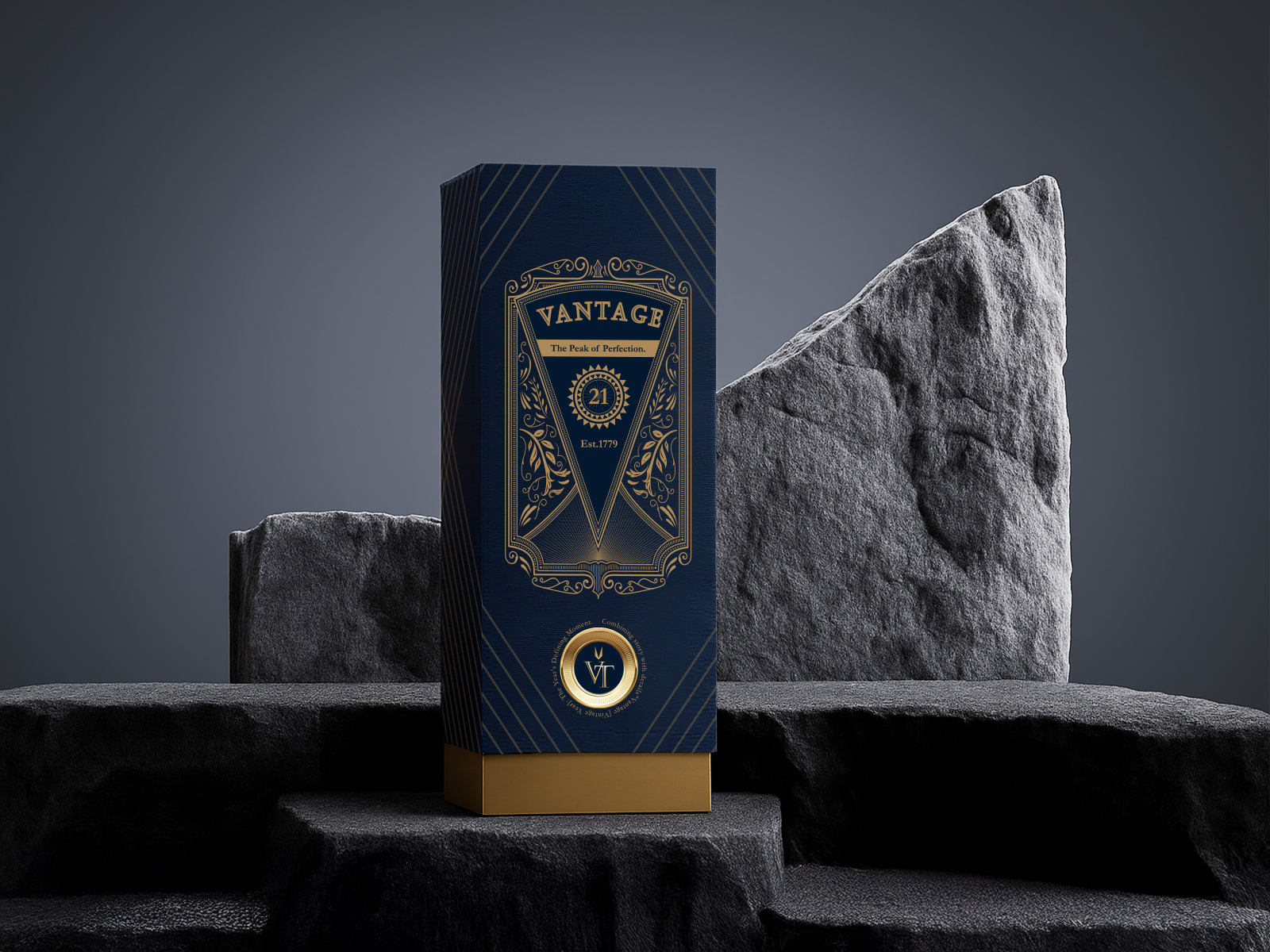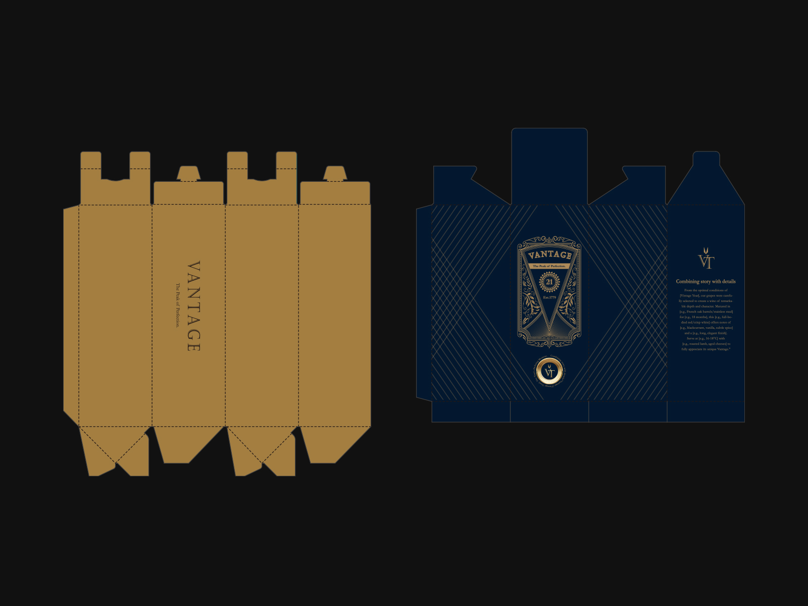 톤이 다운된 네이비 블루와 골드/브론즈의 조화로 고급스러움을 표현한 와인 패키지입니다. 시간의 흐름과 와인의 숙성 과정을 은유적으로 나타내는 모래시계를 메인 그래픽으로 입체적인 라인들과 함께 활용하였으며, 금박과 형압 등의 후가공을 적용하기 좋은 프리미엄 패키지 디자인입니다.