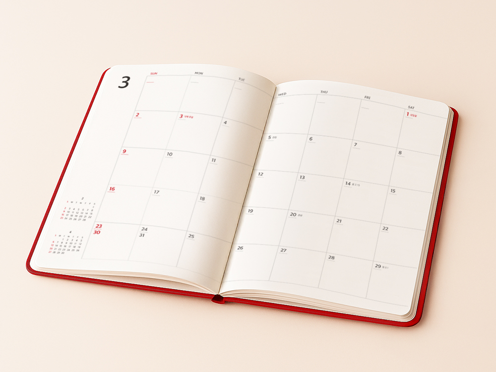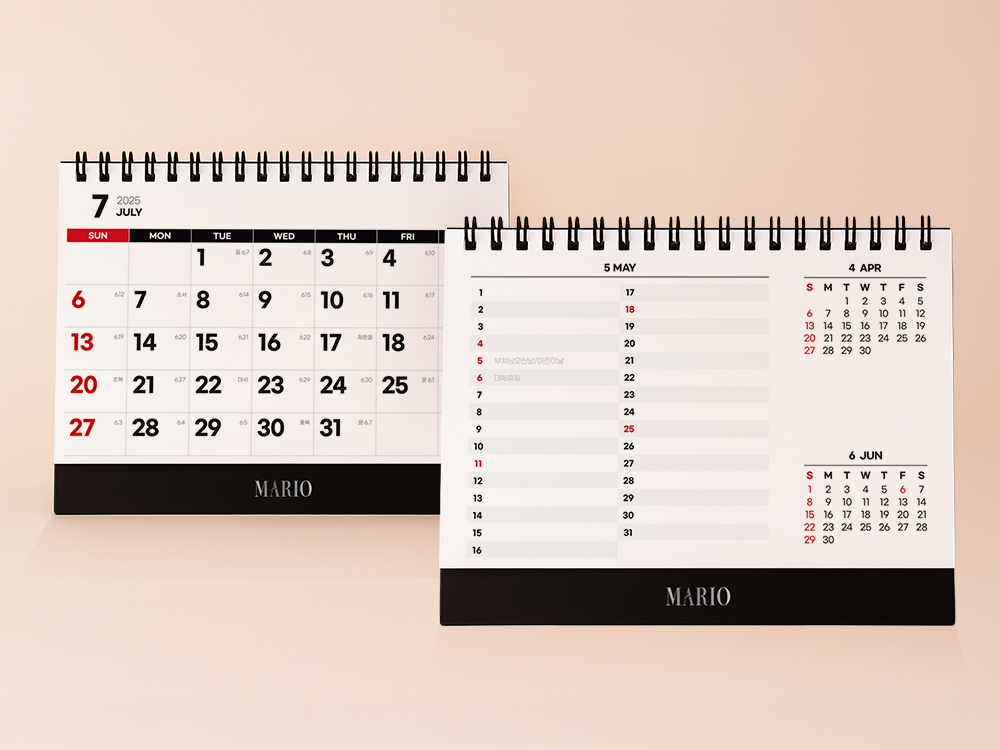 마리오아울렛의 브랜드컬러인 빨간색을 다이어리 커버와 내지 휴일에 포인트로 활용한 플래너 중심의 시즌물 디자인입니다. 이미지 대신 큰 글씨 달력과 메모 섹션 등이 들어간 심플한 레이아웃으로 일정 관리에 용이합니다.