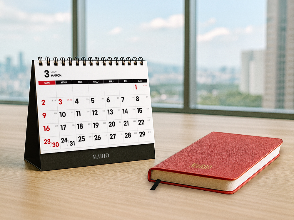 클라이언트 마리오아울렛 디자인품목 탁상캘린더, 다이어리 제작연도 2024 | 마리오아울렛의 브랜드컬러인 빨간색을 다이어리 커버와 내지 휴일에 포인트로 활용한 플래너 중심의 시즌물 디자인입니다. 이미지 대신 큰 글씨 달력과 메모 섹션 등이 들어간 심플한 레이아웃으로 일정 관리에 용이합니다.
