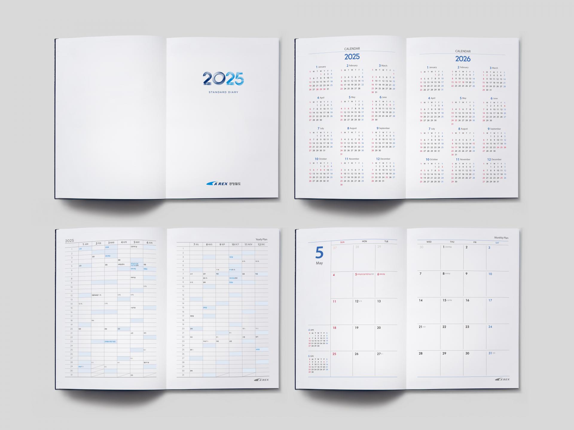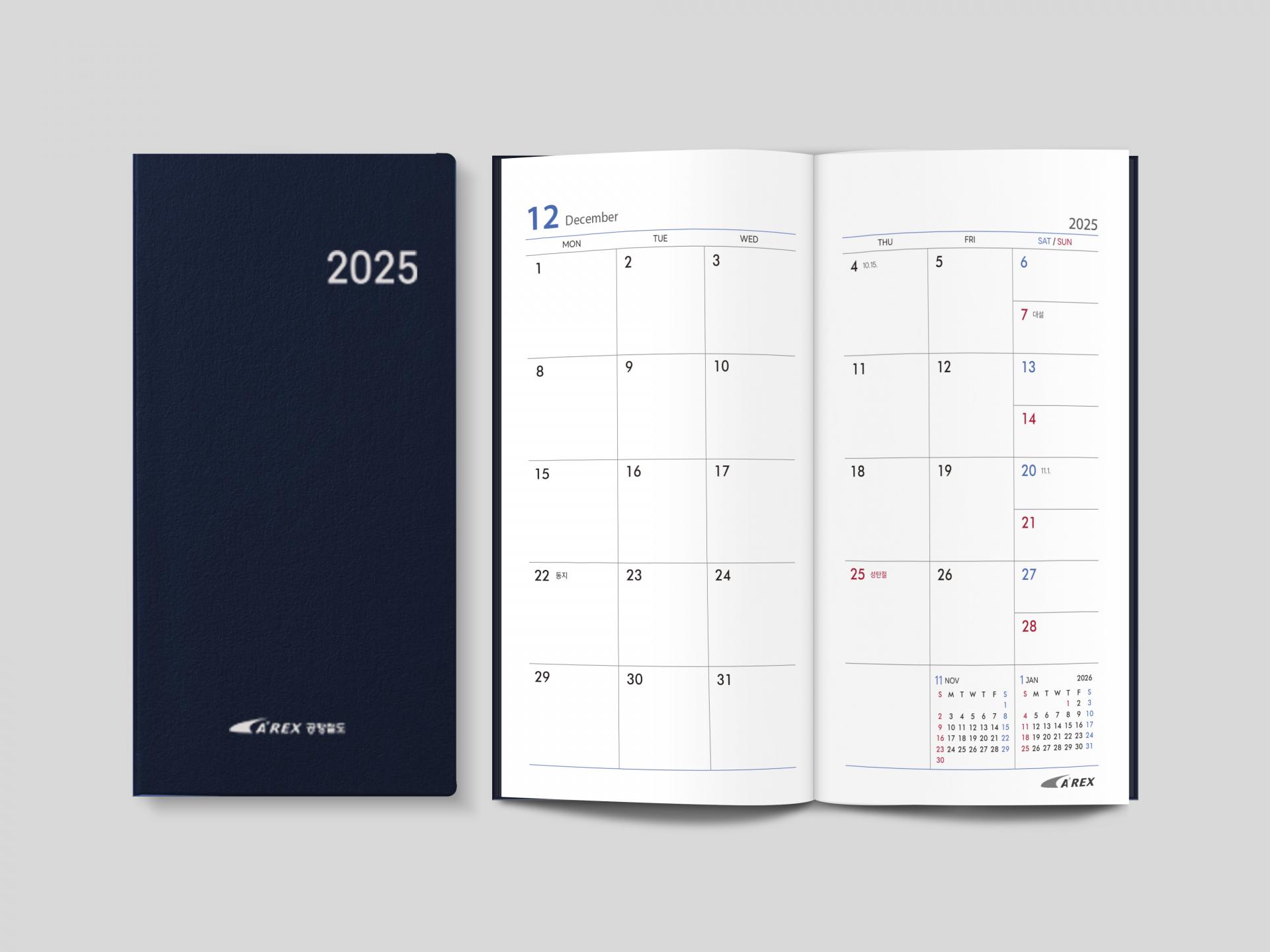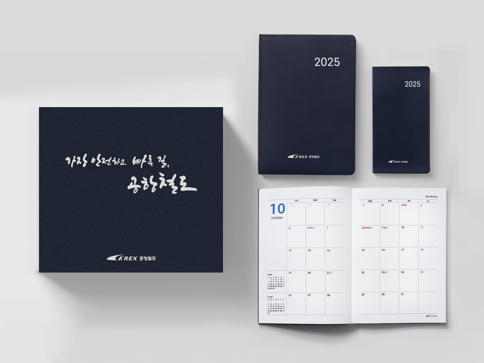 클라이언트 AREX 공항철도 디자인품목 단상자, 다이어리, 포켓수첩 제작연도 2024 | 미니멀한 브랜드 컬러 네이비를 단색으로 사용하여 신뢰감을 전달한 시즌 플래너 세트입니다. 포켓 수첩의 월력은 주말을 2단 구조로 컴팩트하게 구성해 효율성을 살렸으며, 모든 내지 하단에 일관되게 배치된 브랜드 심볼은 페이지마다 통일된 브랜드 경험을 제공합니다.