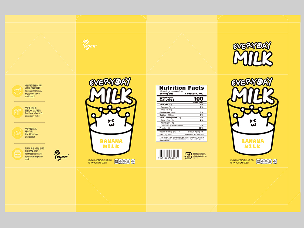 웃는 우유 캐릭터를 활용해 소비자에게 친근한 인상을 주고, ‘에브리데이(Everyday)’라는 타이틀을 통해 매일 마시는 우유라는 습관적 소비를 자연스럽게 유도했습니다. 맛에 따라 컬러를 구분해 시각적으로 직관적이고 쉽게 식별할 수 있도록 디자인했습니다.