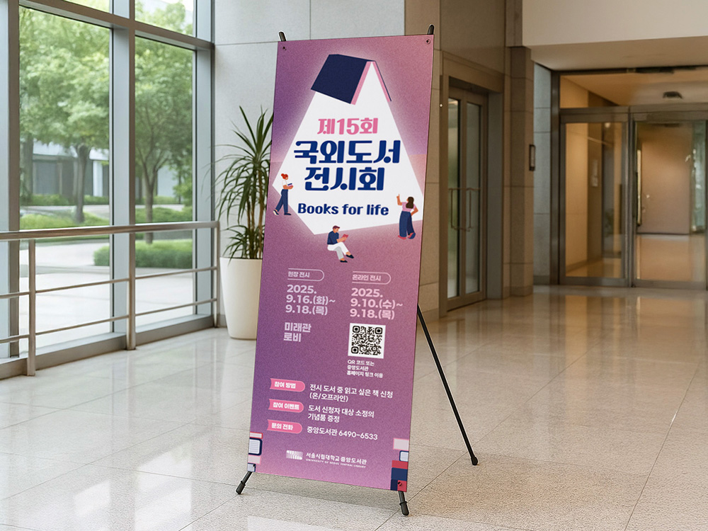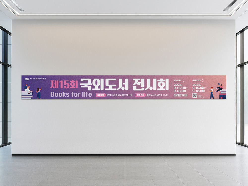 클라이언트 서울시립대학교 | 책을 상징하는 그래픽 요소를 중심으로 구성해 ‘독서와 지식의 확장’을 시각적으로 표현한 키비주얼입니다. 노란 빛이 섞인 보라·분홍 그라데이션으로 따뜻하면서도 현대적인 분위기를 연출하였습니다. 책을 펼쳤을때 쏟아지는 정보의 빛을 그래픽화하여 참여와 소통의 이미지를 강조였습니다.