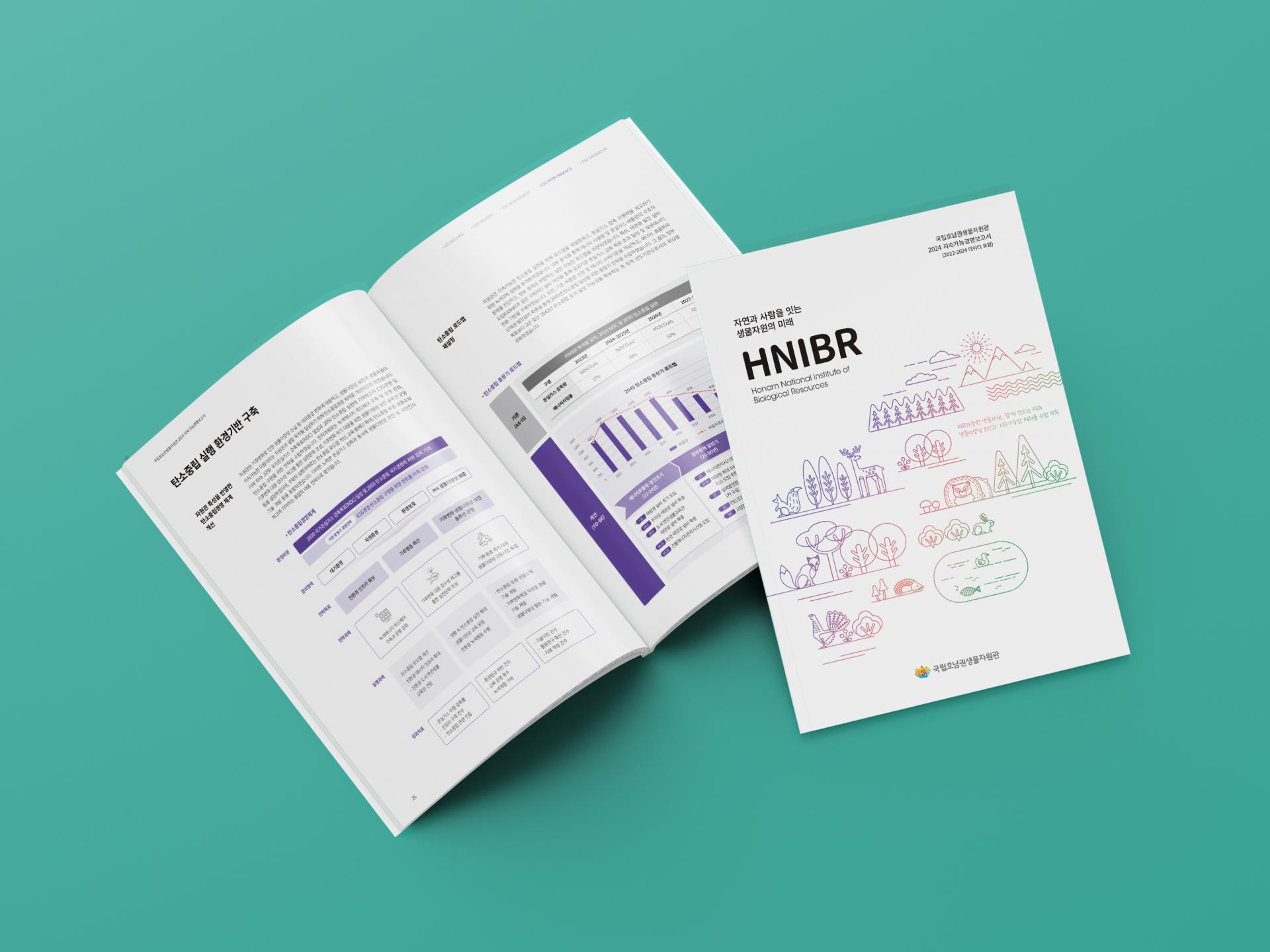 클라이언트 와이즈웍스 | 생물자원기관의 성격을 담은 일러스트를 활용한 연차보고서입니다. 화려한 일러스트와 조화를 이루기 위해 부드러운 그라데이션 컬러와 라인을 사용하여 심플한 레이아웃으로 배치하였으며, 챕터별 색상을 중심으로 인포그래픽을 단색으로 깔끔하게 구성하였습니다.