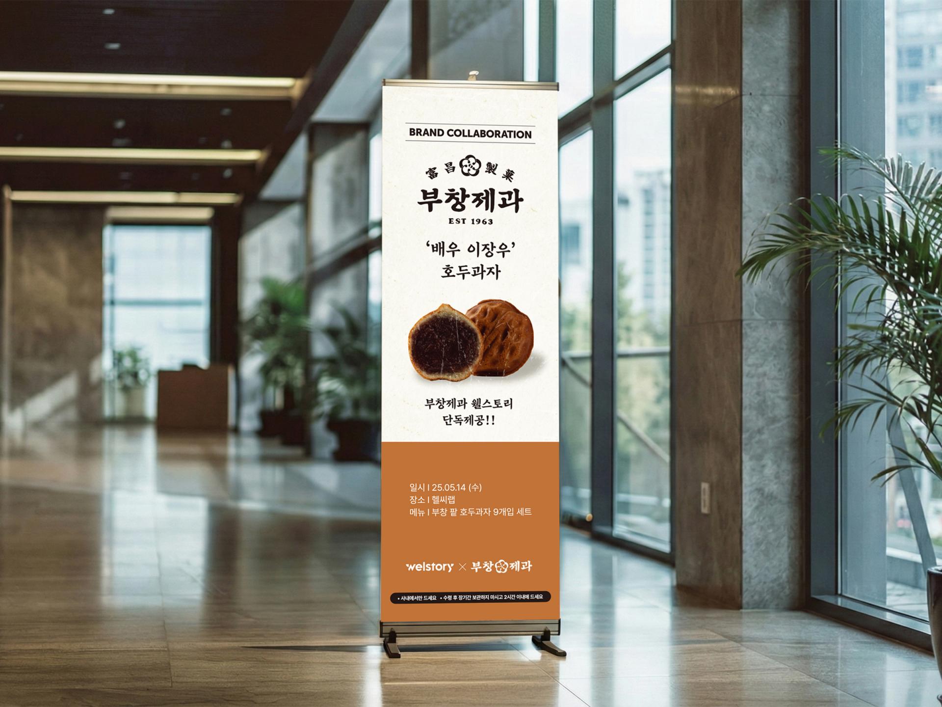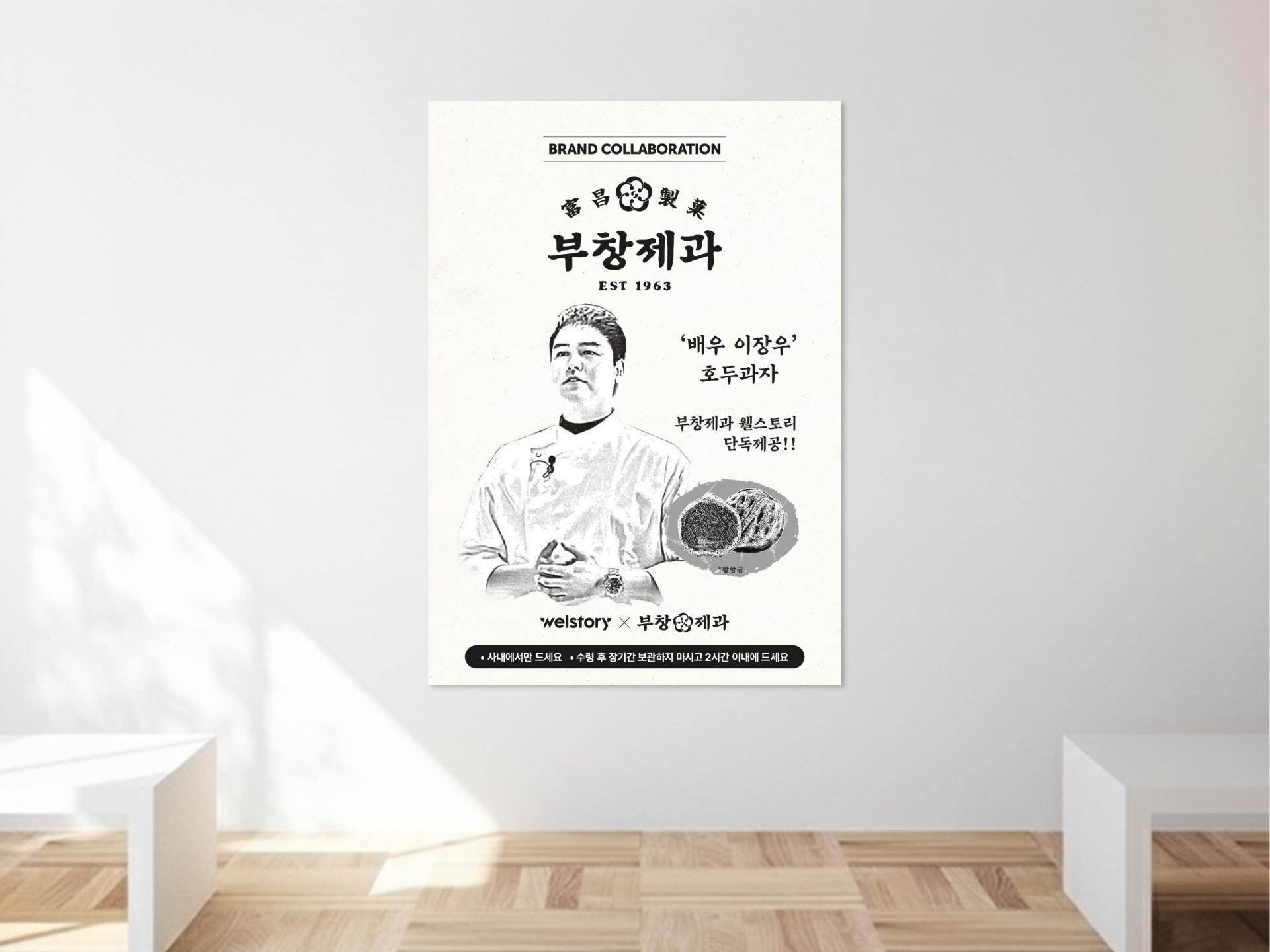 미색 배경과 모노톤 컬러를 베이스로 부창제과가 가진 레트로적인 브랜드 정체성을 반영한 콜라보 홍보물 디자인입니다. 호두과자만 컬러로 처리해 시선을 자연스럽게 제품으로 유도하면서도 노이즈 효과를 더해 빈티지한 분위기를 극대화하였으며, 다양한 홍보물에 일관된 톤앤매너를 유지하여 통일감 있는 브랜드 경험을 전달할 수 있도록했습니다.