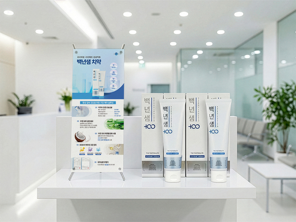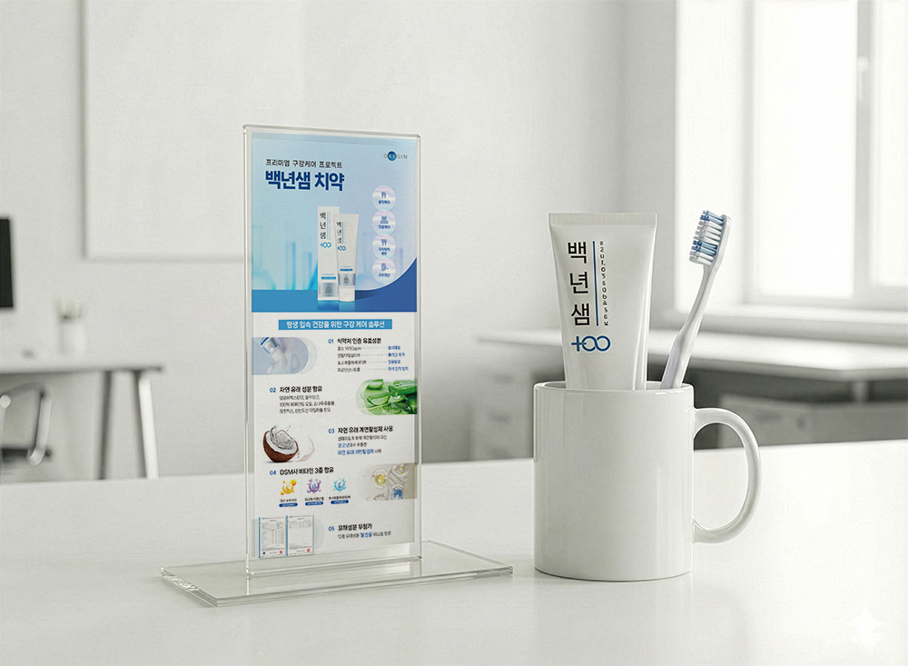 깨끗하고 시원한 블루 톤으로 건강한 치아 이미지를 담았고, 알로에, 코코넛 등 자연 유래 성분과 비타민 복합체 이미지를 직관적으로 배치하여 제품의 안전성과 프리미엄 퀄리티를 강조했습니다. 또한 핵심 효능을 한눈에 보이게 하여 고객이 쉽게 제품의 장점을 느낄 수 있도록 구성했습니다.