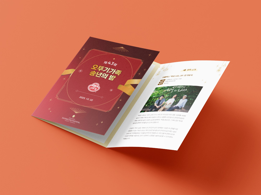 클라이언트 오뚜기 | 오뚜기 로고의 붉은색에 금색을 더하여 연말 파티와 크리스마스의 따뜻한 분위기를 담은 리플렛입니다. 한 해를 마무리하고 다가오는 새해를 맞이하는 행사에 어울리도록, 톤다운된 붉은색을 배경으로 안정감을 주었고, 금색을 포인트 컬러로 활용해 연말 특유의 고급스럽고 축제적인 무드를 표현했습니다. ![]() ![]() ![]()