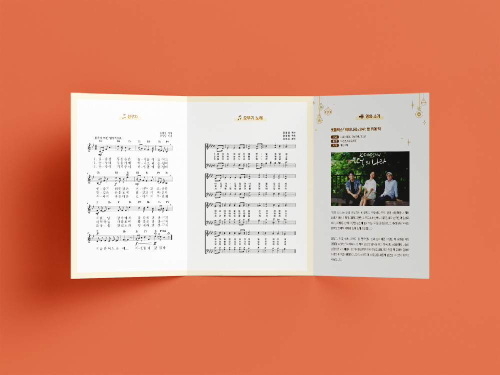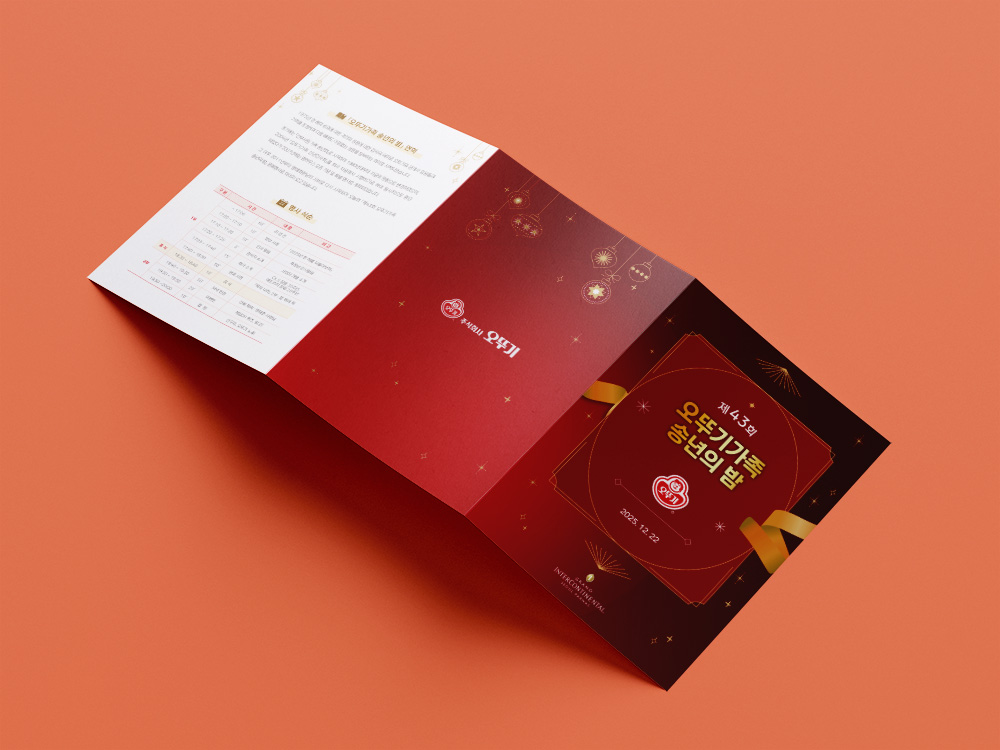 오뚜기 로고의 붉은색에 금색을 더하여 연말 파티와 크리스마스의 따뜻한 분위기를 담은 리플렛입니다. 한 해를 마무리하고 다가오는 새해를 맞이하는 행사에 어울리도록, 톤다운된 붉은색을 배경으로 안정감을 주었고, 금색을 포인트 컬러로 활용해 연말 특유의 고급스럽고 축제적인 무드를 표현했습니다.