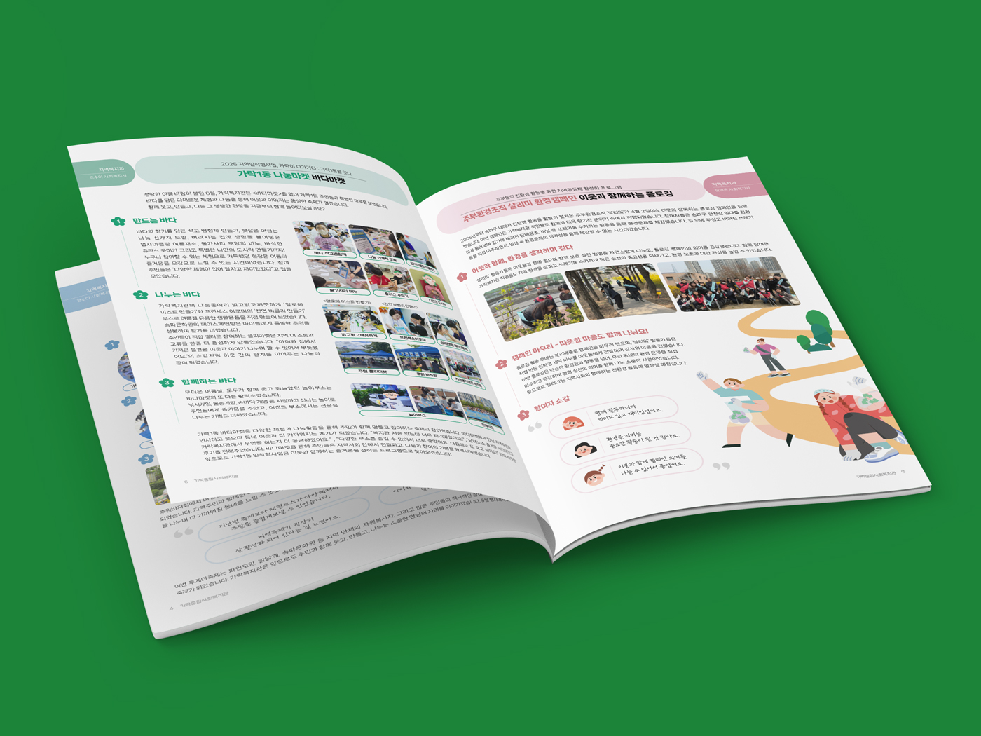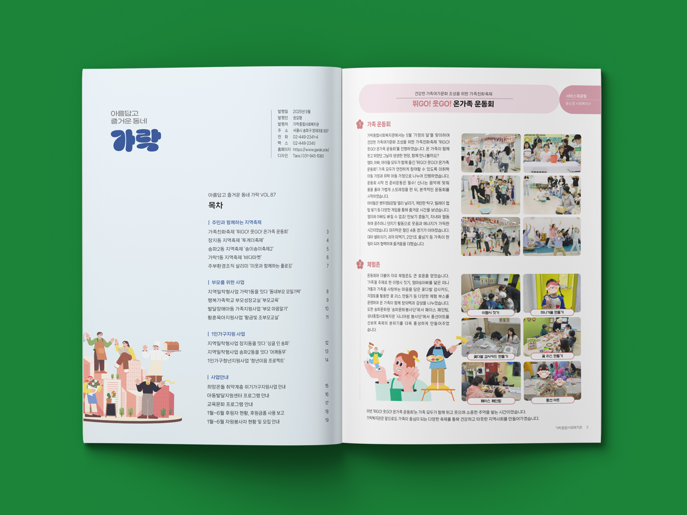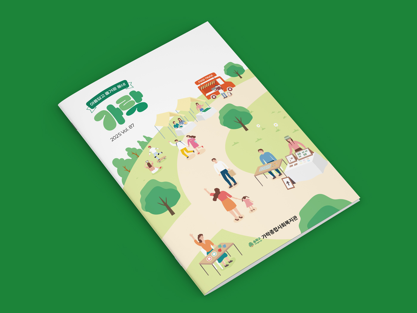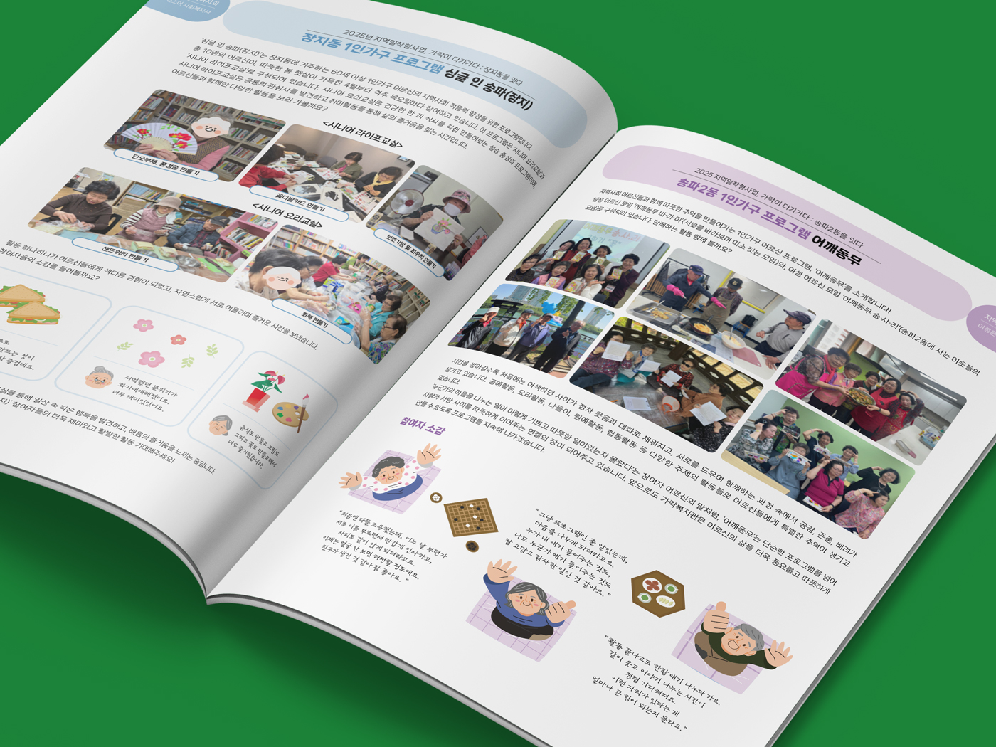 클라이언트 가락종합사회복지관 | 따뜻한 그린 톤과 파스텔 컬러를 활용해 친근하고 편안한 지역사회 분위기를 담아낸 브로셔입니다. 표지에는 주민들의 일러스트를 배치해 마을의 활기찬 일상을 표현했으며, 내지에는 다채로운 커뮤니티 활동 사진들을 그리드 형식으로 정렬하였습니다. 손그림 느낌의 일러스트 요소들을 곳곳에 배치하여 딱딱하지 않은 감성적 분위기를 연출하고 주요 안내사항과 활동 내역을 체계적이고 읽기 쉽게 구성했습니다.