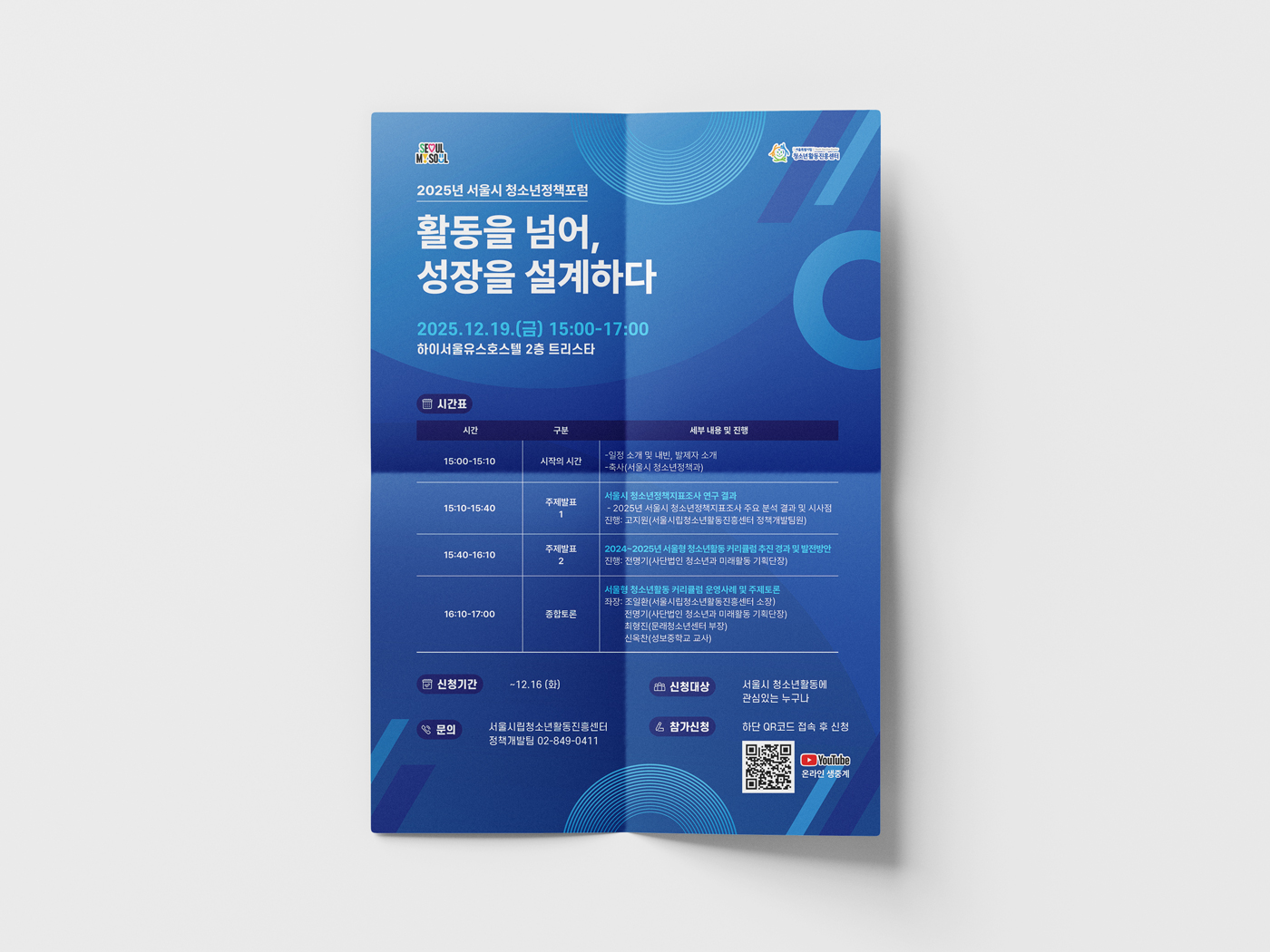 클라이언트 청소년활동진흥센터 | 블루 그라데이션과 유동적인 곡선 패턴을 활용해 청소년 정책포럼의 역동적이고 미래지향적인 이미지를 효과적으로 표현한 홍보물 디자인입니다. 핵심 메시지를 타이포그래피로 강조하고, 모든 매체에 일관된 컬러와 그래픽 요소를 적용하여 통일감 있는 행사 분위기를 연출했습니다. ![]() ![]() ![]() |