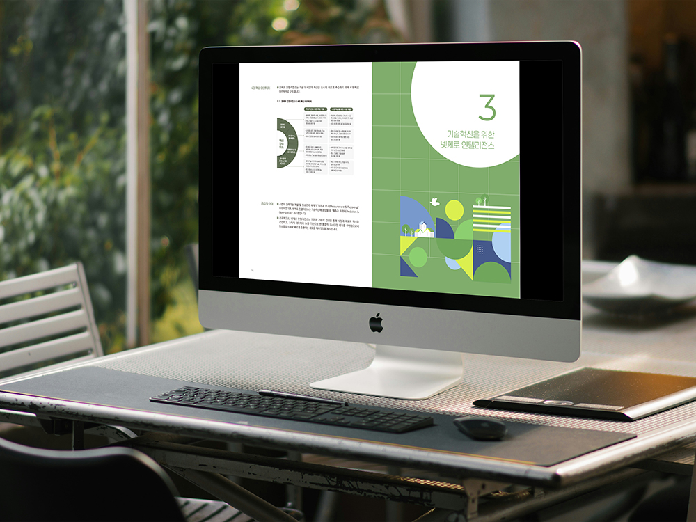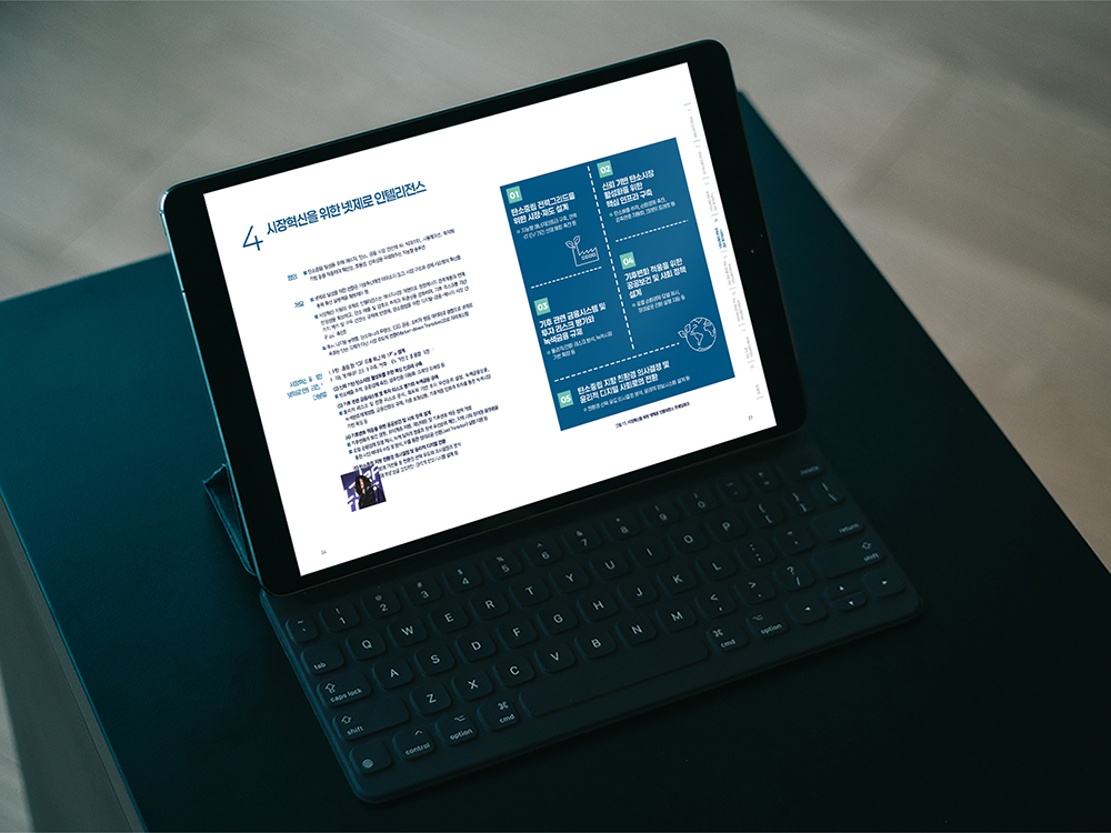 클라이언트 카이스트 | 복잡한 기후변화와 기술 구조도를 핵심 요소 중심으로 정리해 인포그래픽으로 구성했습니다. 각 섹션에 서로 다른 컬러와 명확한 구분 요소를 적용해 내용 흐름이 자연스럽게 보이도록 해 사용자가 필요한 정보를 보다 쉽게 이해하고 단계적으로 파악할 수 있는 구조로 디자인했습니다.
