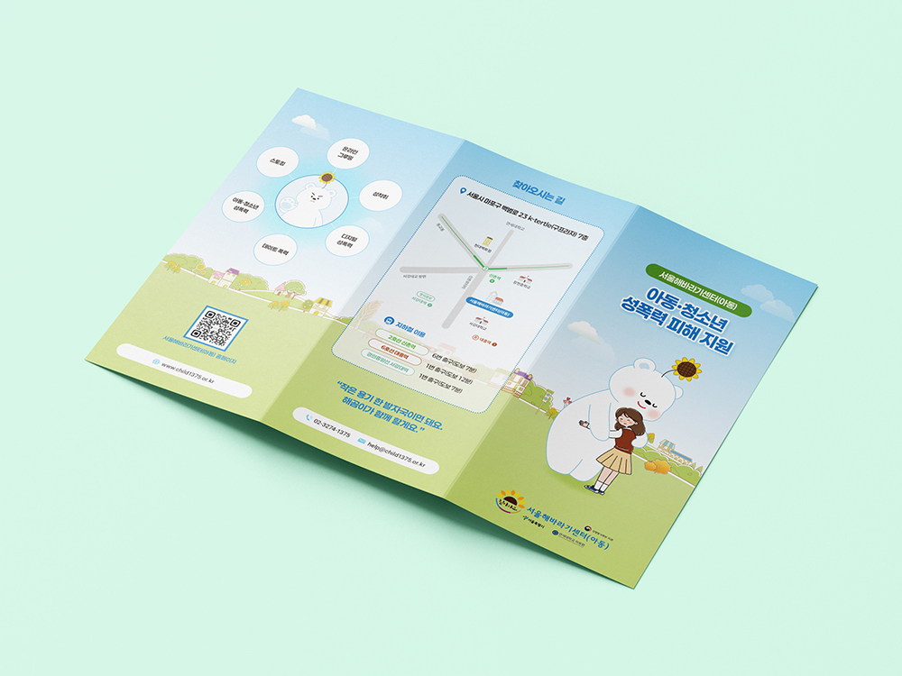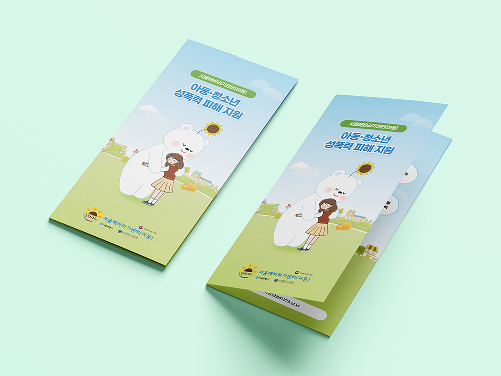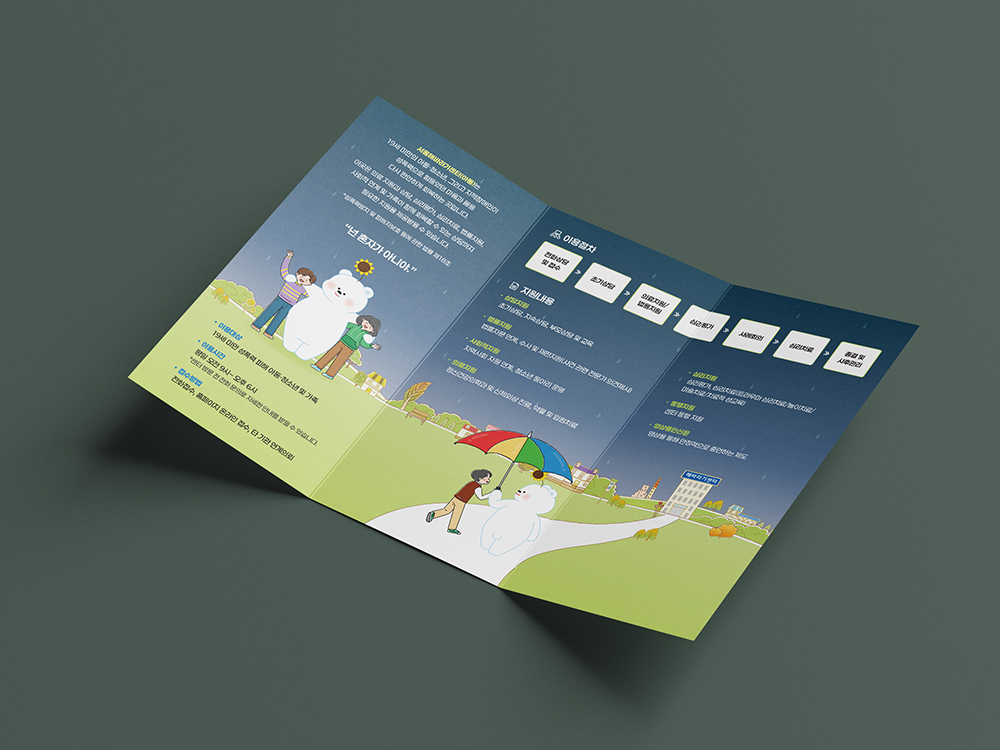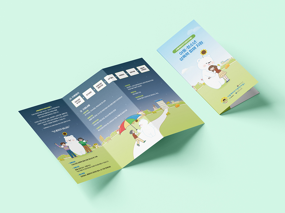 클라이언트 서울해바라기센터 | 앞면은 맑은 날씨, 뒷면은 비가 오는 흐린 날씨로 구성하여 대비를 주었습니다. 이는 해곰이가 아이들과 청소년들을 비 오는 흐린 상황에서 도와주어 다시 맑은 날씨로 나아간다는 의미를 담고 있습니다. 아이들과 청소년, 해곰이의 삽화와 잘 어울리는 배경 이미지를 사용하여 전체적으로 조화롭고 따뜻한 분위기를 표현하였습니다. ![]() ![]() ![]() ![]() |