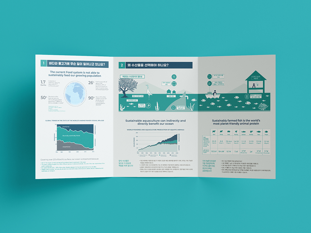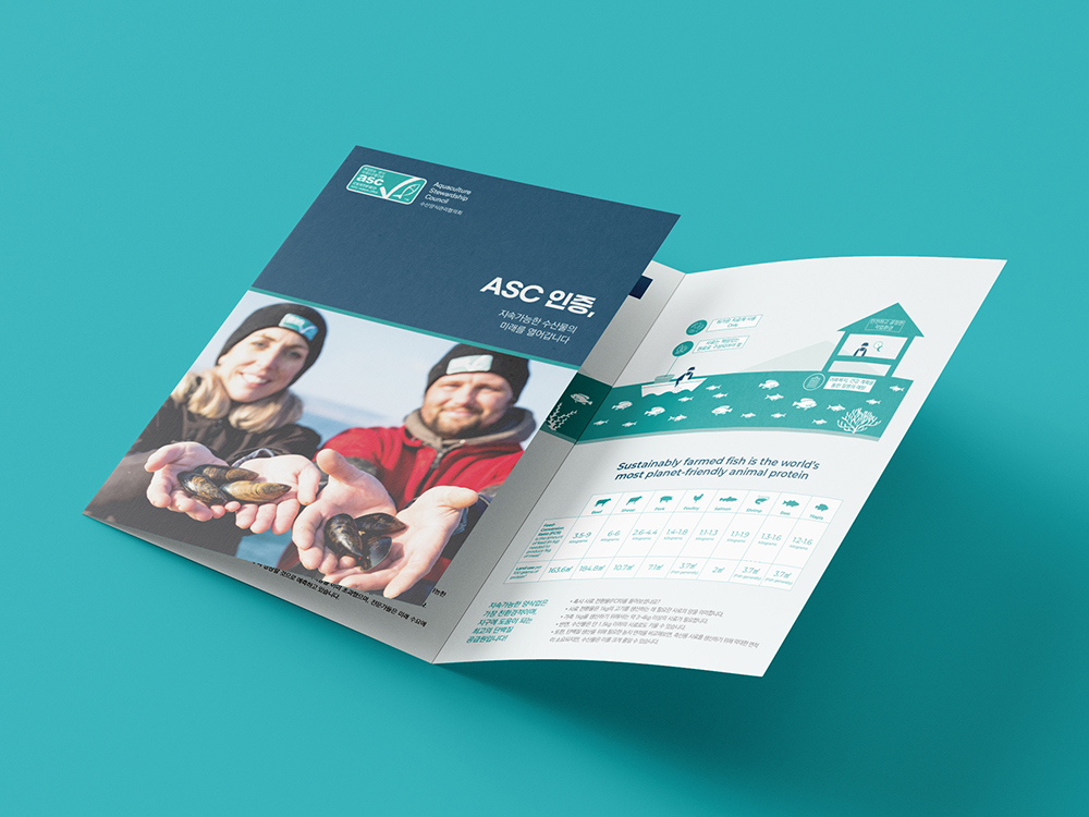 ASC 협회의 로고를 활용한 청록색 계열의 심플한 배경과 사람의 손에 담긴 수산물 이미지를 통해 ‘지속가능성(Sustainability)’과 ‘신뢰성(Certification)’을 시각적으로 전달했습니다. 또한 내지는 기업이 전하고자 하는 메시지를 텍스트 대신 일러스트로 풀어내어 자연스럽게 스토리텔링을 완성했습니다.