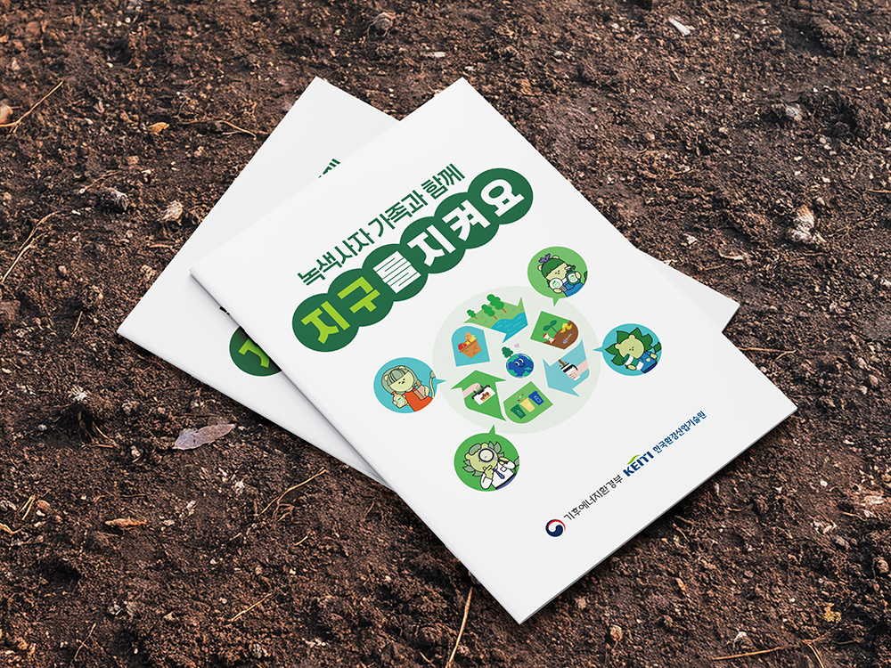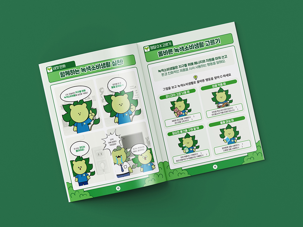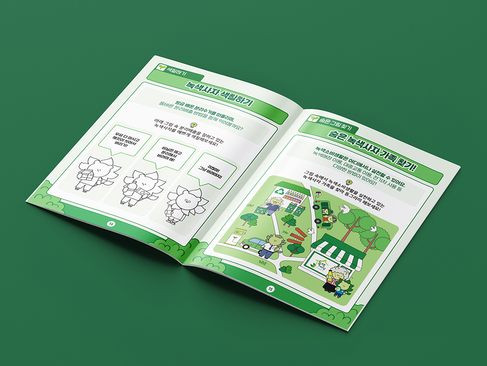 클라이언트 상상연구소 | 교육용 워크북으로 상상연구소에서 만들어진 친근한 캐릭터가 각각의 주제에 맞게 환경 보호, 지속 가능한 생활, 친환경 실천에 대한 스토리를 보여줍니다. 친근한 캐릭터와 명확한 메시지, 순환 구조의 시각화, 자연 친화적 색감을 통해 환경 보호 교육의 가치를 쉽고 재미있게 표현하였습니다.