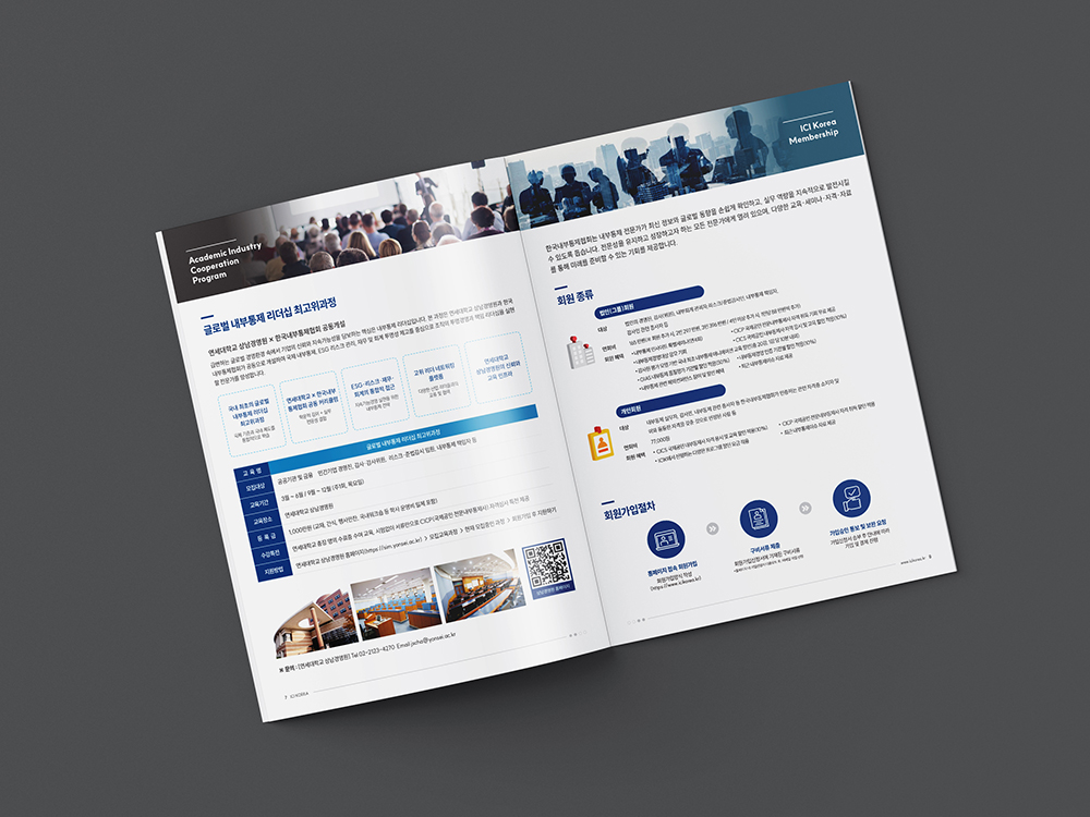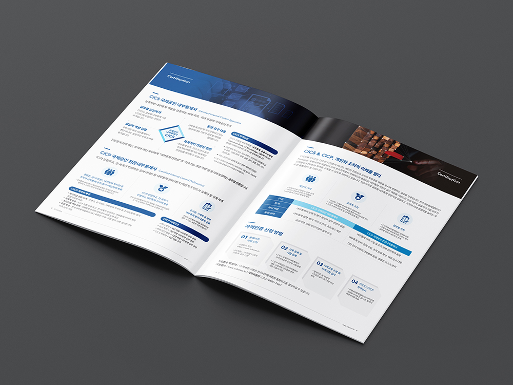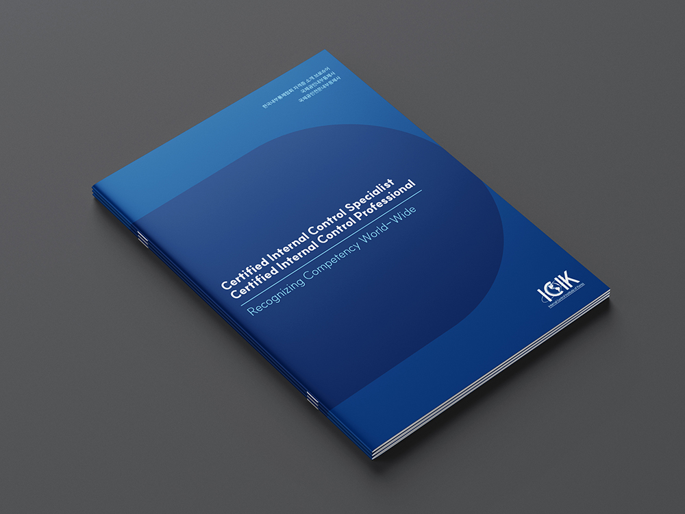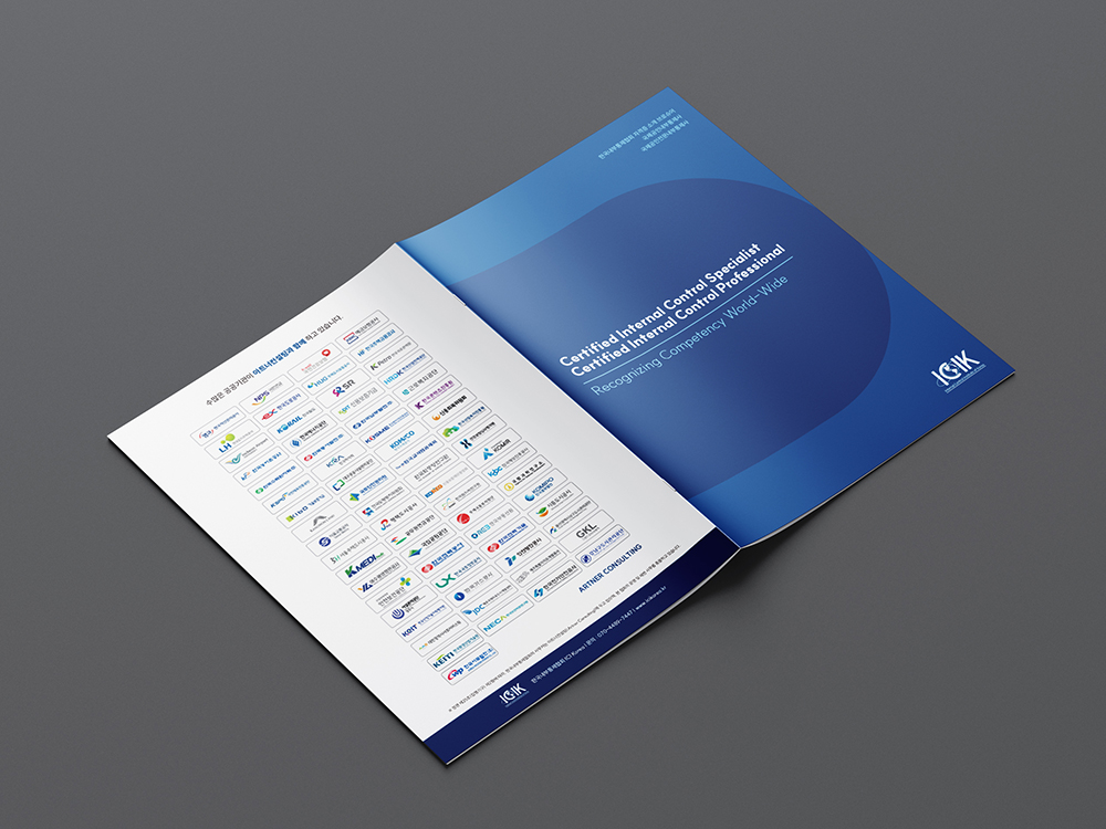 신뢰와 전문성을 상징하는 블루와 골드를 주축으로, 다수의 공공기관 로고를 전면에 배치하여 기관의 공신력을 시각적으로 즉각 증명합니다. 복잡한 내부통제 체계와 자격 요건을 도식화된 다이어그램과 체계적인 표로 정리하여 가독성을 극대화했으며, 군더더기 없는 레이아웃을 통해 전문 교육 및 컨설팅 기관으로서의 정체성을 명확히 전달하고 있습니다.