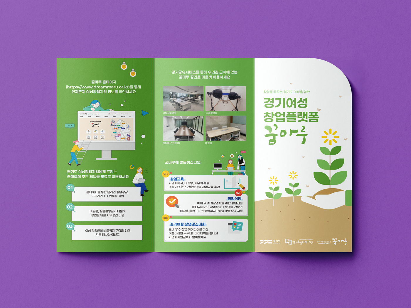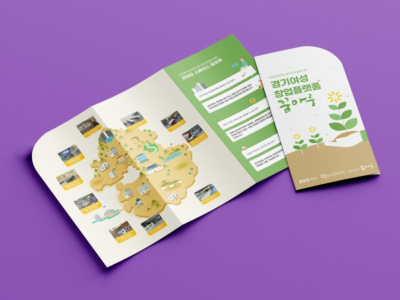 따뜻한 성장의 메시지를 감각적인 일러스트와 따뜻한 컬러 구성을 통해 시각적인 언어로 풀어낸 리플렛 디자인입니다. 새싹과 꽃, 흙을 모티프로 한 일러스트를 메인 비주얼로 내세워 '창업'이라는 시작점을 자연스러운 성장의 이미지와 연결하였으며, 그린 계열의 컬러와 크림 화이트의 조화는 신뢰감과 동시에 부드러운 친근함을 전달해줍니다.