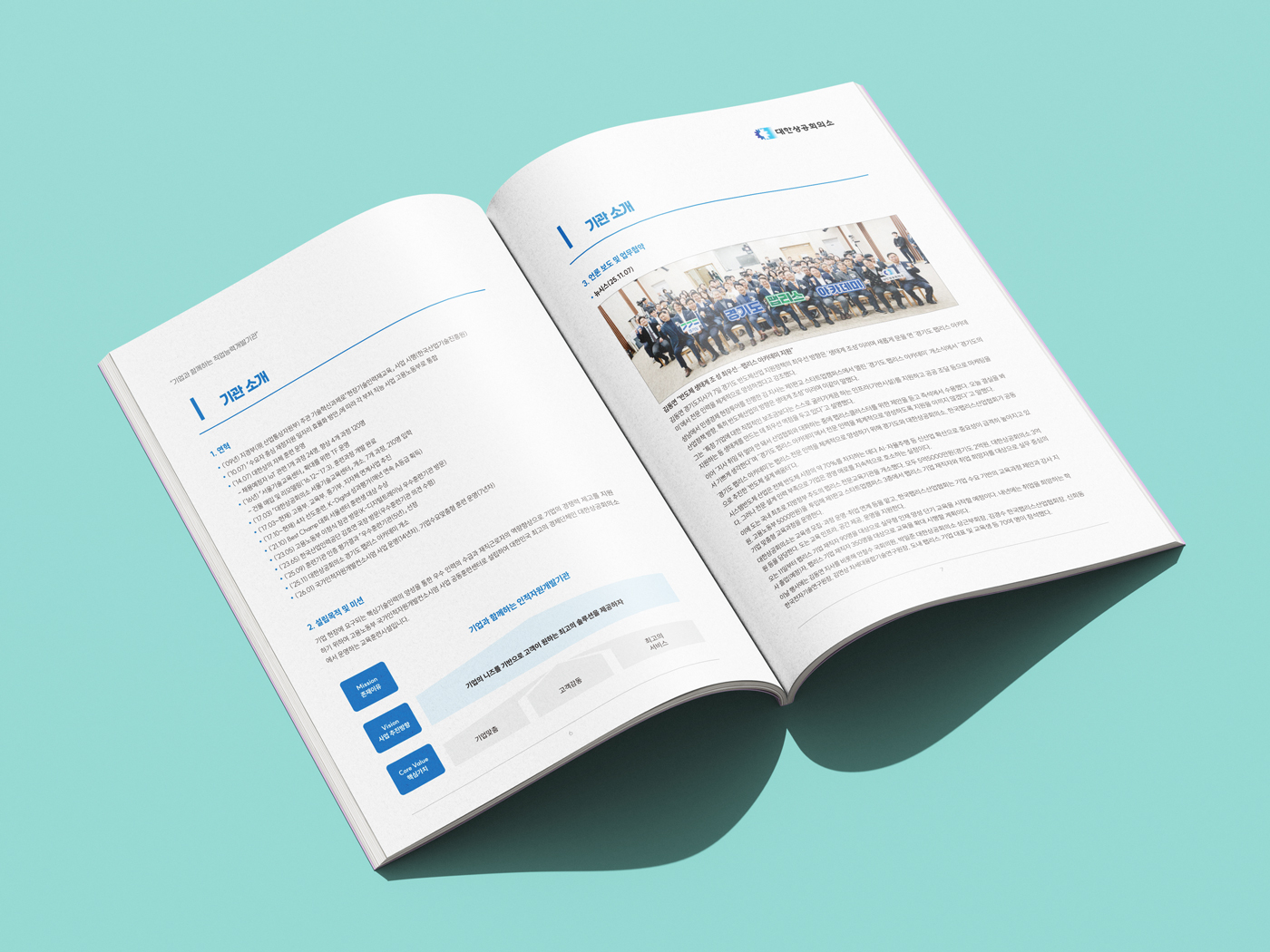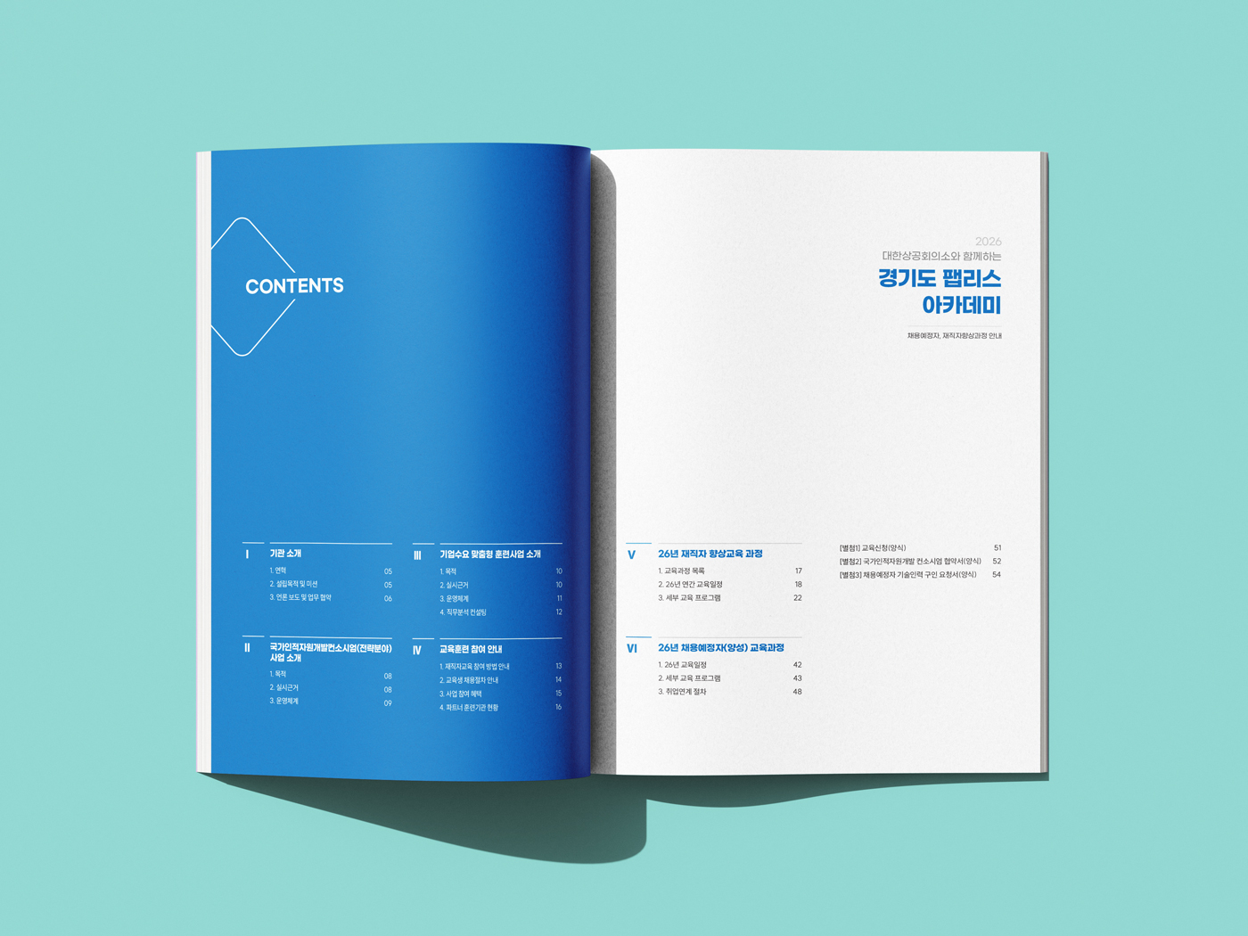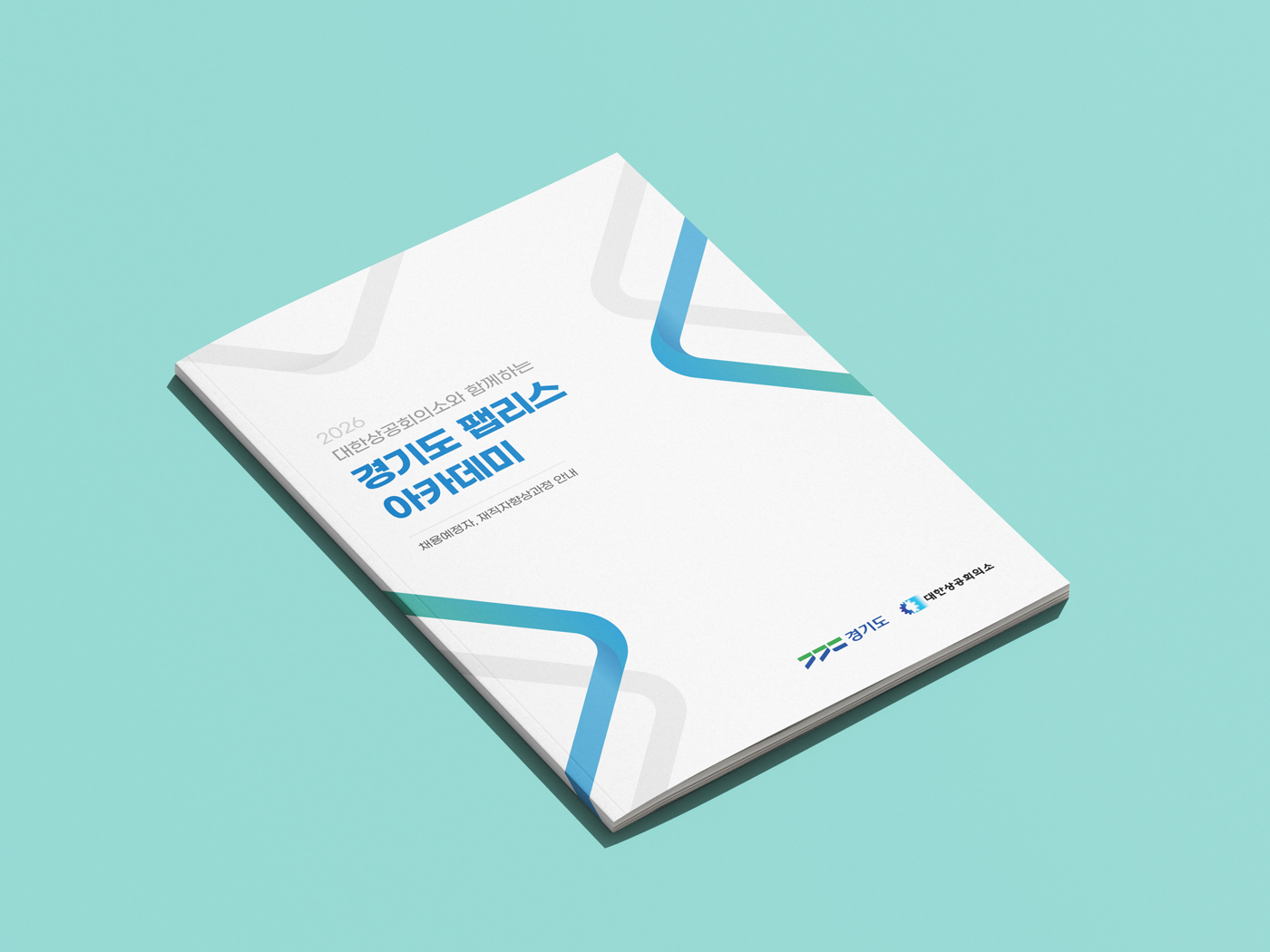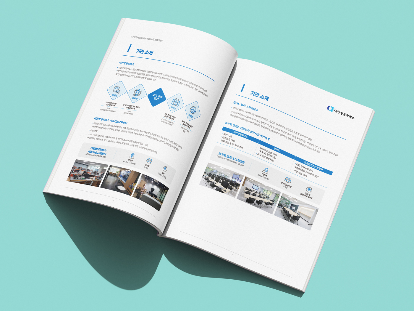클라이언트 대한상공회의소 | 블루 컬러의 신뢰감을 깔끔한 레이아웃으로 구성한 브로슈어 디자인입니다. 다이아몬드와 사선 형태의 도형을 표지부터 내지까지 일관되게 적용해 통일성을 높였으며, 화이트 베이스 위에 일부 포인트 컬러 요소들을 활용해 공공기관 특유의 전문성과 현대적 감각을 동시에 전달하였습니다.