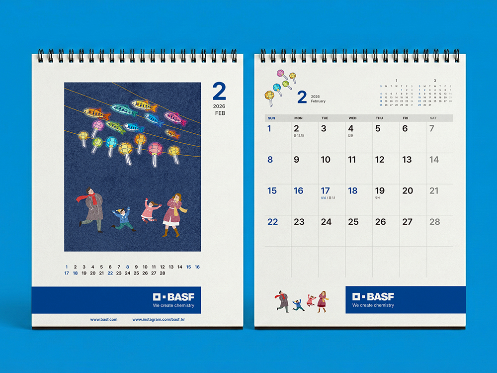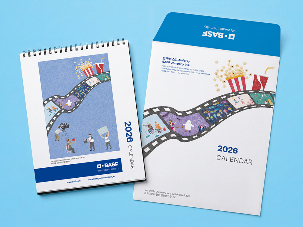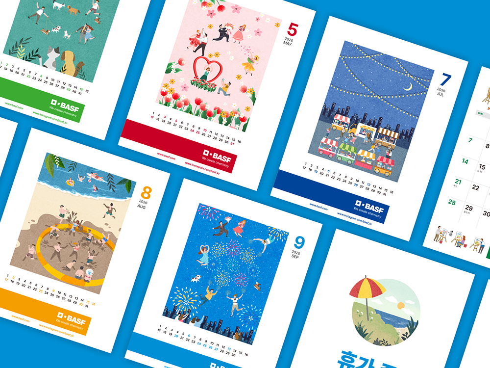 클라이언트 한국바스프 디자인품목 탁상캘린더 제작연도 2025 | 사계절 축제의 생동감을 담은 따뜻한 일러스트를 더한 탁상 캘린더입니다. 가독성에 집중한 베이직한 월간 레이아웃 위에 해당 월의 일러스트 일부를 자연스럽게 배치해 전체적인 통일감을 살렸습니다. 또한 휴가 및 출장 안내 페이지를 함께 구성해 실용성과 활용도를 한층 높였습니다.