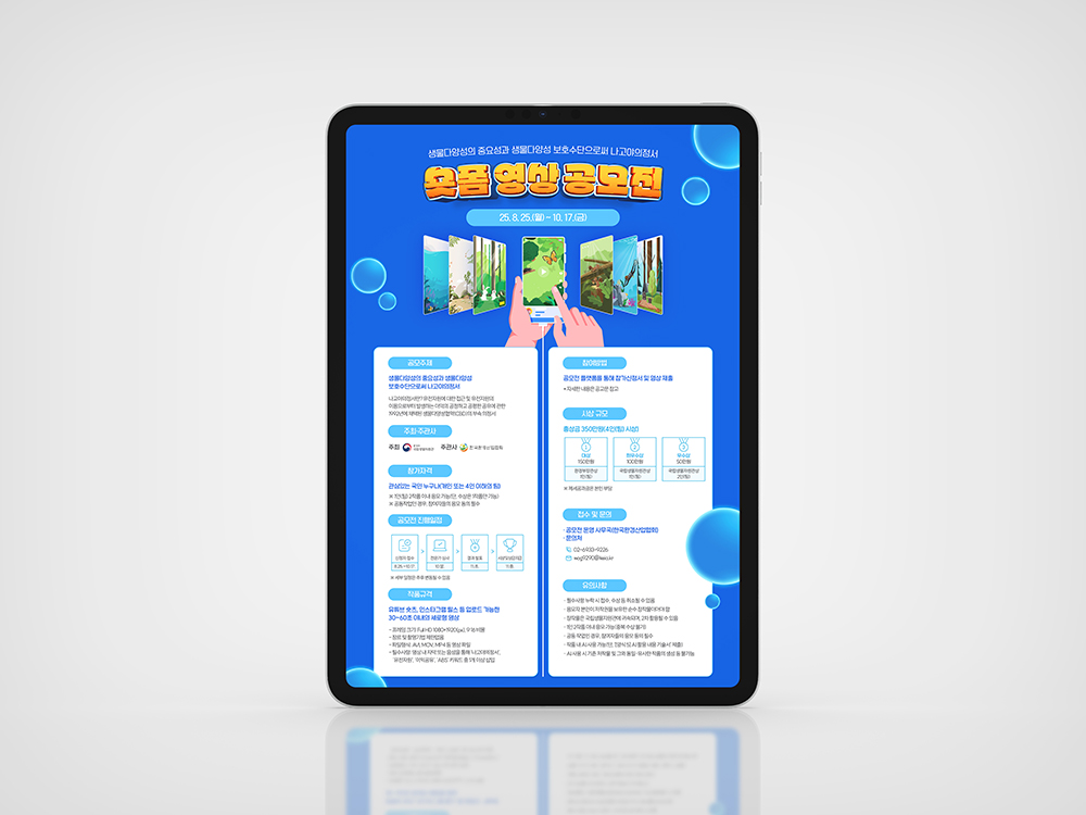 클라이언트 한국환경산업협회 | 유전자원을 주제로 한 숏폼 공모전임을 한눈에 인지할 수 있도록, 핵심 키워드를 전면에 배치한 직관적인 홍보물입니다. 스마트폰 화면과 세로형 영상 구성을 시각화해 ‘숏폼 영상 공모전’이라는 참여 방식을 명확하게 전달했습니다. 생동감 있는 컬러와 다양한 생태 일러스트를 활용해 공모 주제의 의미를 쉽고 친근하게 풀어낸 디자인입니다. ![]() ![]() ![]() |