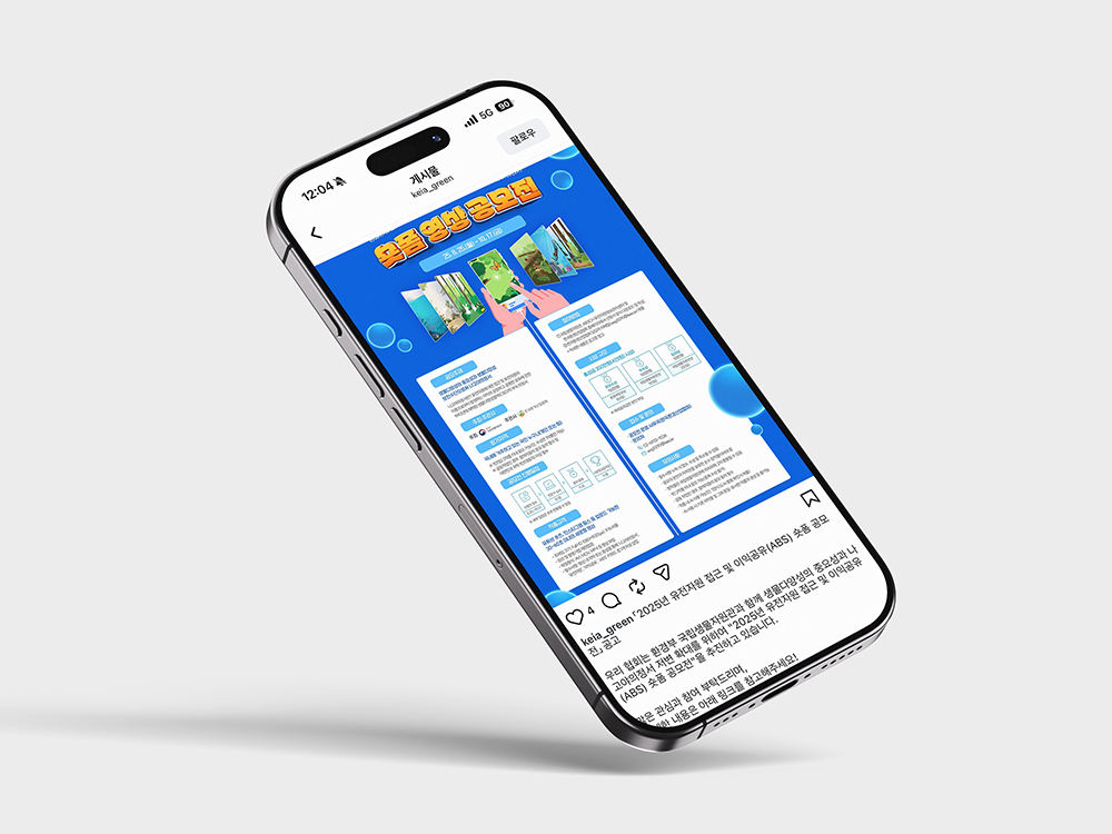 유전자원을 주제로 한 숏폼 공모전임을 한눈에 인지할 수 있도록, 핵심 키워드를 전면에 배치한 직관적인 홍보물입니다. 스마트폰 화면과 세로형 영상 구성을 시각화해 ‘숏폼 영상 공모전’이라는 참여 방식을 명확하게 전달했습니다. 생동감 있는 컬러와 다양한 생태 일러스트를 활용해 공모 주제의 의미를 쉽고 친근하게 풀어낸 디자인입니다.
