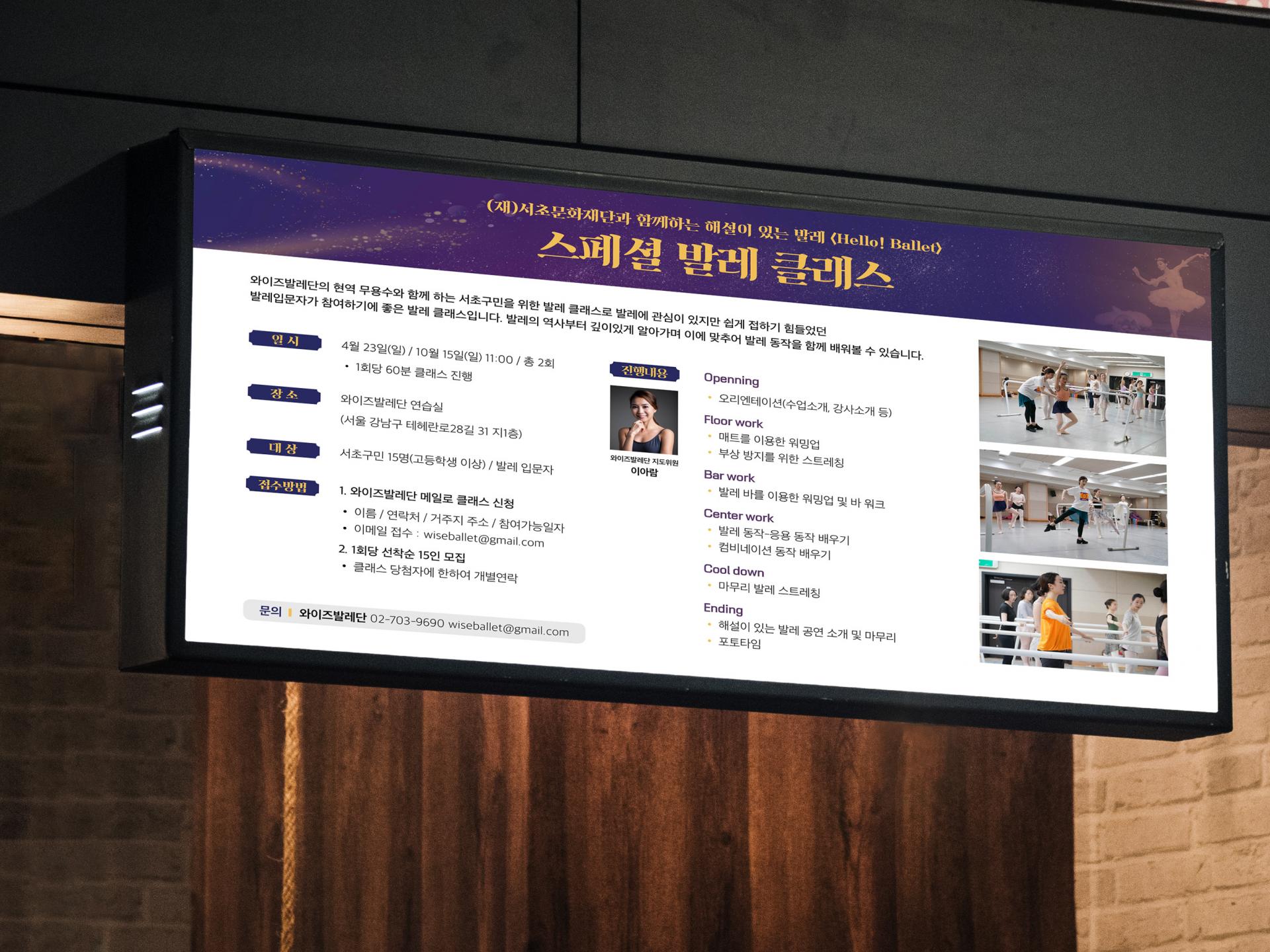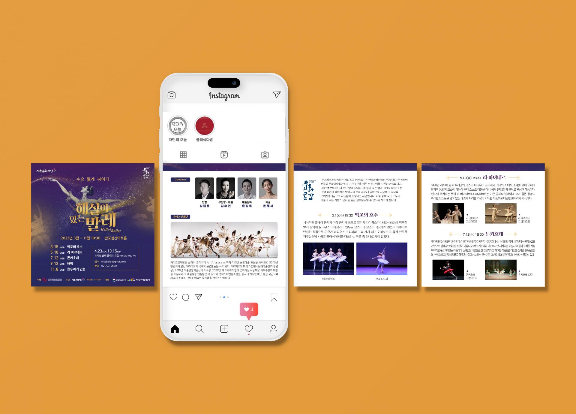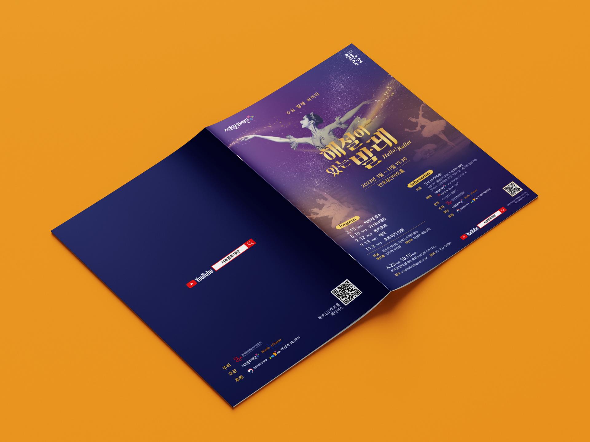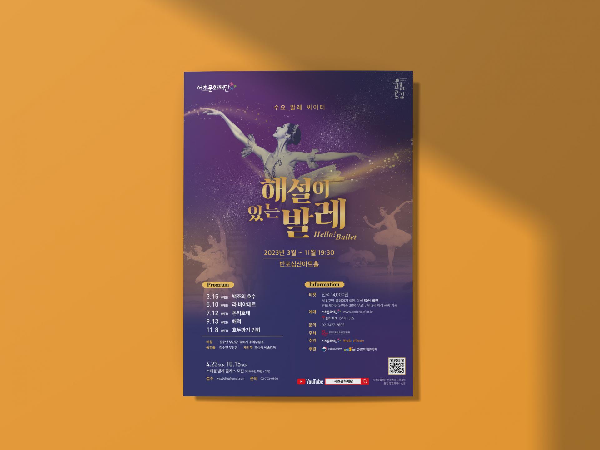 서초문화재단에서 매해 열리는 발레 공연 행사 제반 홍보물입니다. 발레의 화려함과 우아함을 모두 담을 수 있는 다크퍼플+골드톤에 은하수 요소를 추가해 신비로움을 더하고, 공연 실황 이미지를 배경에 자연스럽게 녹아들도록 가공해 현장의 분위기를 함께 전달하고자 했습니다.