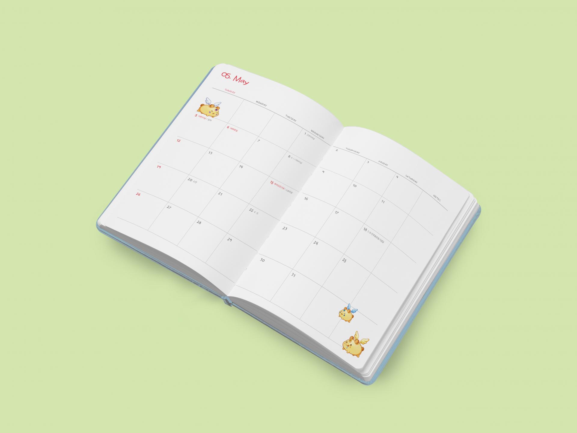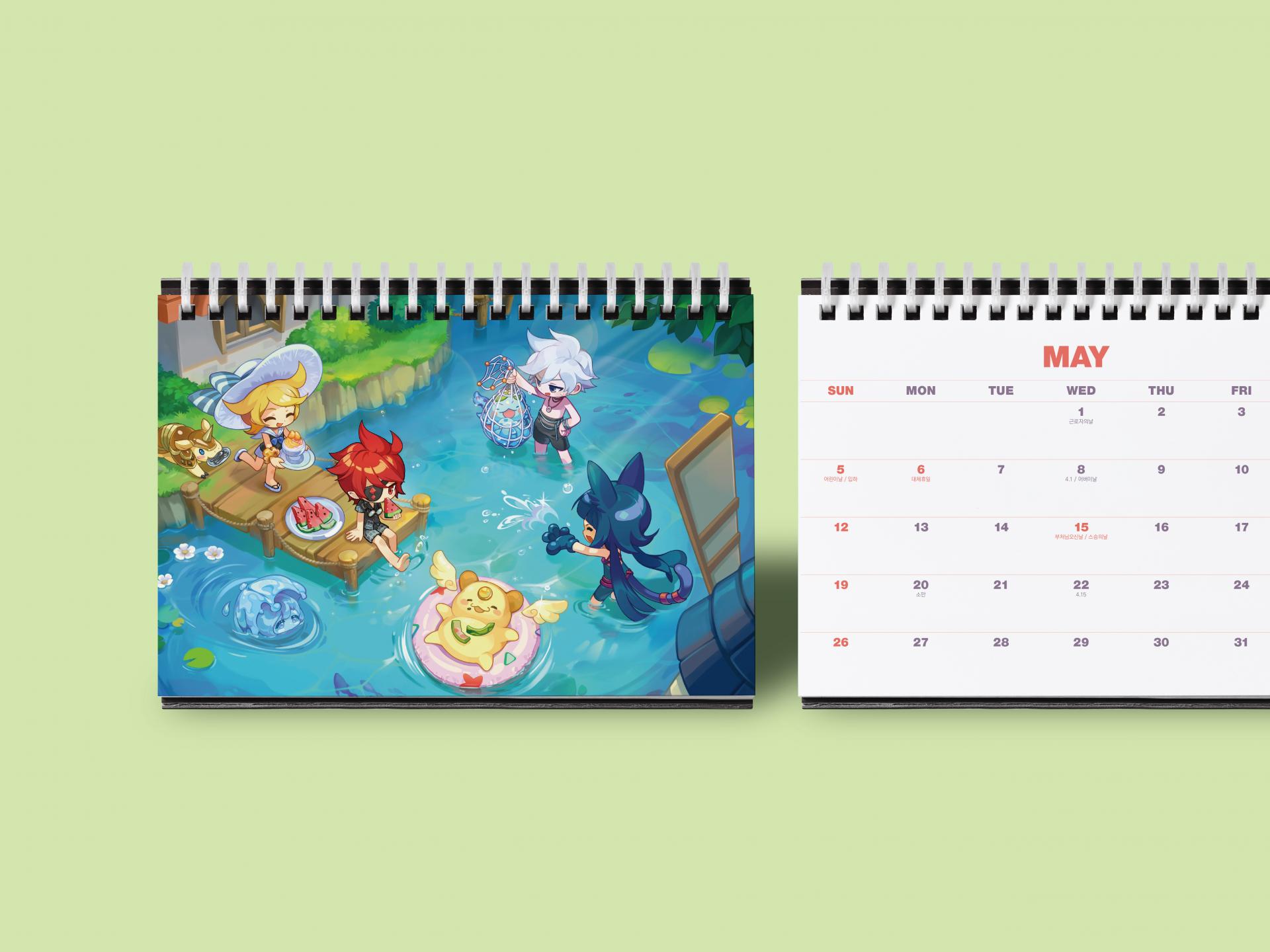클라이언트 액토즈소프트 디자인품목 다이어리, 탁상캘린더 제작연도 2023 | 각 월마다 색을 달리한 원색 월판과 라테일 게임 일러스트가 잘 조화된 에코링 후가공의 컬러풀한 탁상 캘린더와 하단에 캐릭터 불박 가공으로 포근하고 귀여운 느낌을 더한 파스텔 컬러 다이어리로 구성된 시즌물입니다. 유저들을 고려한 톤앤매너와 친환경 요소를 모두 만족하는 핸디한 사이즈의 굿즈입니다.