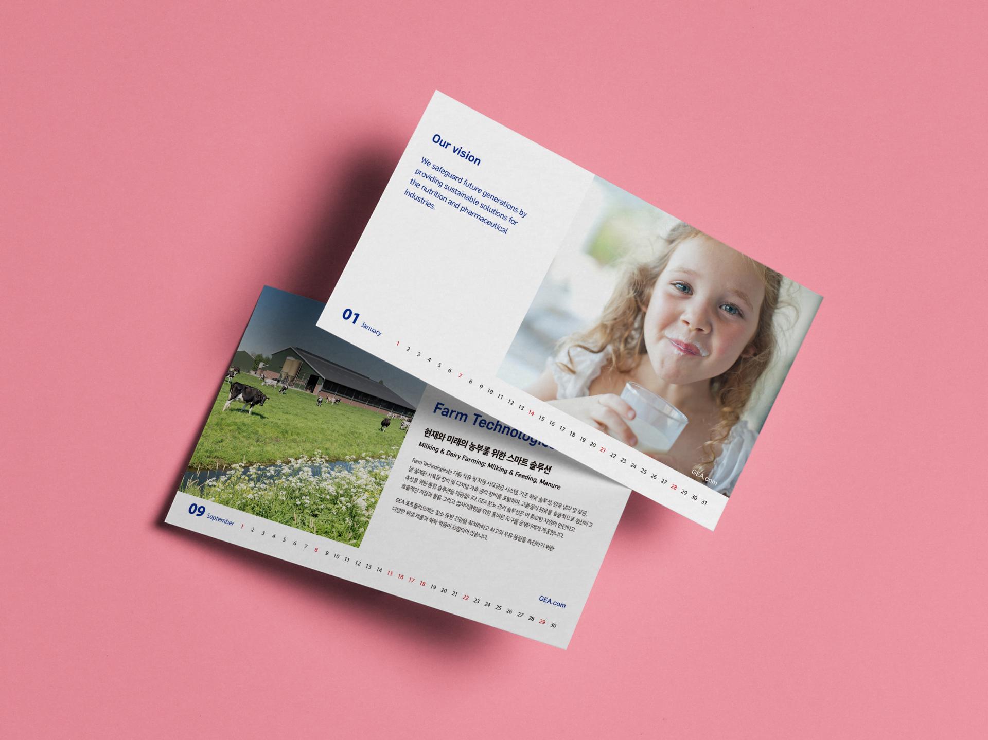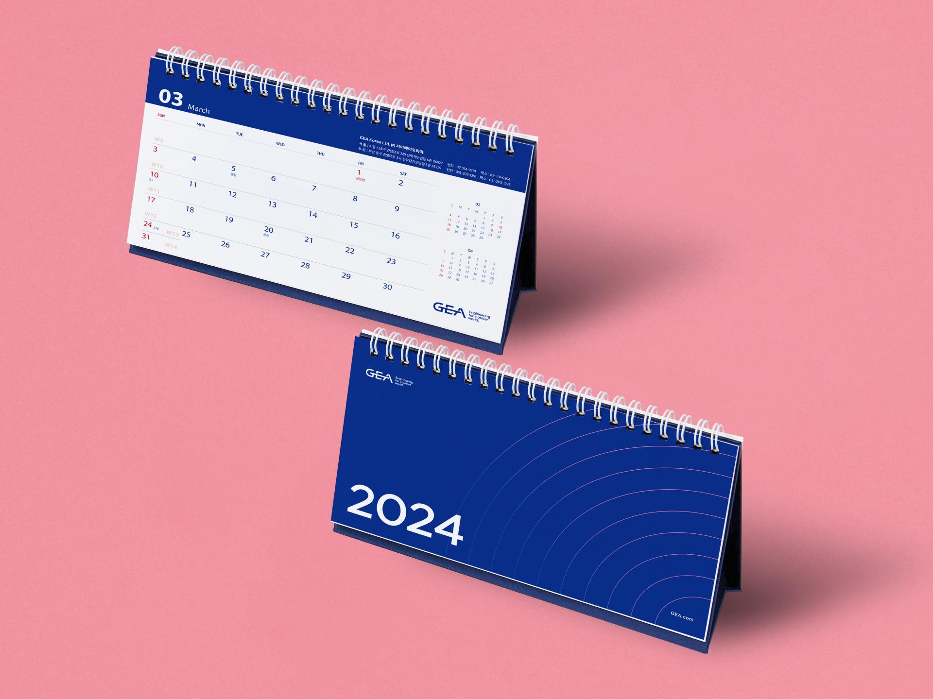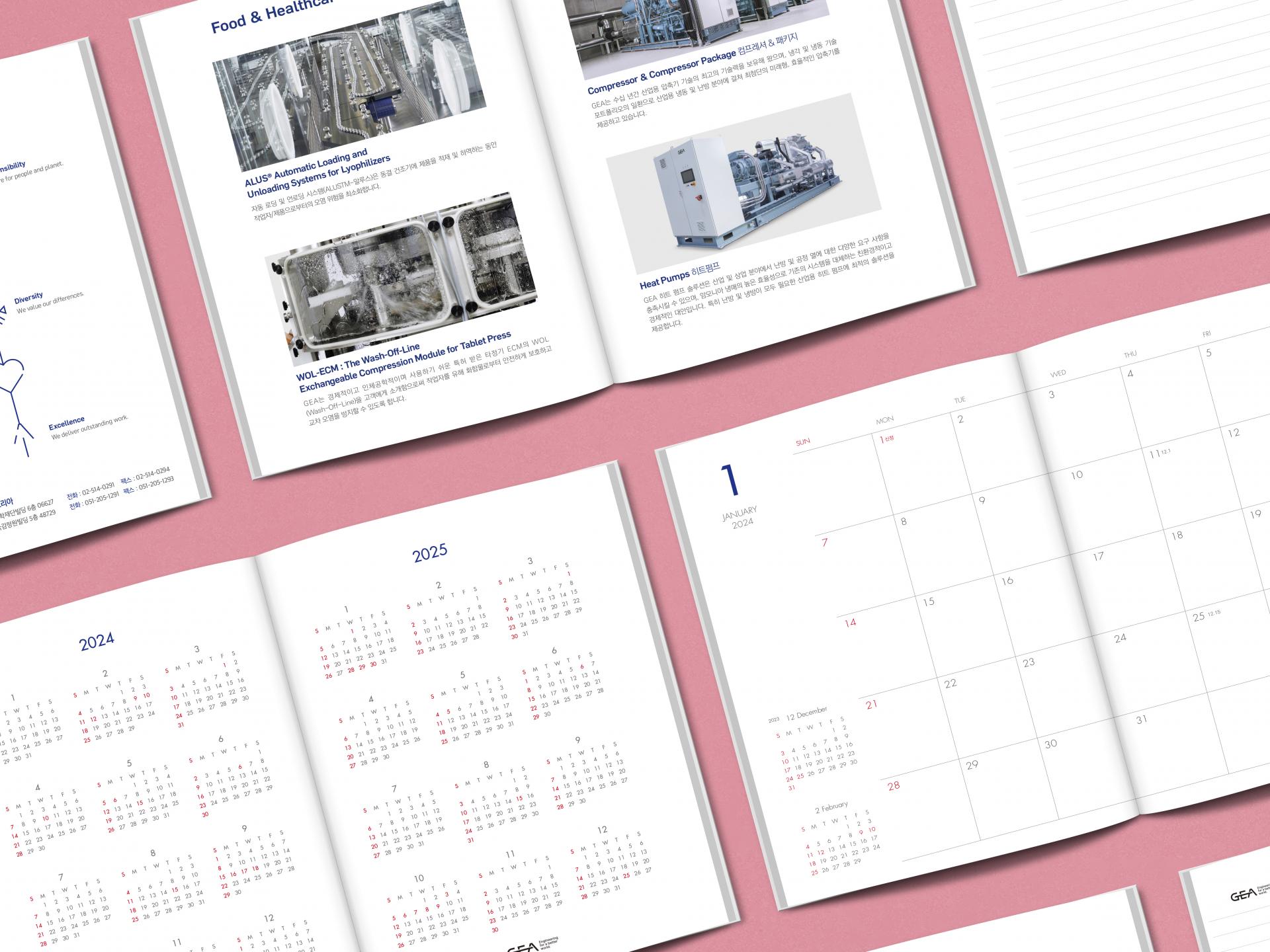GEA코리아의 메인 블루 컬러를 표지에 일괄 적용해 통일성이 돋보이는 시즌물입니다. 깔끔한 레이아웃과 패브릭 커버로 사용 편의를 높인 다이어리는 매카닉한 은박 후가공으로 포인트를 더했습니다. 탁상 캘린더에는 자연, 매카닉, 비지니스 등 여러 주제의 사진 이미지를 삽입해 다양한 분위기를 연출했습니다.