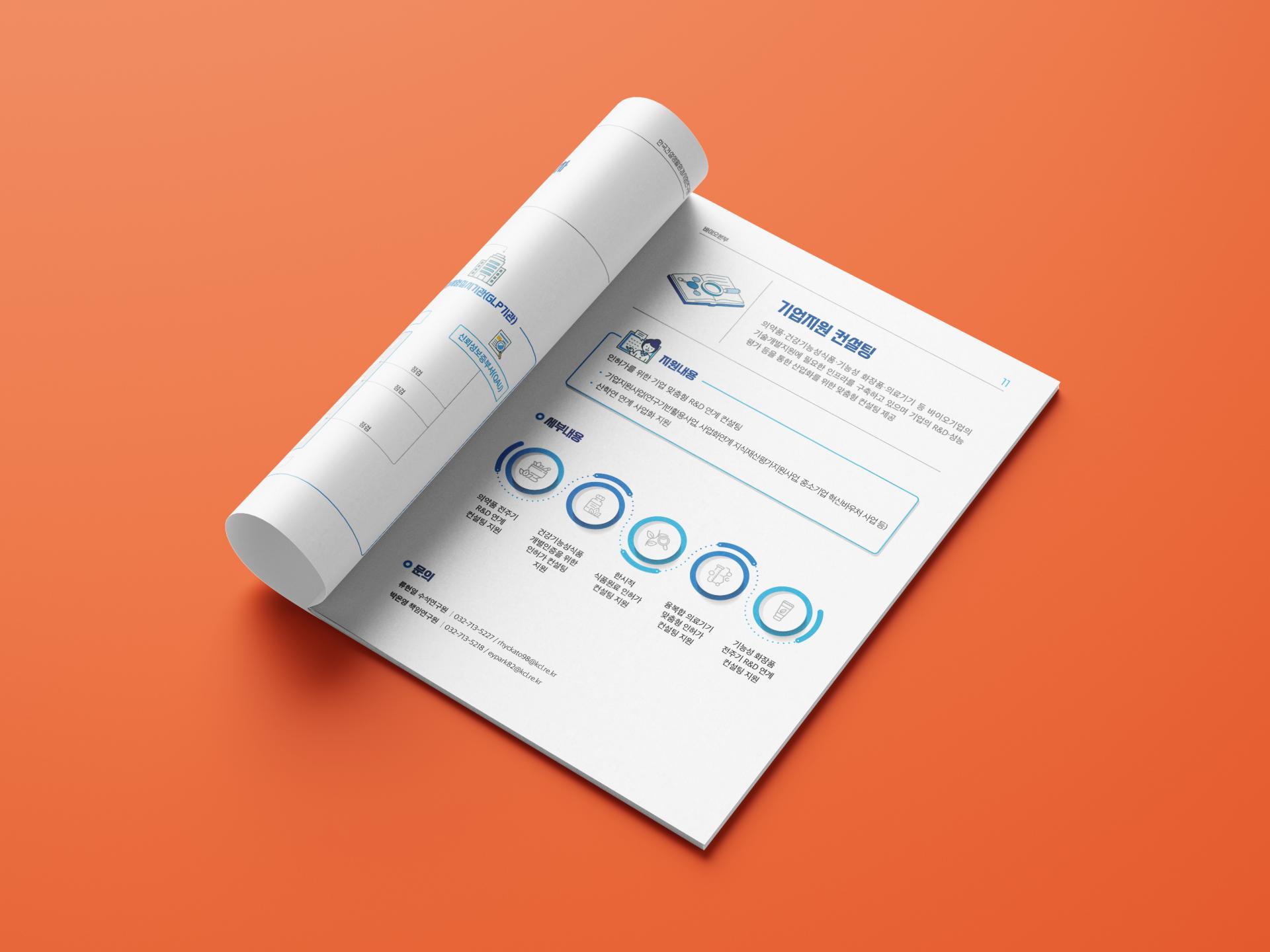 아이콘 일러스트 + 옅은 블루톤 조합으로 생명공학의 진지하고 무거운 느낌 대신 가볍고 경쾌한 분위기를 담은 바이오센터 소개 브로셔입니다. 내지의 통일된 레이아웃은 컨텐츠 가독성을 더욱 높여 줍니다.
