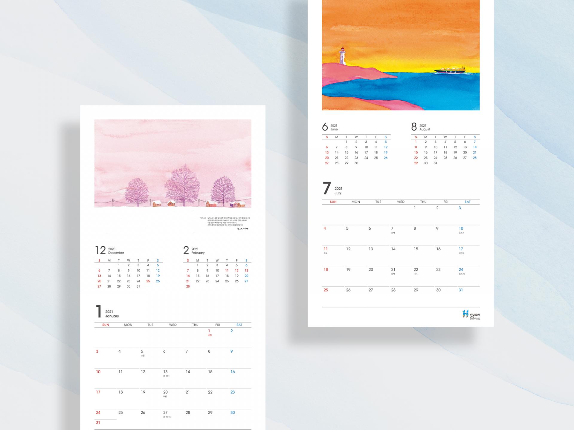 일러스트 수채화 작가 제이킴의 작품을 활용하여 4계절 바다 풍경이 담긴 캘린더 세트를 디자인하였습니다. 감성적이고 다채롭게 표현된 색채는 현대 최초의 선박 Hyundai Utopia의 선구자 정신을 표현하고 있으며, 푸른 바다는 다양한 항해를 영위하는 현대LNG의 활동을 상징합니다. 여백을 충분히 준 깔끔한 레이아웃으로 풍경화를 강조하였고, 벽걸이 캘린더는 전후월을 크게 배치하여 실용성을 높였습니다.