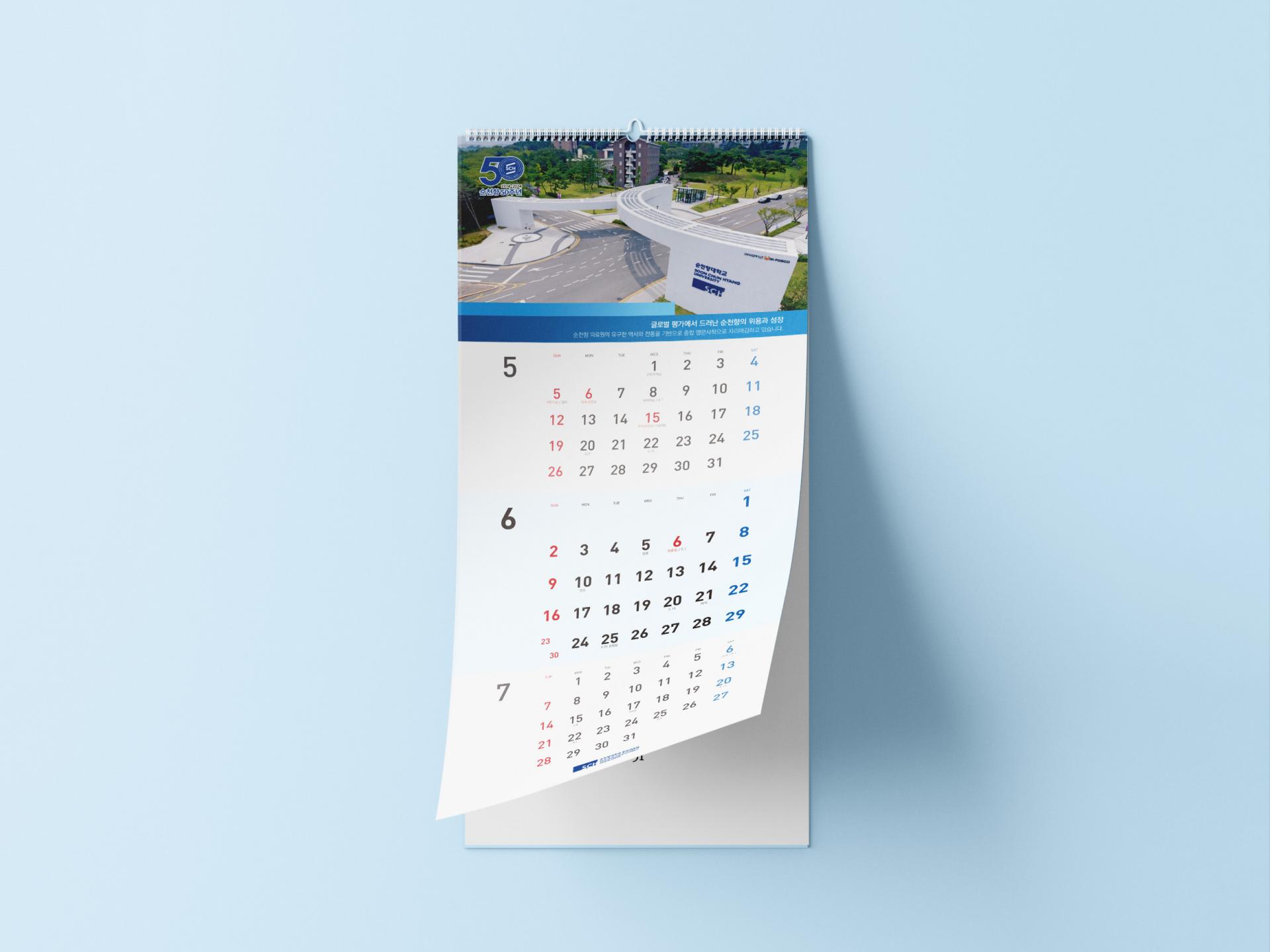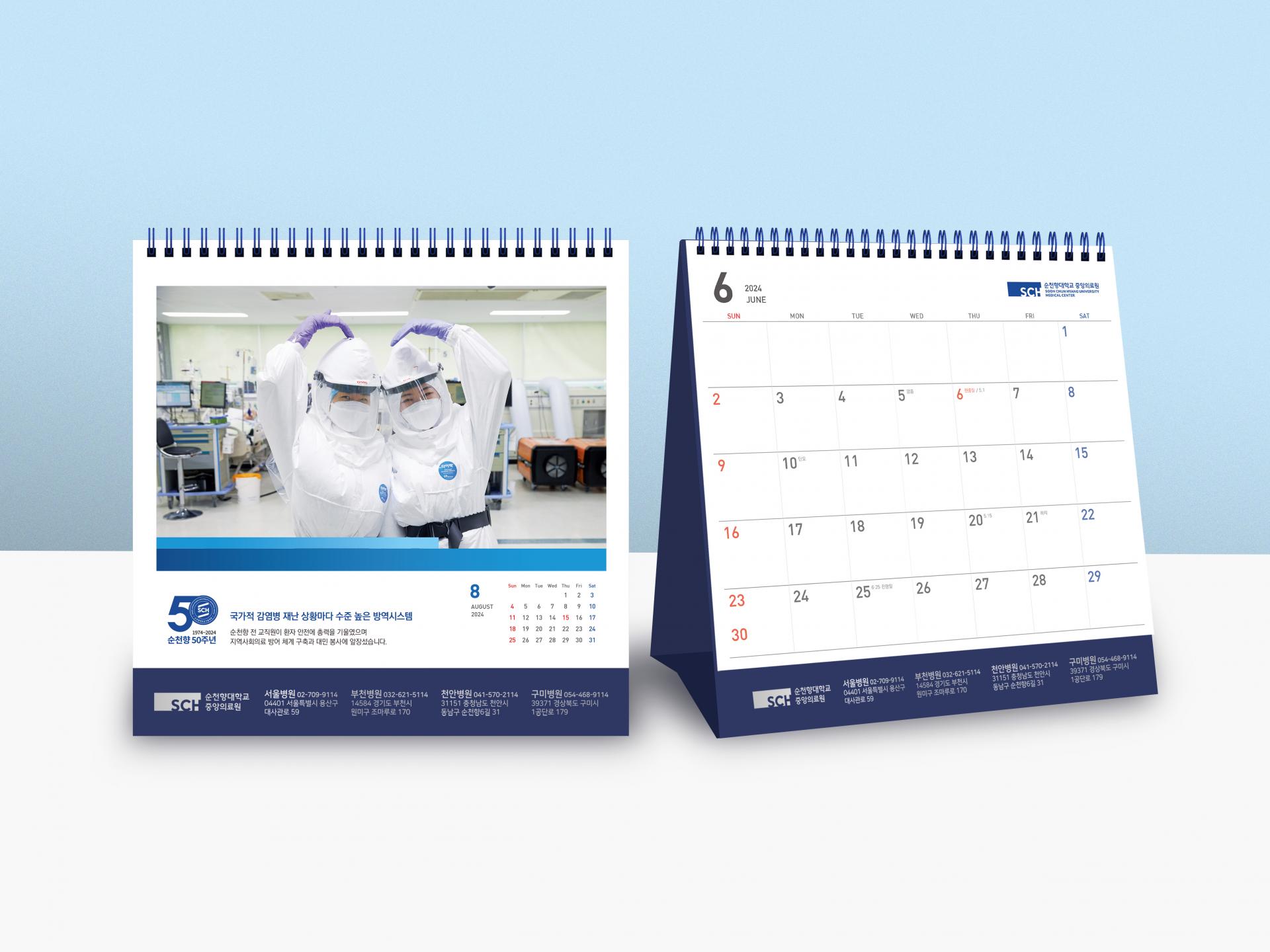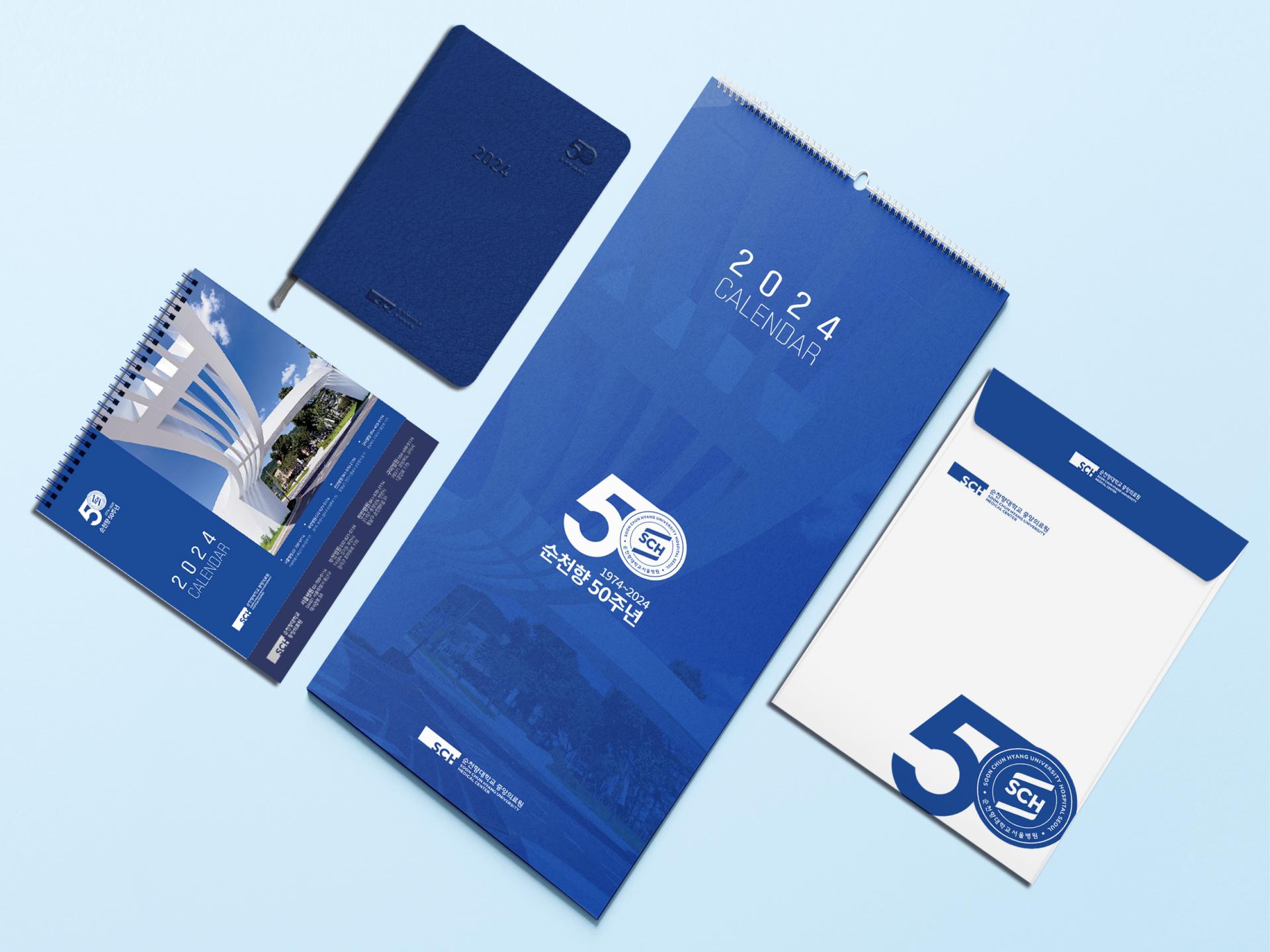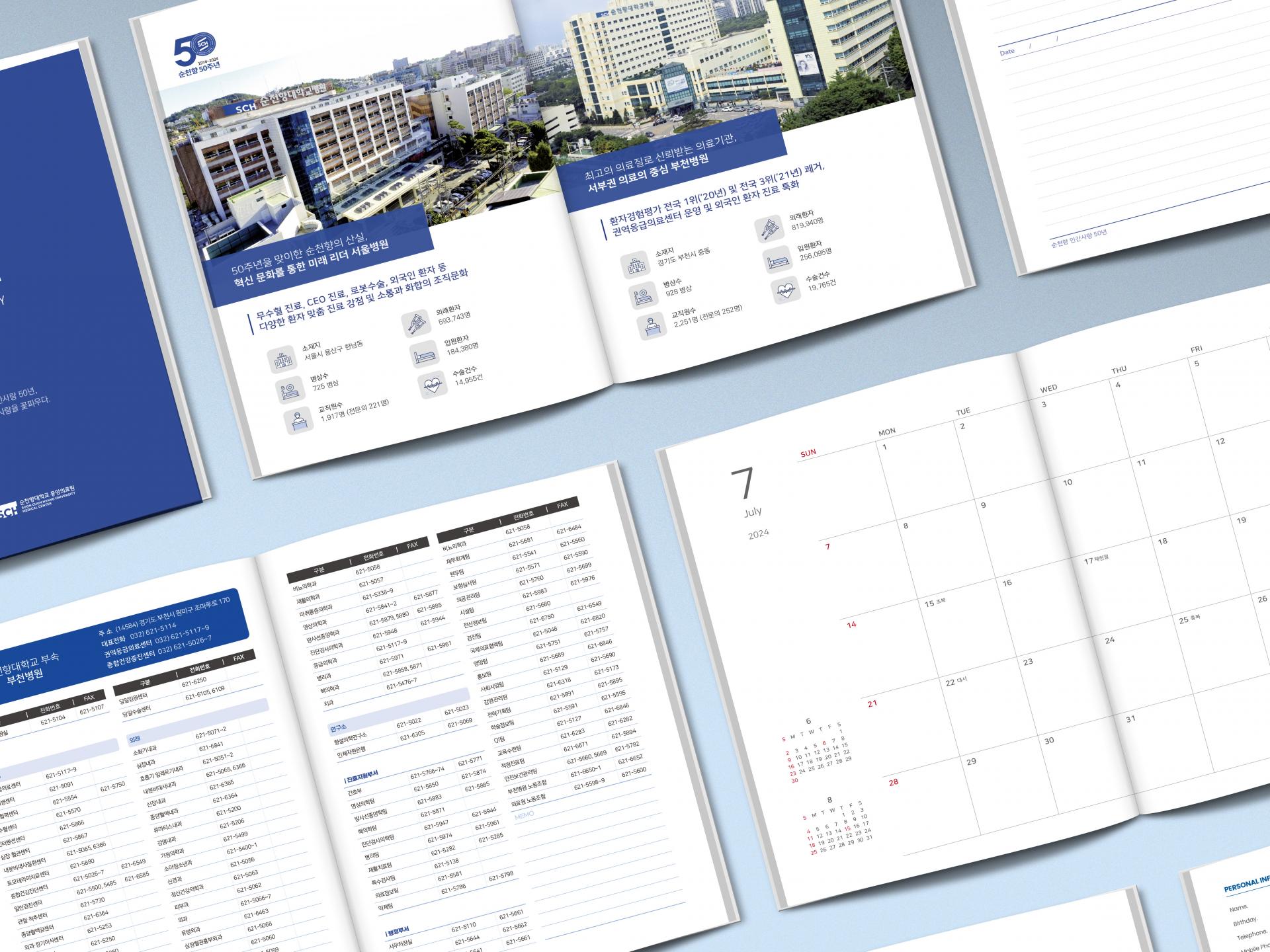 고유 블루 컬러와 50주년 엠블럼, 실제 의료 현장 및 의료원 전경 이미지 등을 활용해 순천향대학교가 걸어온 50년과 앞으로의 비전을 표현했습니다. 일년 내내 사용하는 만큼 전체적인 가독성, 사용성에 중점을 둔 실용적인 시즌물 세트입니다.
