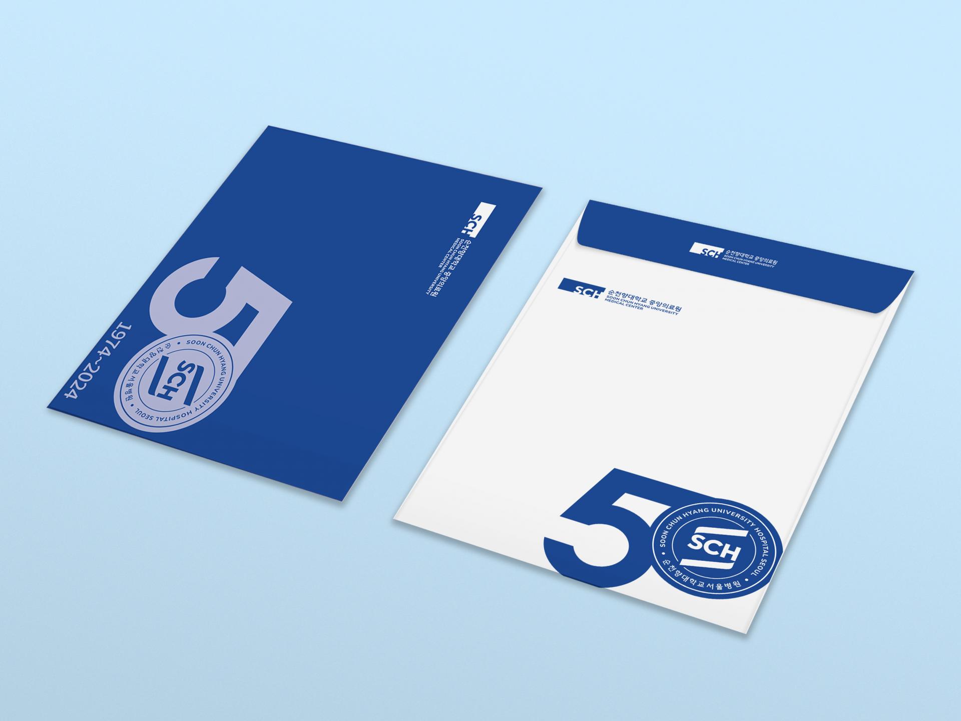 클라이언트 순천향대학교 중앙의료원 디자인품목 벽걸이/탁상캘린더, 다이어리, 봉투 제작연도 2023 | 고유 블루 컬러와 50주년 엠블럼, 실제 의료 현장 및 의료원 전경 이미지 등을 활용해 순천향대학교가 걸어온 50년과 앞으로의 비전을 표현했습니다. 일년 내내 사용하는 만큼 전체적인 가독성, 사용성에 중점을 둔 실용적인 시즌물 세트입니다.