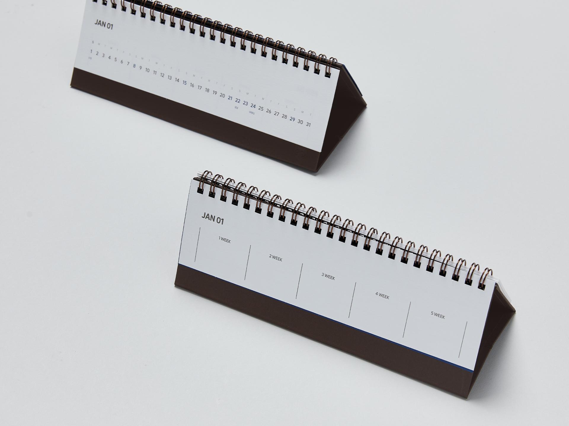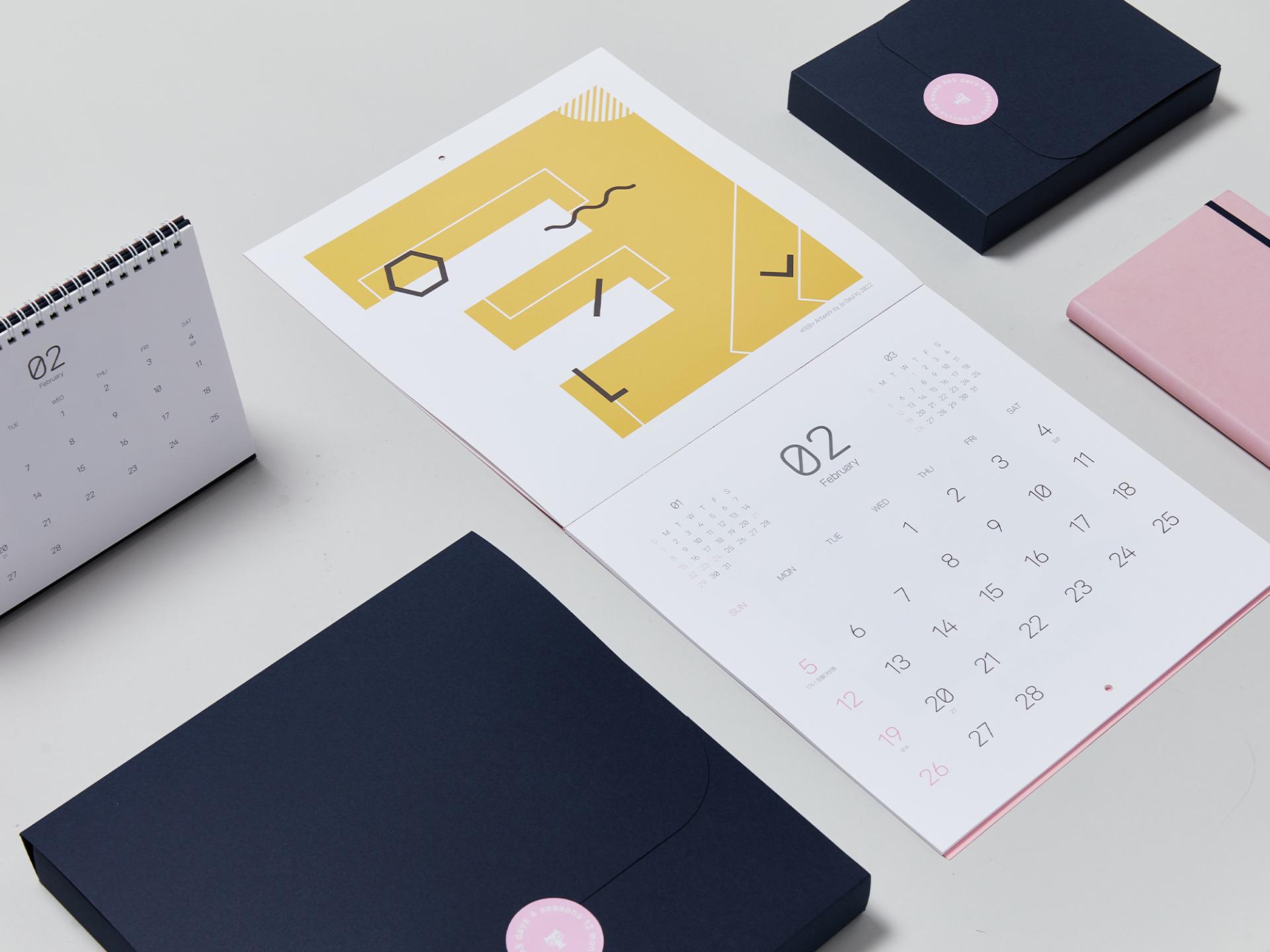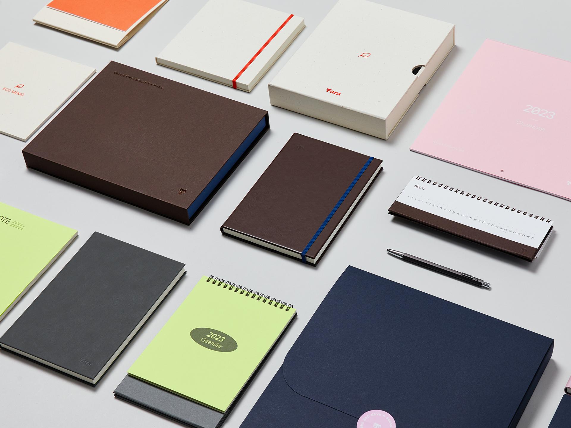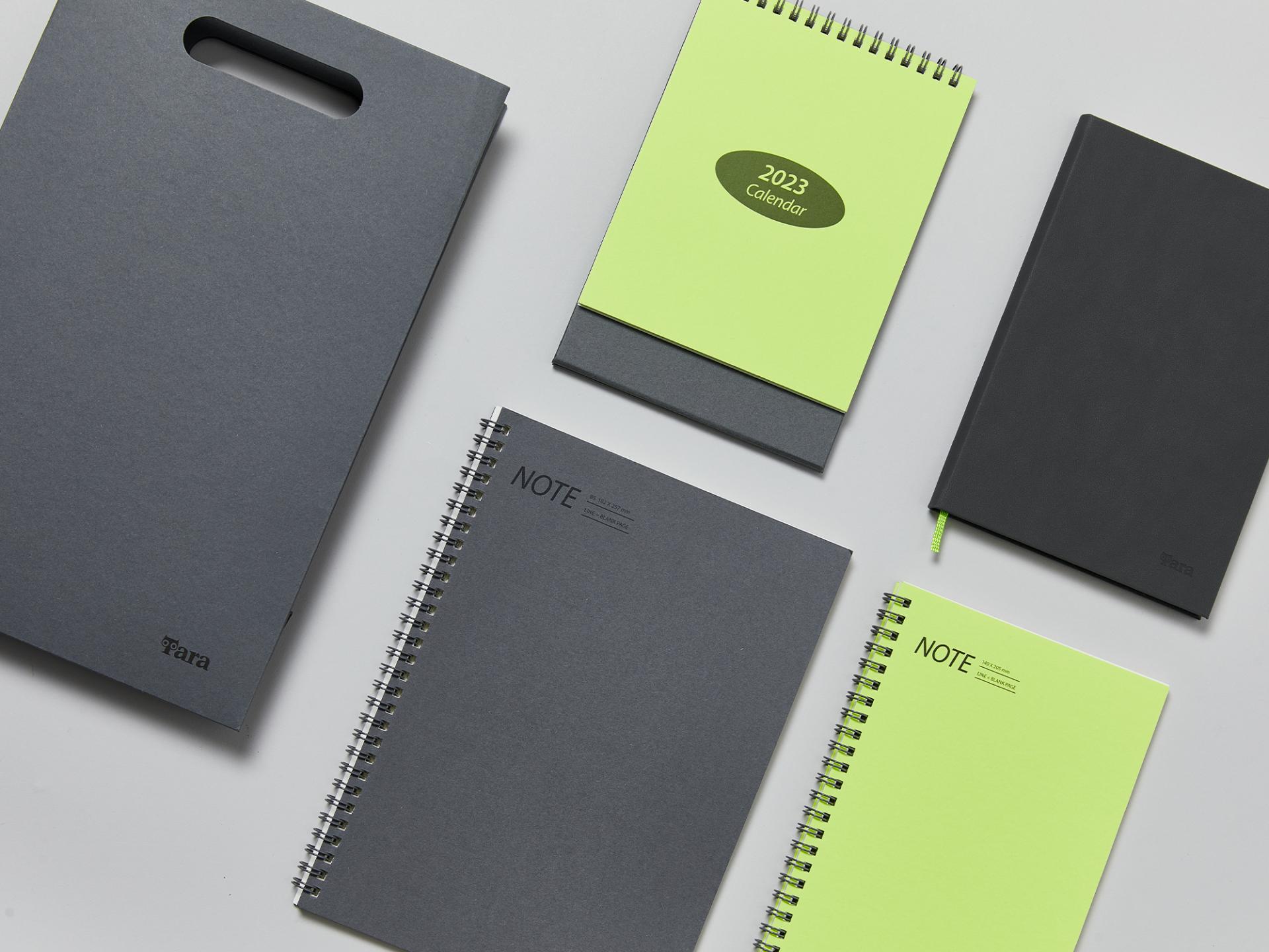 프리미엄 사양의 VIP 패키지, 지속가능성을 추구한 친환경 패키지, 기본을 잘 담아낸 스탠다드 패키지, 모던함을 강조한 라이트 패키지로 다양한 니즈를 고려하여 제작된 다이어리 캘린더 세트입니다. 채도가 높은 원 포인트 컬러를 사용하여 트렌디한 느낌을 주고, 기본 사이즈는 물론 가로형, 정사각형 등 개성 있는 다양한 내지 디자인으로 차별성을 두었습니다.