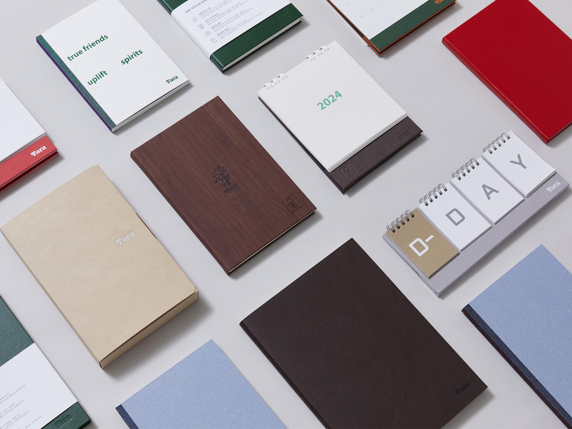 2024년 시즌물 세트는 원료의 결이 그대로 살아있는 Forest Stewardship Council® (FSC®, 국제산림관리협회)의 인증 용지로 제작한 패키지, 친환경 한지 PU, 후가공까지 넓은 범위의 머터리얼로 구성되었습니다. 만년 다이어리 형태를 다수 채택해 해가 지나도 오랜 사용이 가능하며, 사이즈와 스케줄러 레이아웃, 컬러를 다양하게 적용해 실용성, 디자인 측면의 장점을 부각시켰습니다.