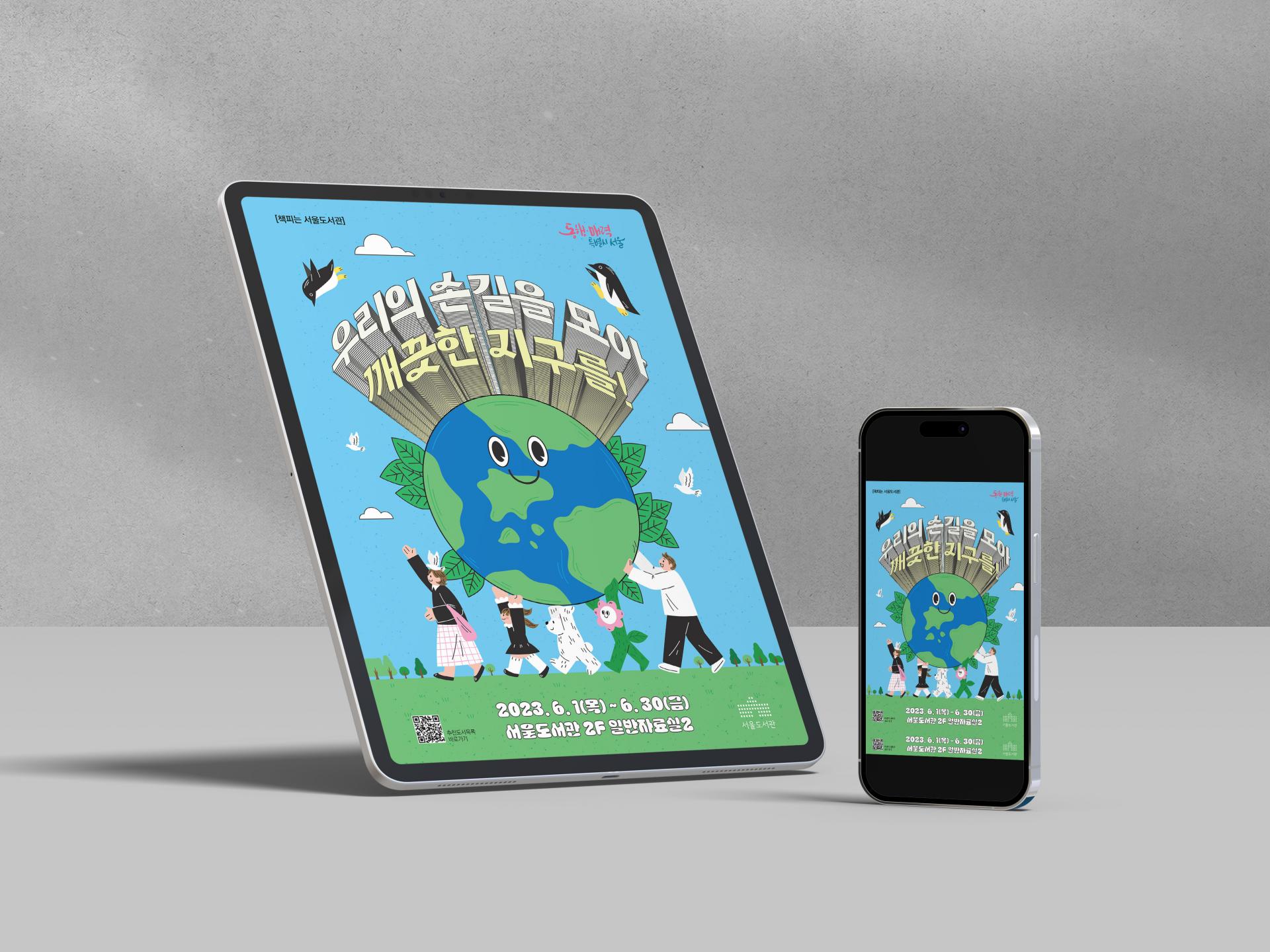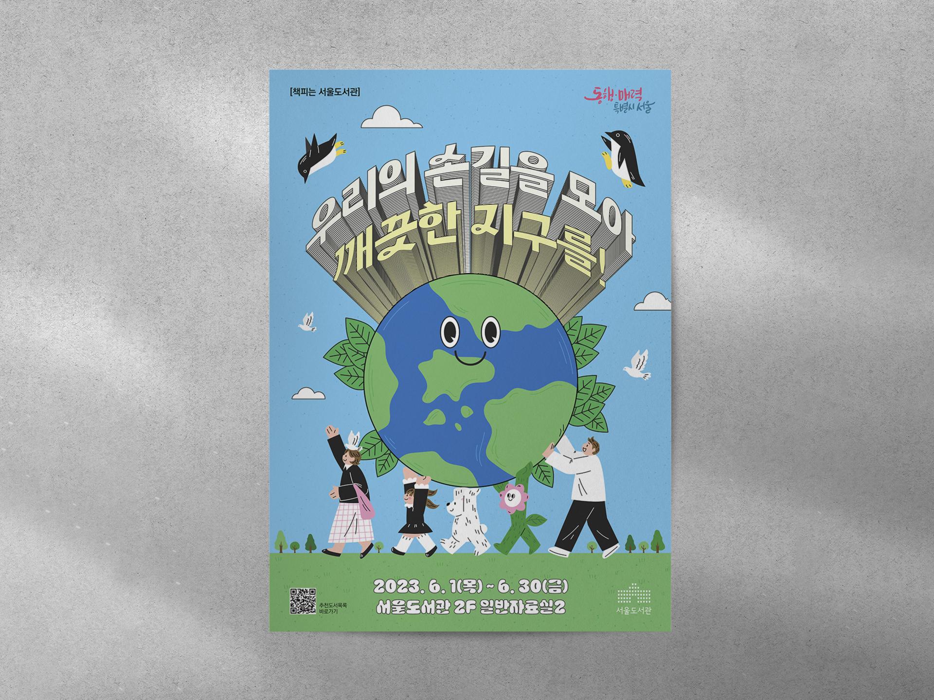 서울도서관에서 매월 진행하는 북큐레이션 전시 중 6월의 메인 비주얼입니다. 제목에 입체/왜곡 효과를 적용해 캠페인에 어울리는 밝고 액티브한 분위기를 살리고, 사람들이 지구를 받치고 나아가는 메인 이미지 구성으로 주제 워딩을 그대로 구현했습니다. 중요한 요소에만 외곽선을 적용해 더 돋보이게 만든 시원한 색과 레이아웃의 포스터입니다.