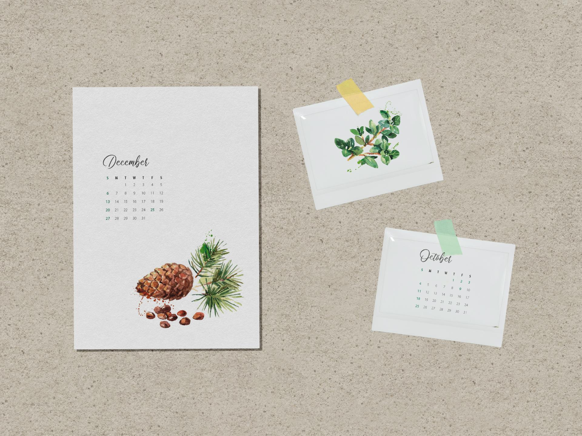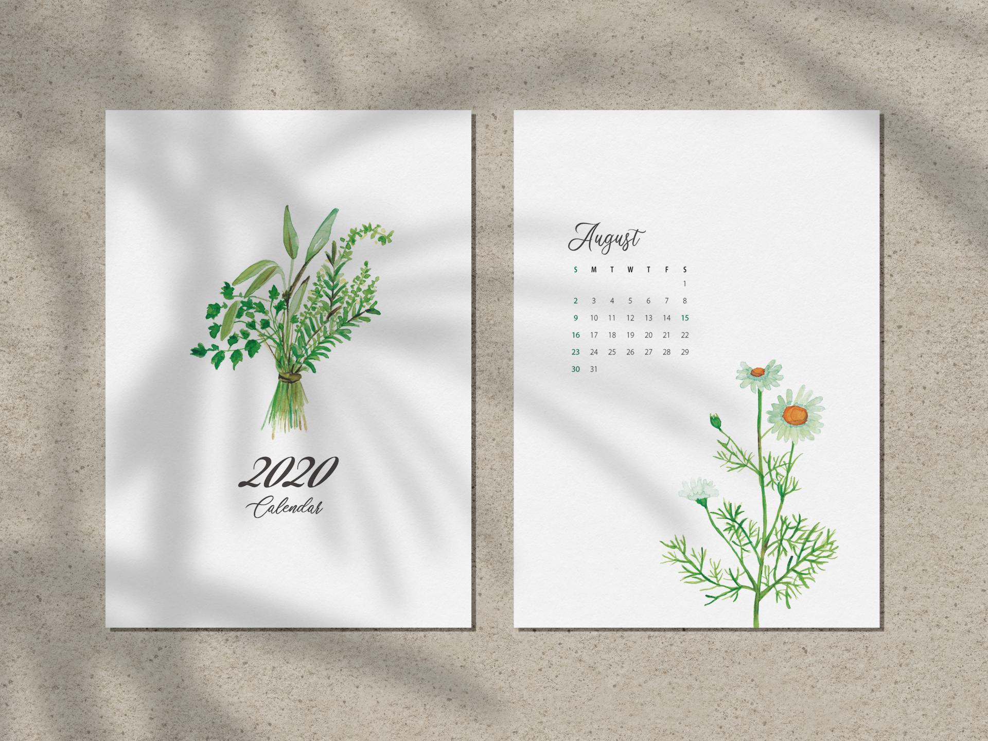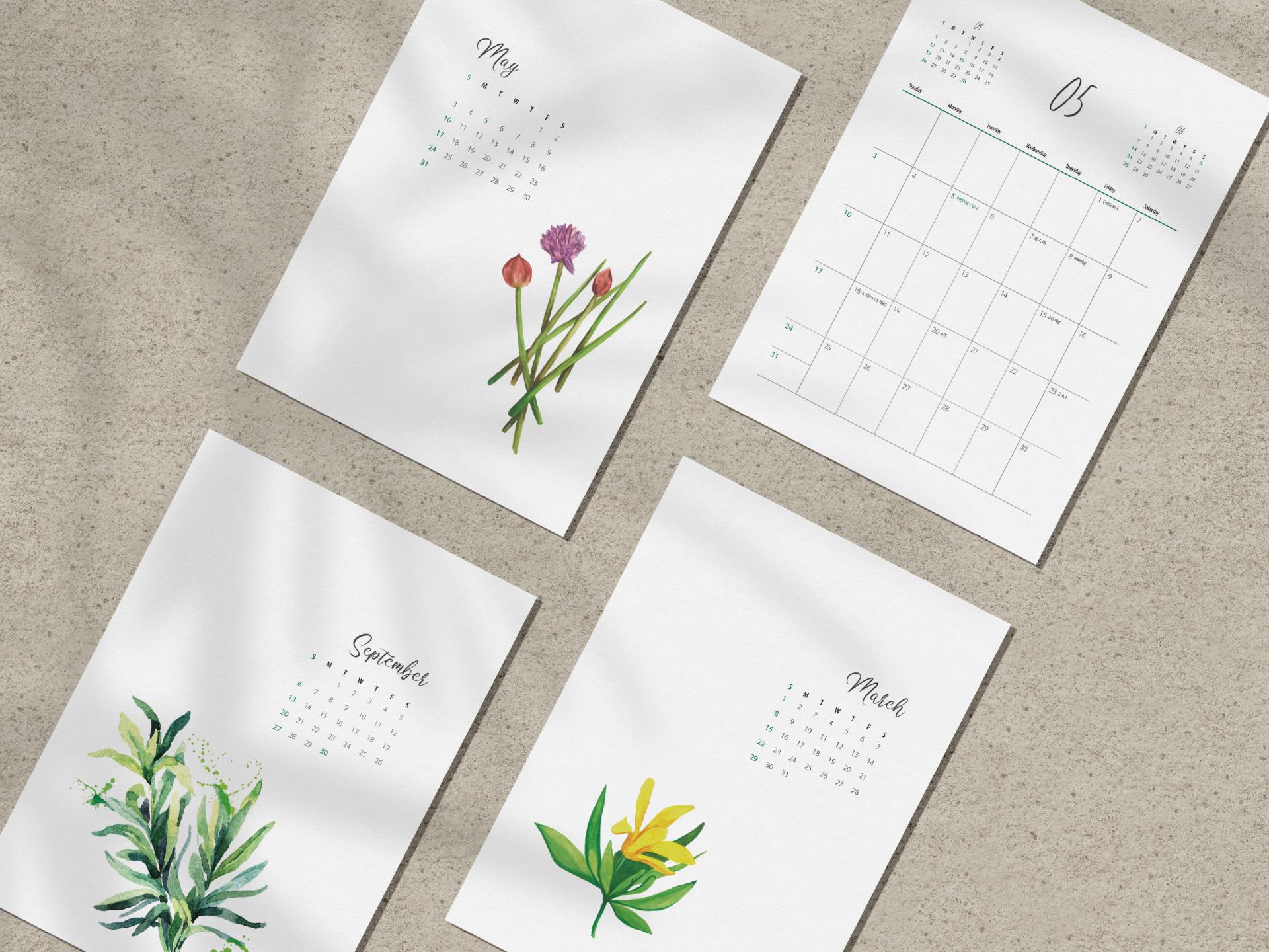 허브들의 섬세한 라인과 색감을 그린 일러스트 캘린더입니다. 수채화 기법으로 직접 그린 허브 일러스트를 캘린더 메인 삽화로 사용하고, 부드러운 캘리그라피를 사용한 월 타이틀과 여백을 활용한 레이아웃 디자인은 깔끔하고 감성적인 느낌을 줍니다.